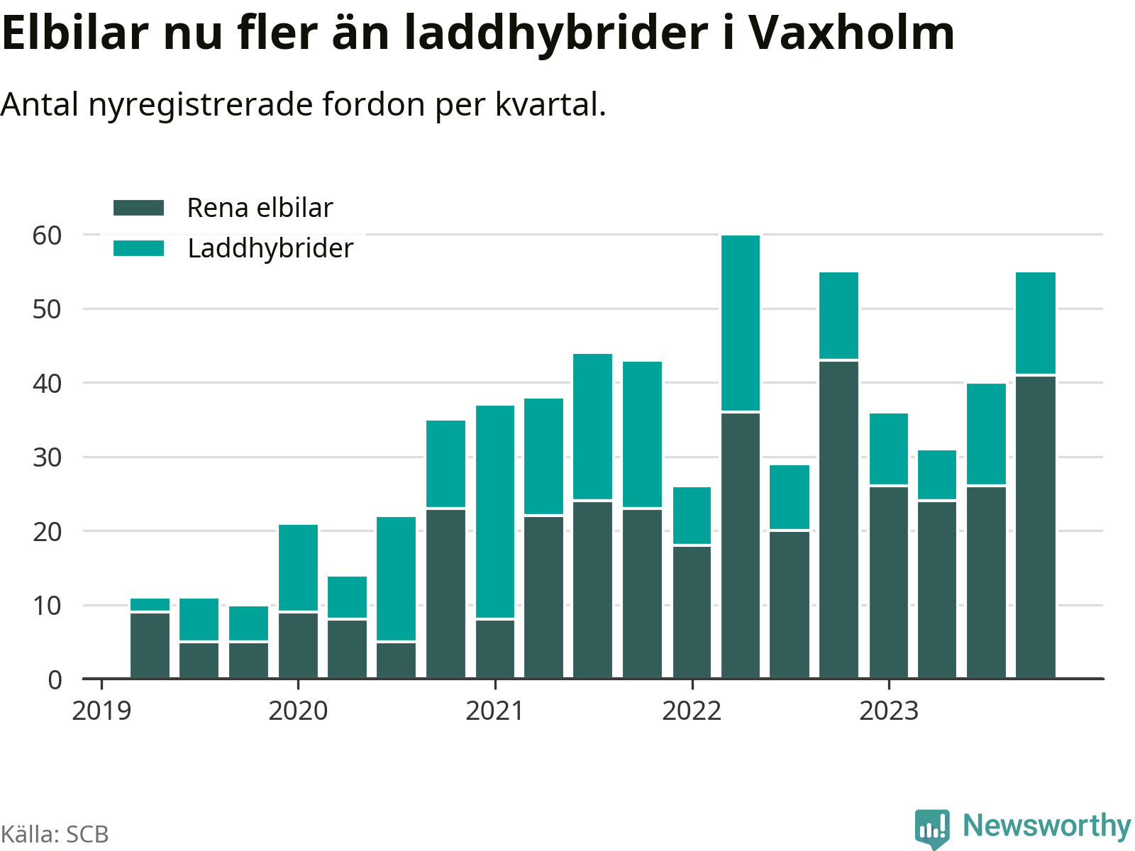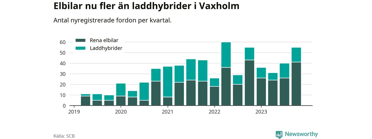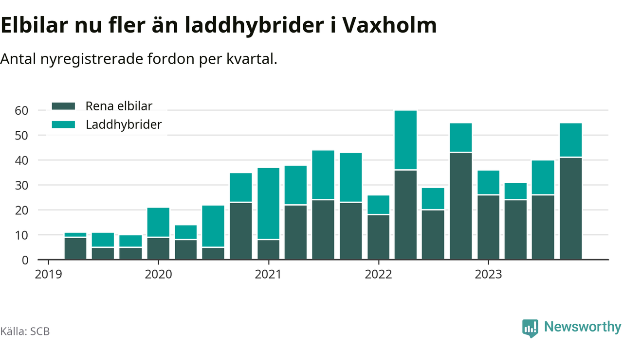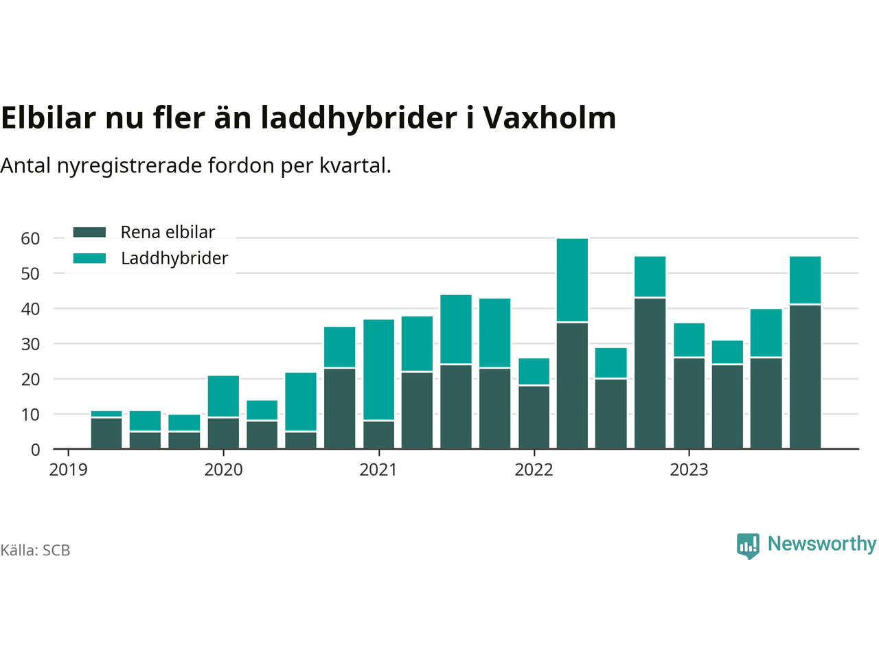 Men i Vaxholm noterades ett nytt rekord under fjärde kvartalet. Aldrig tidigare har laddbara bilar utgjort en så stor del av alla nya bilar.