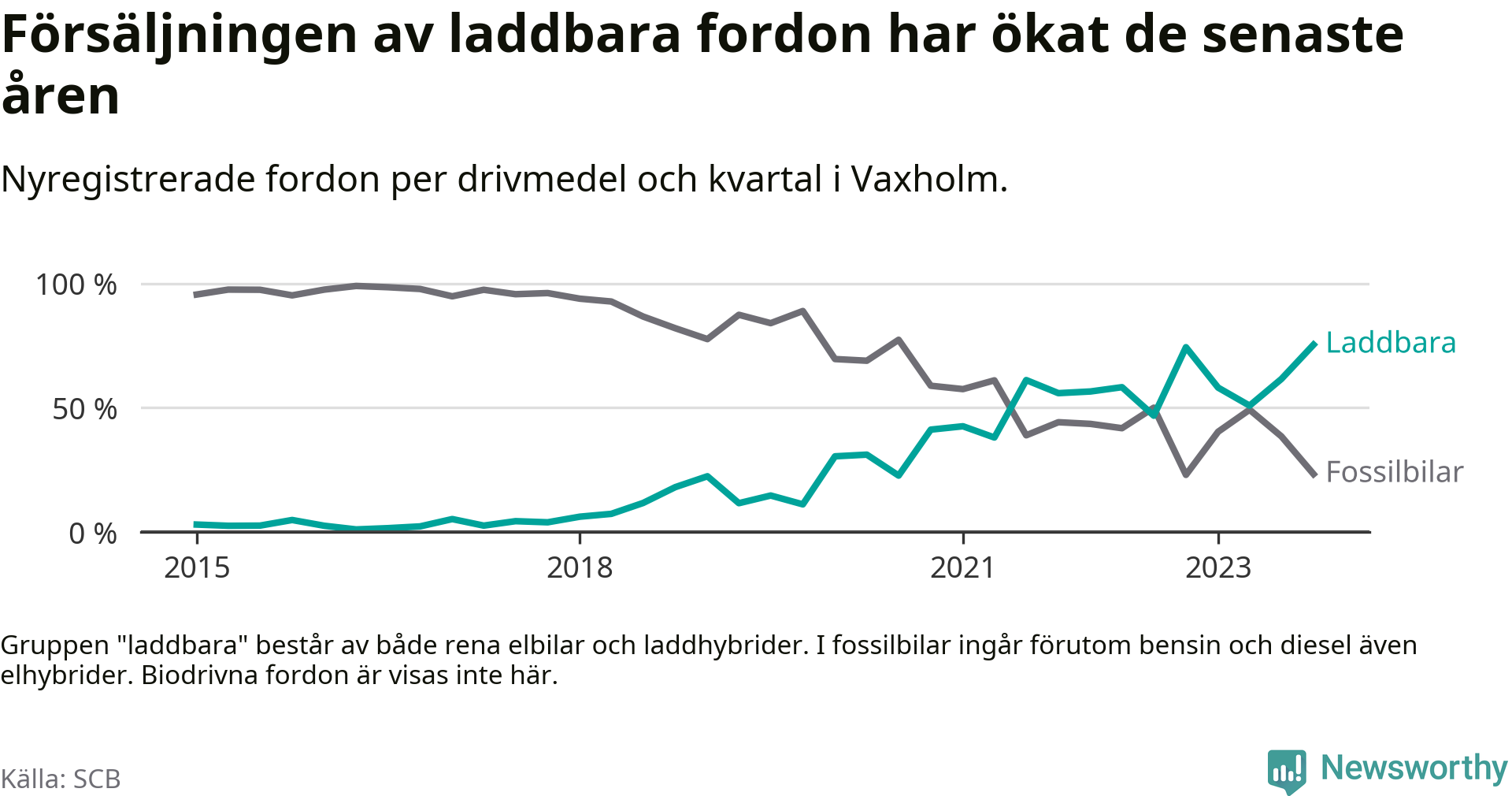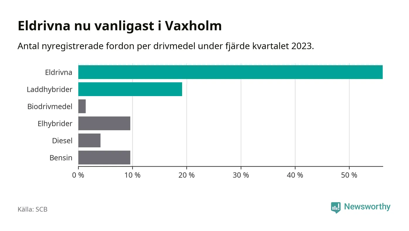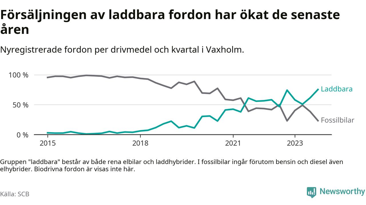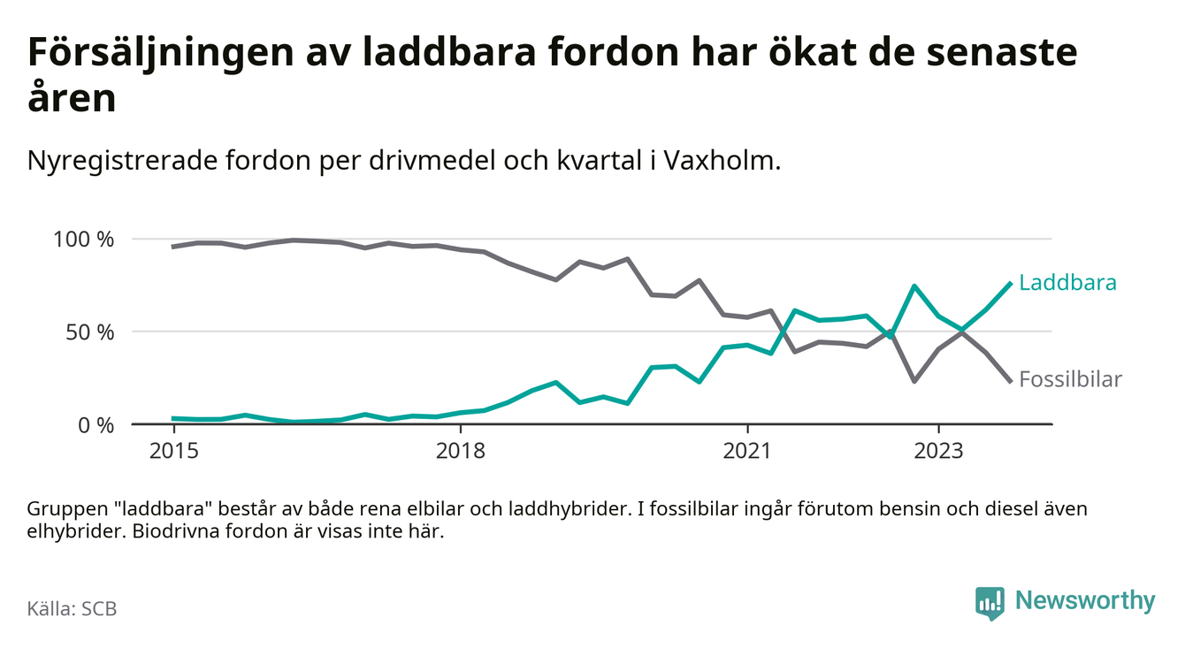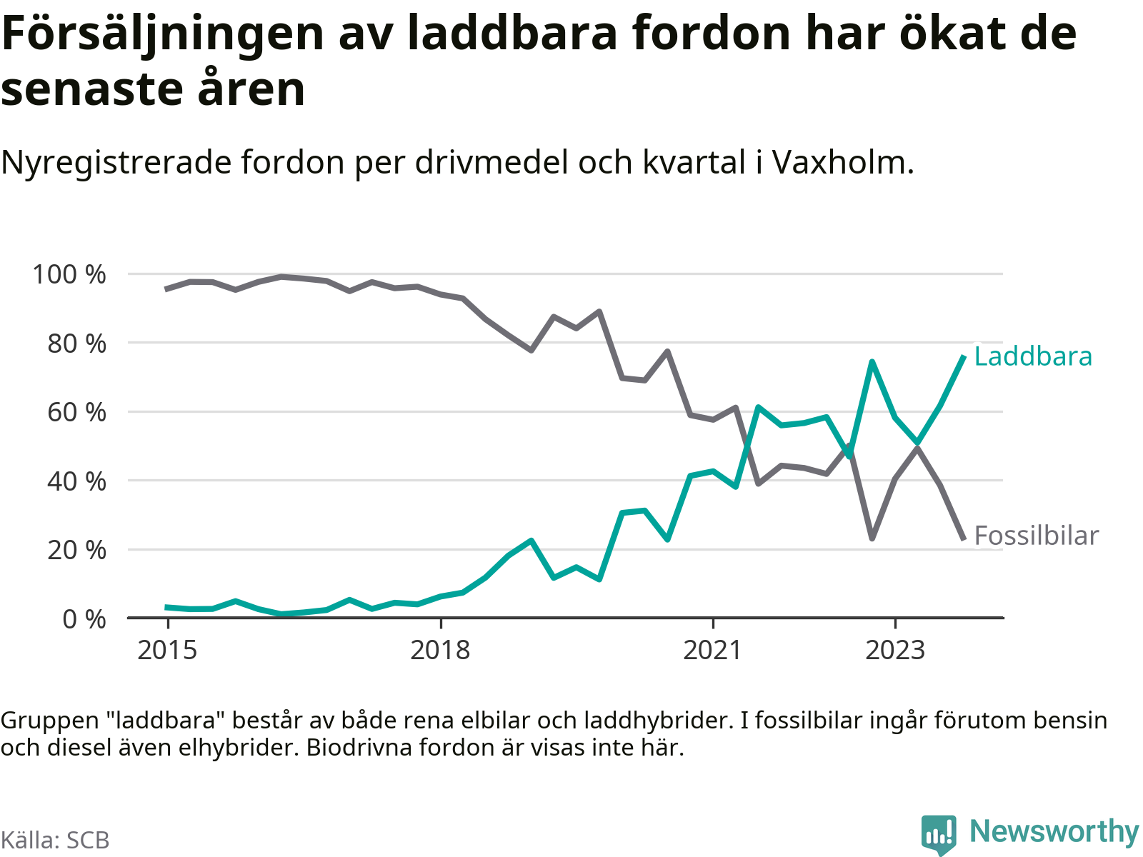 Under fjärde kvartalet 2023 var 75 procent av alla nyregistrerade personbilar i Vaxholm laddbara (sammanlagt registrerades 73 nya bilar). Merparten av de laddbara bilarna var rena elbilar (56 procent av alla).