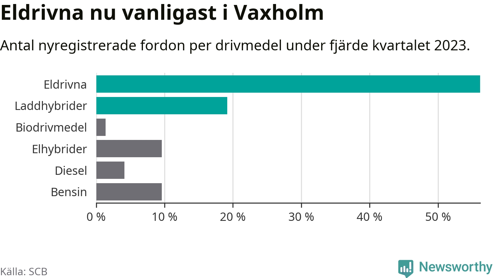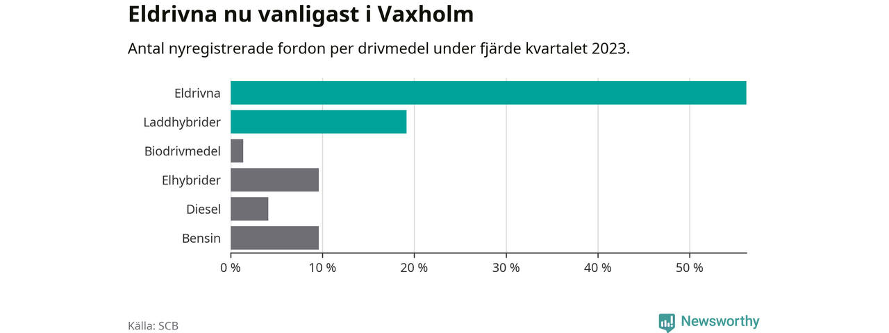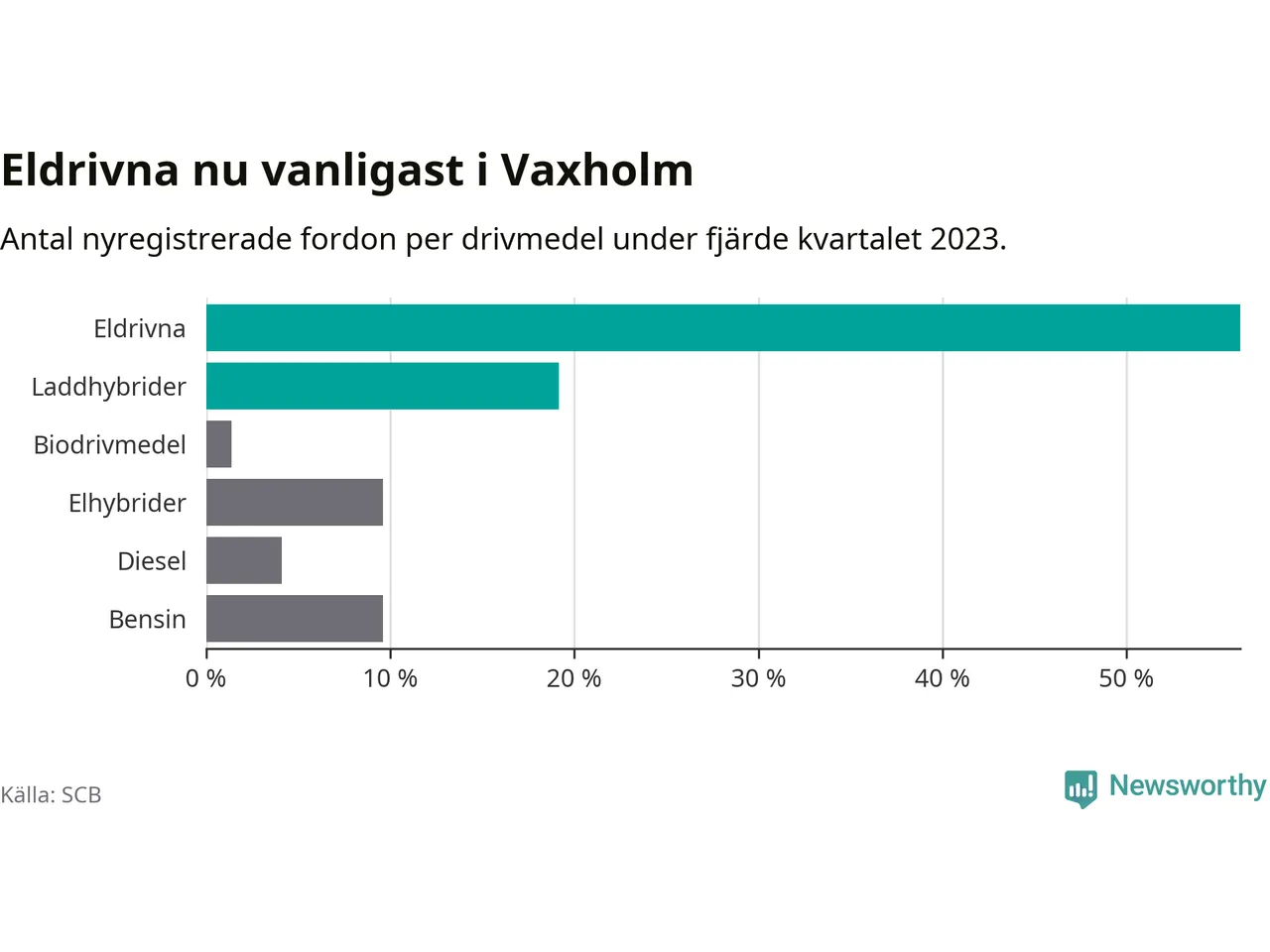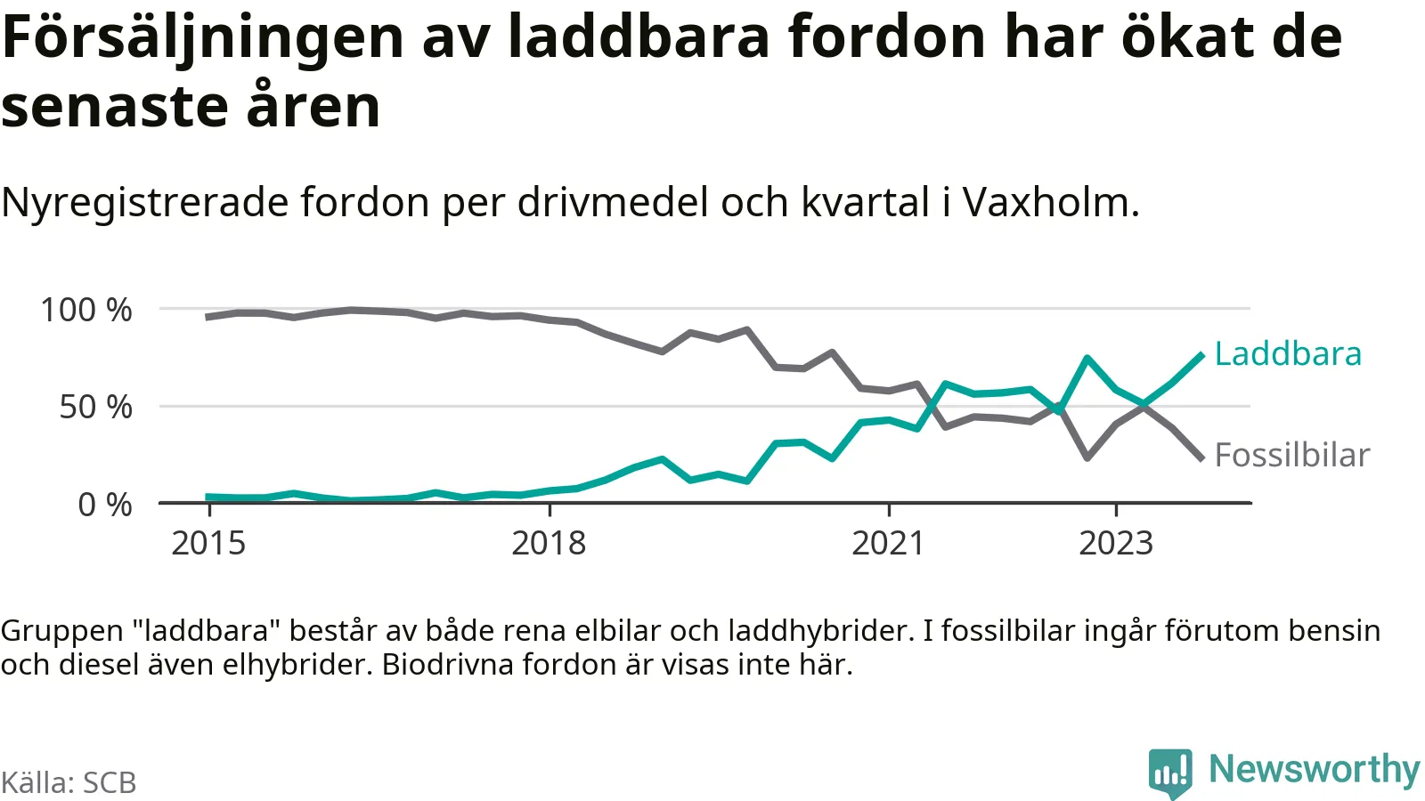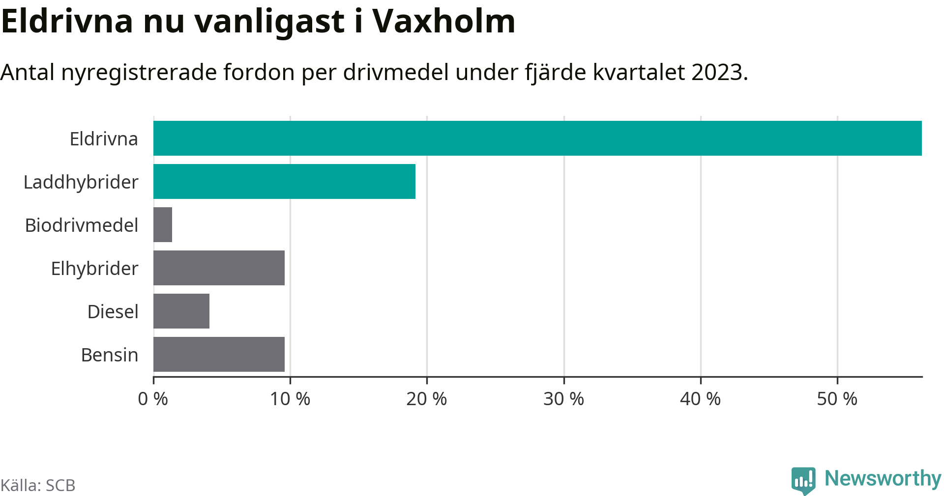 Under fjärde kvartalet 2023 var 75 procent av alla nyregistrerade personbilar i Vaxholm laddbara (sammanlagt registrerades 73 nya bilar). Merparten av de laddbara bilarna var rena elbilar (56 procent av alla).