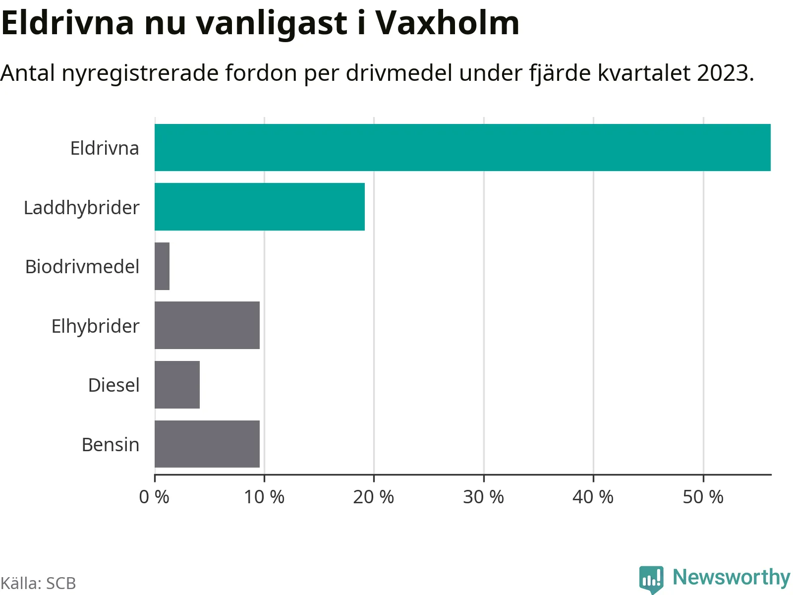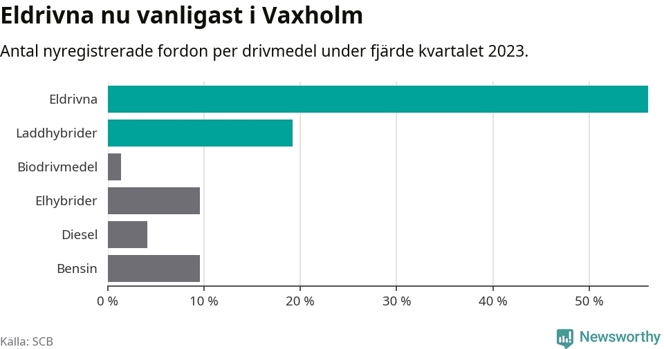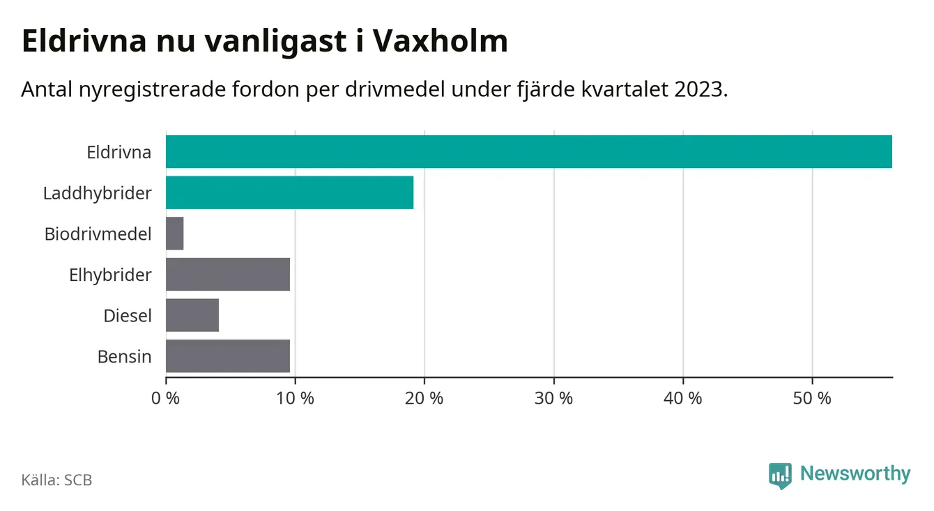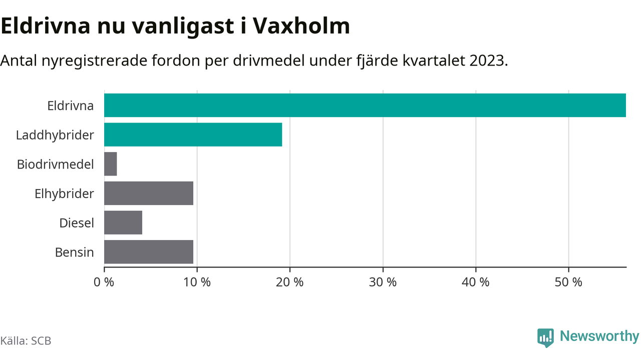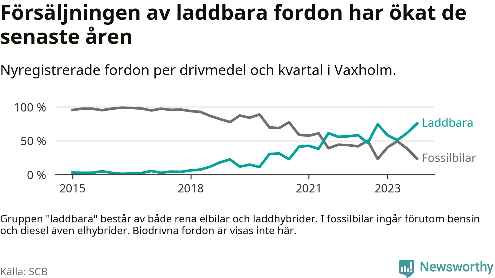 Under fjärde kvartalet 2023 var 75 procent av alla nyregistrerade personbilar i Vaxholm laddbara (sammanlagt registrerades 73 nya bilar). Merparten av de laddbara bilarna var rena elbilar (56 procent av alla).