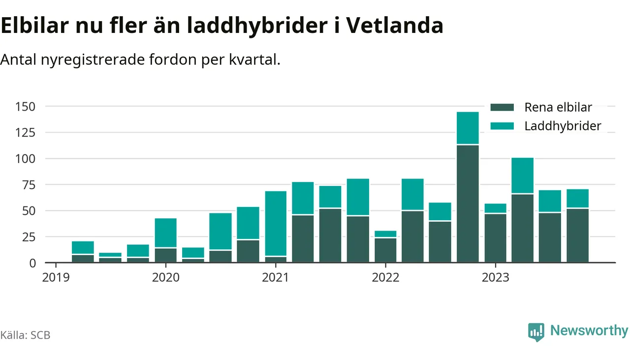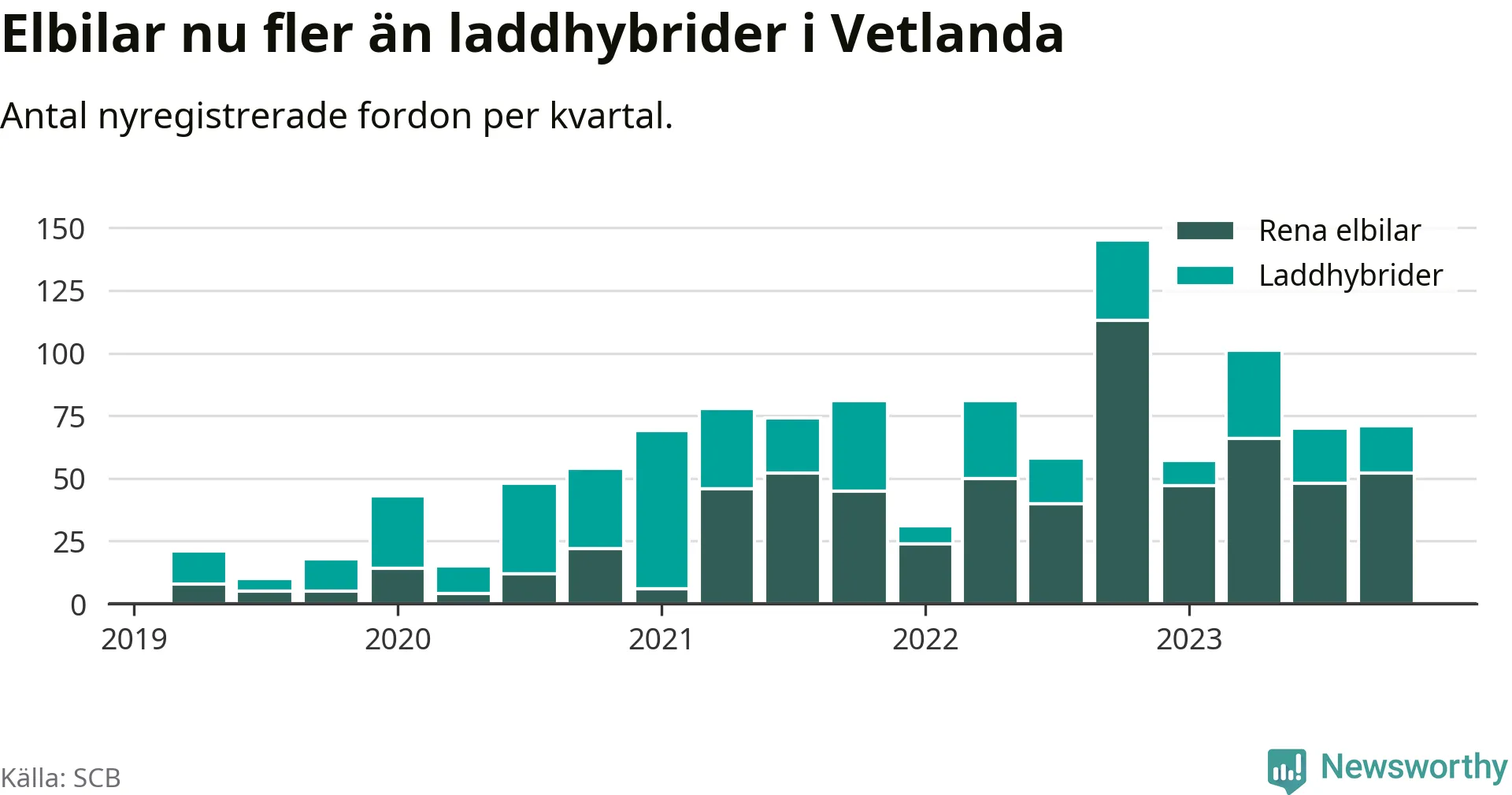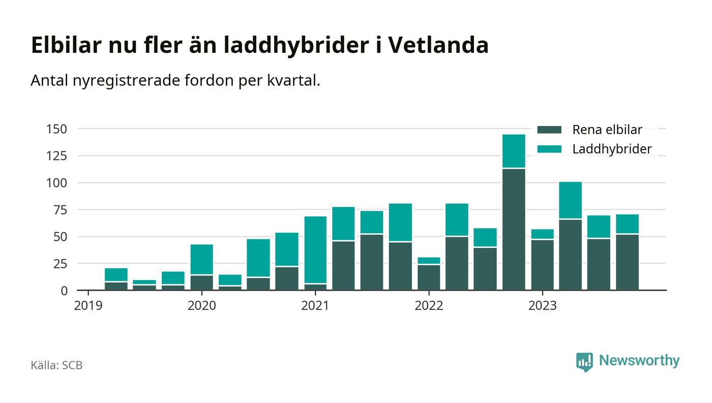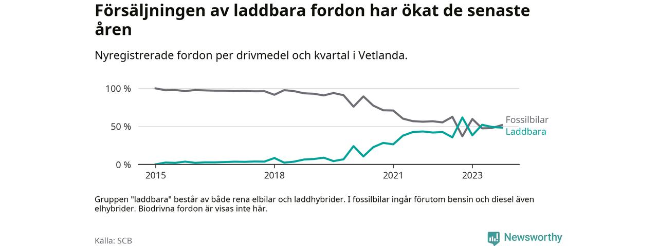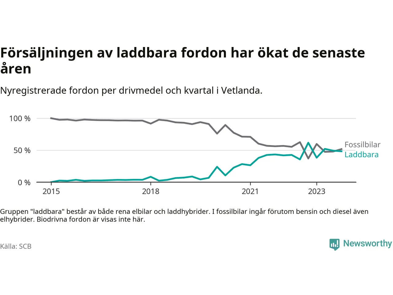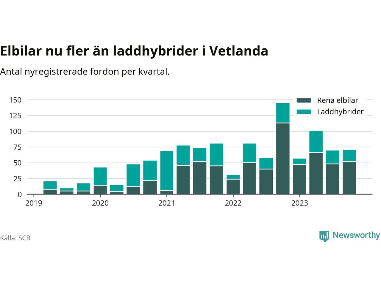 Under fjärde kvartalet 2023 var 48 procent av alla nyregistrerade personbilar i Vetlanda laddbara (sammanlagt registrerades 147 nya bilar). Merparten av de laddbara bilarna var rena elbilar (35 procent av alla).