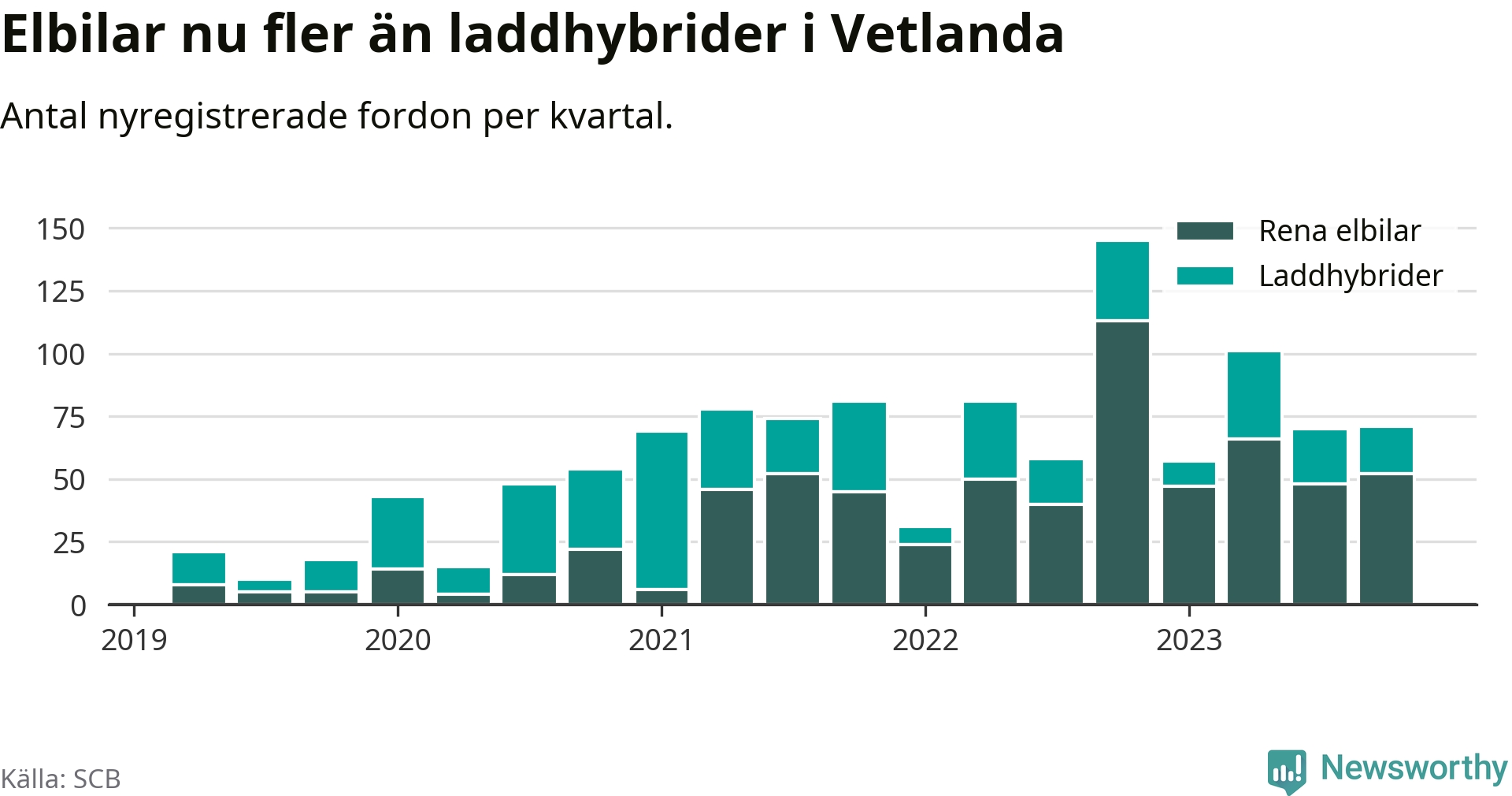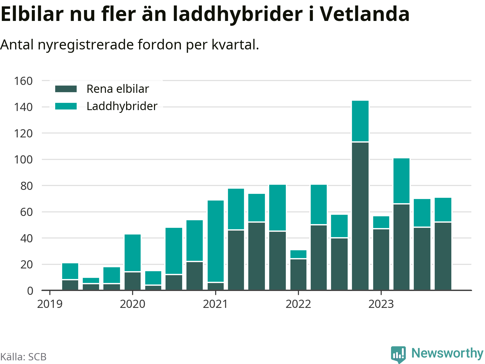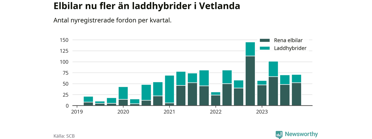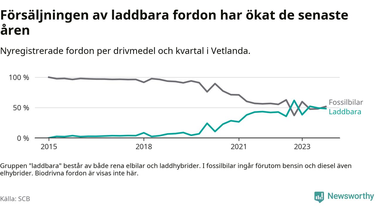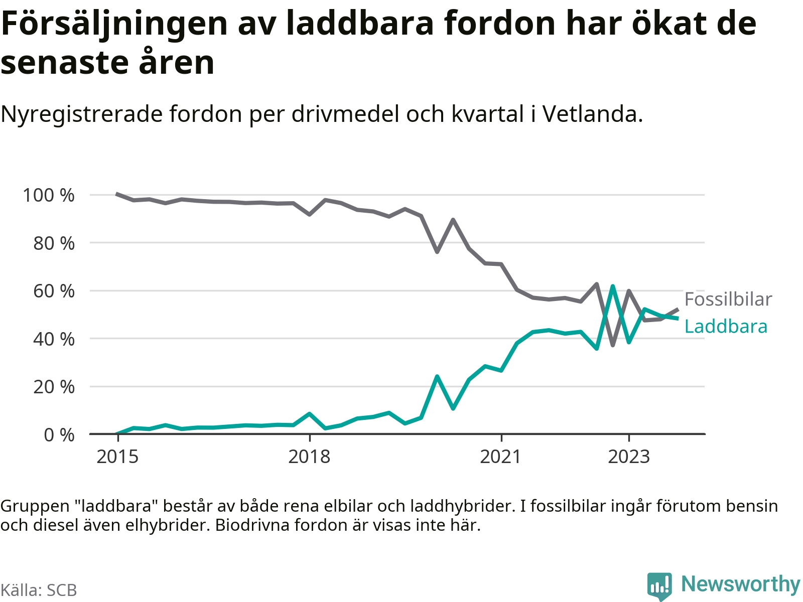 Under fjärde kvartalet 2023 var 48 procent av alla nyregistrerade personbilar i Vetlanda laddbara (sammanlagt registrerades 147 nya bilar). Merparten av de laddbara bilarna var rena elbilar (35 procent av alla).