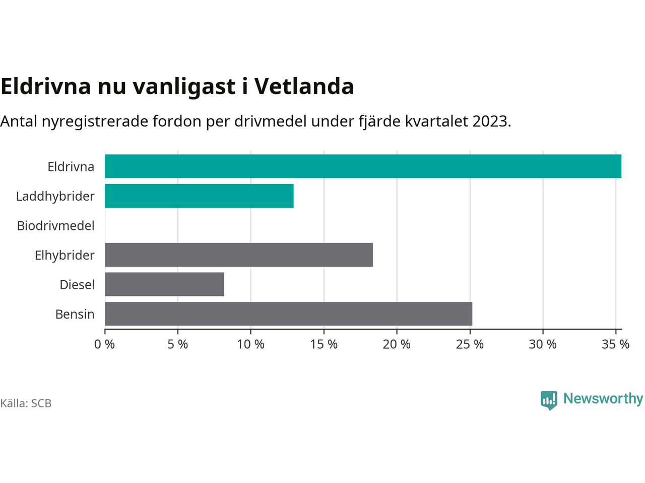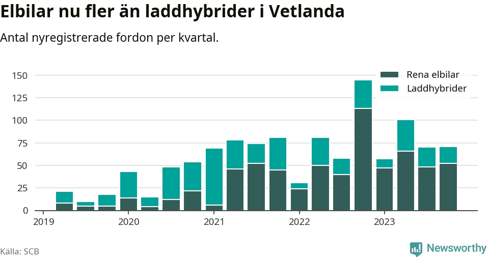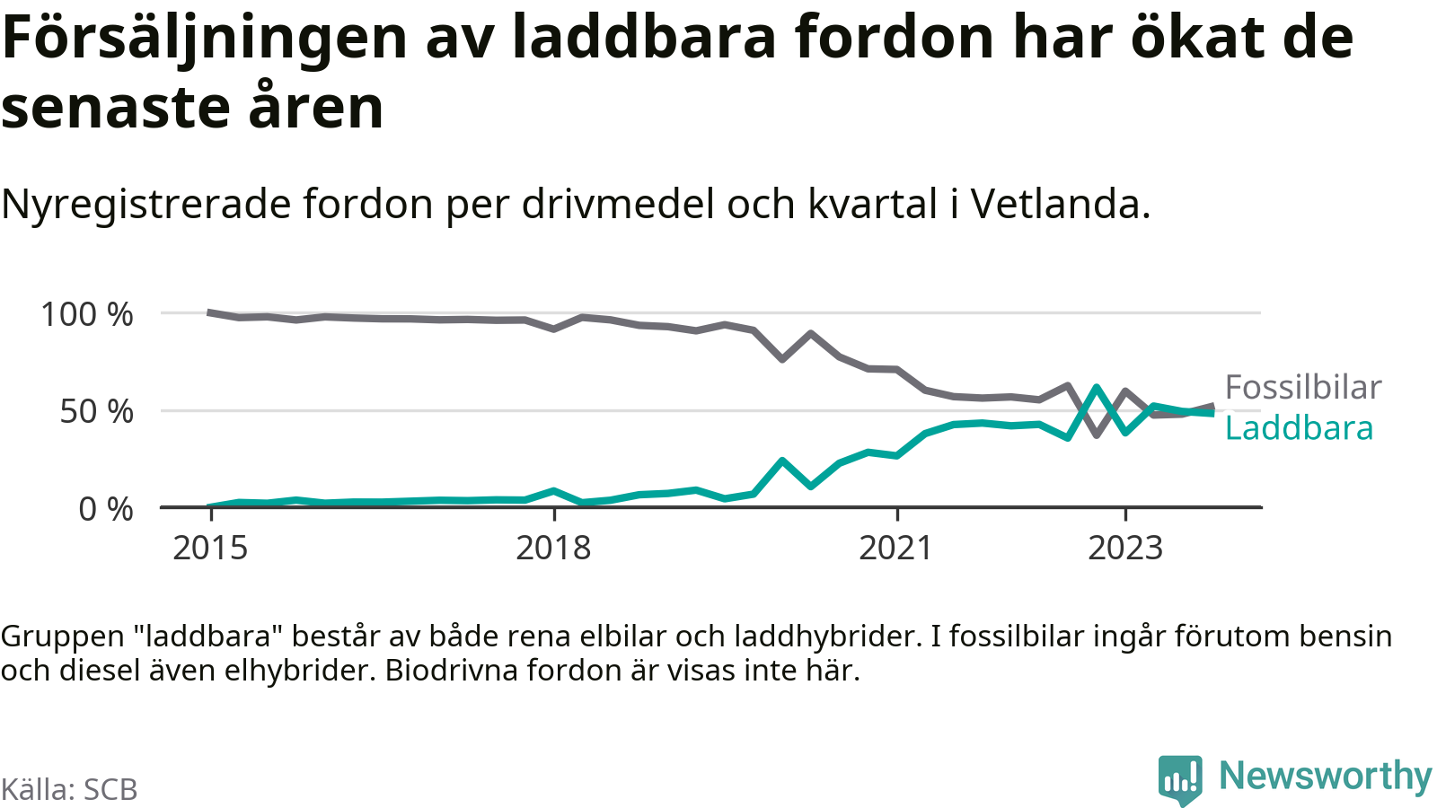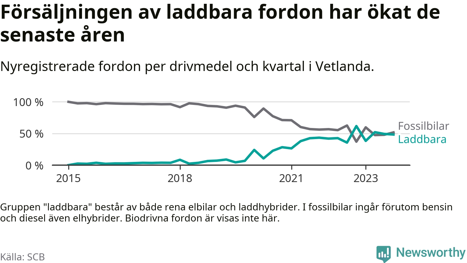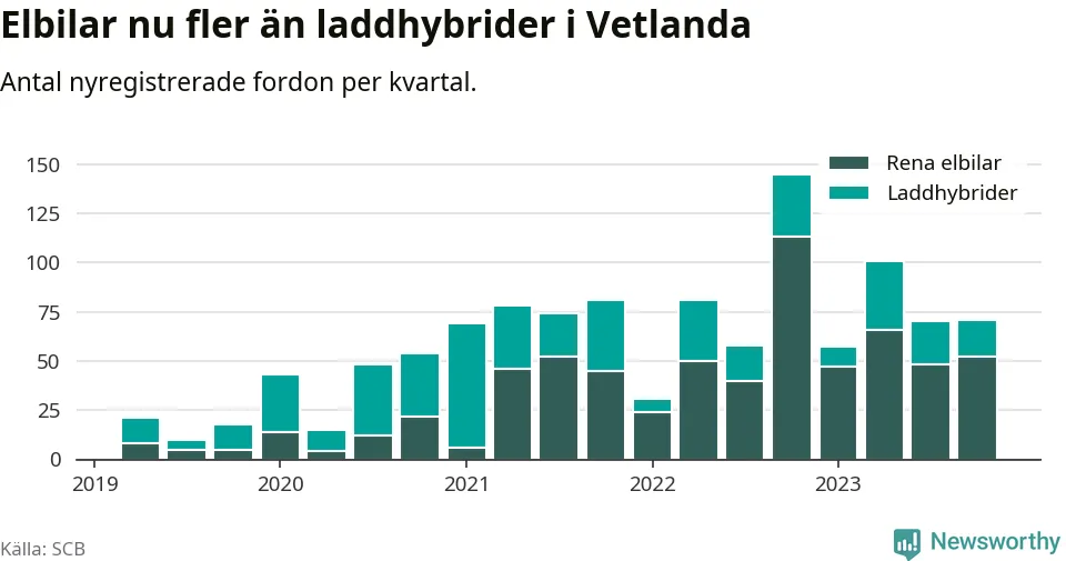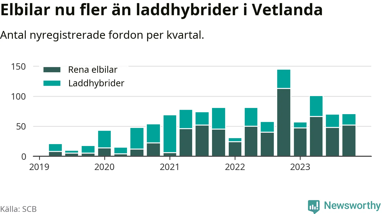 Under fjärde kvartalet 2023 var 48 procent av alla nyregistrerade personbilar i Vetlanda laddbara (sammanlagt registrerades 147 nya bilar). Merparten av de laddbara bilarna var rena elbilar (35 procent av alla).