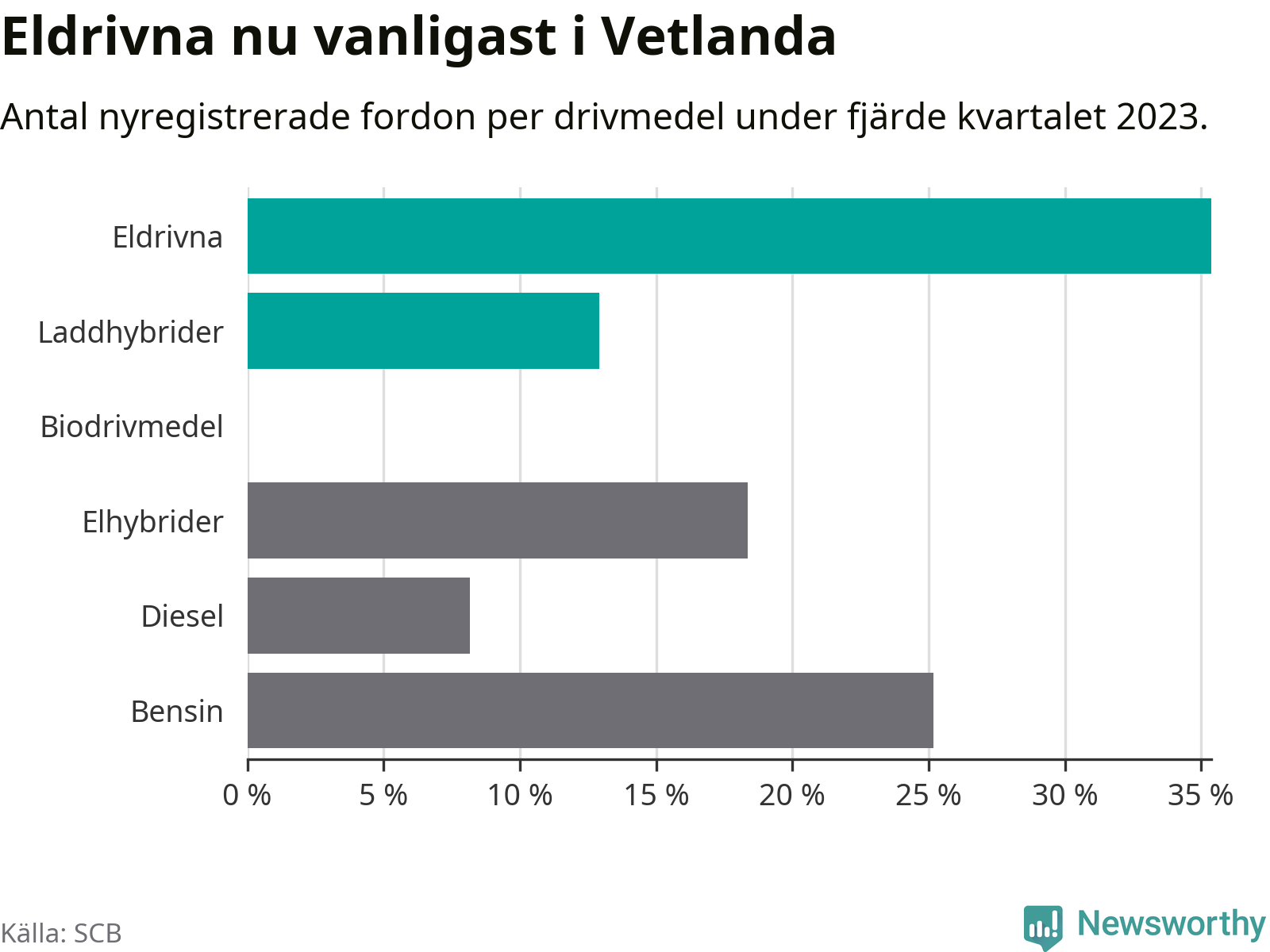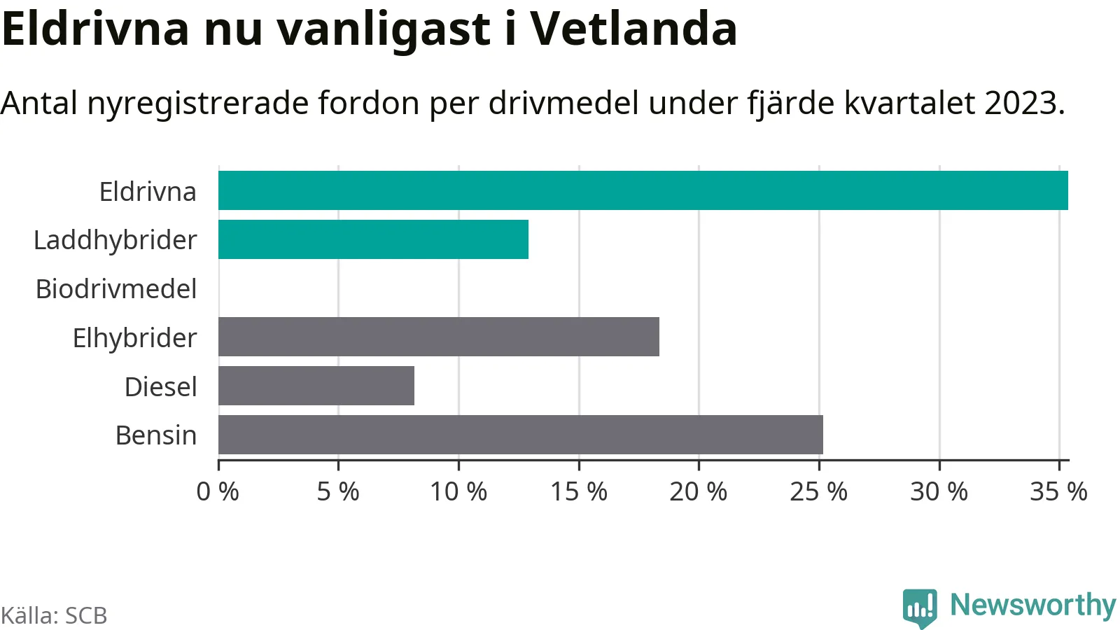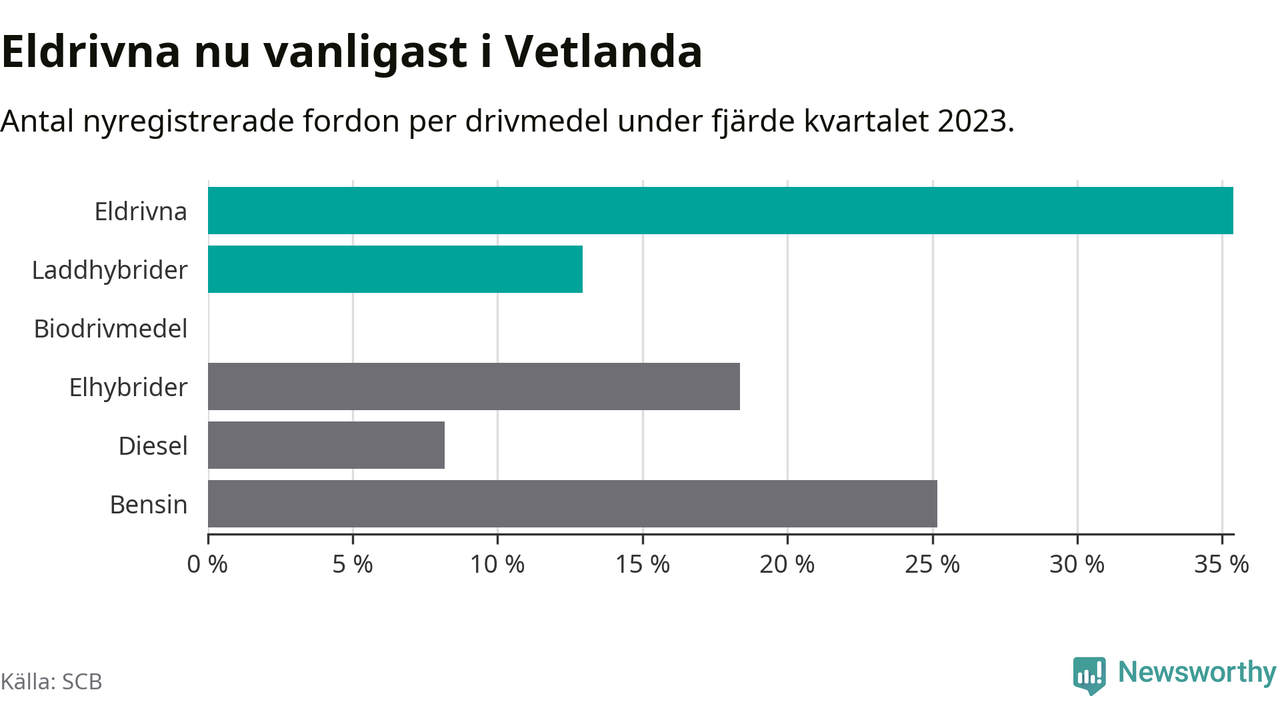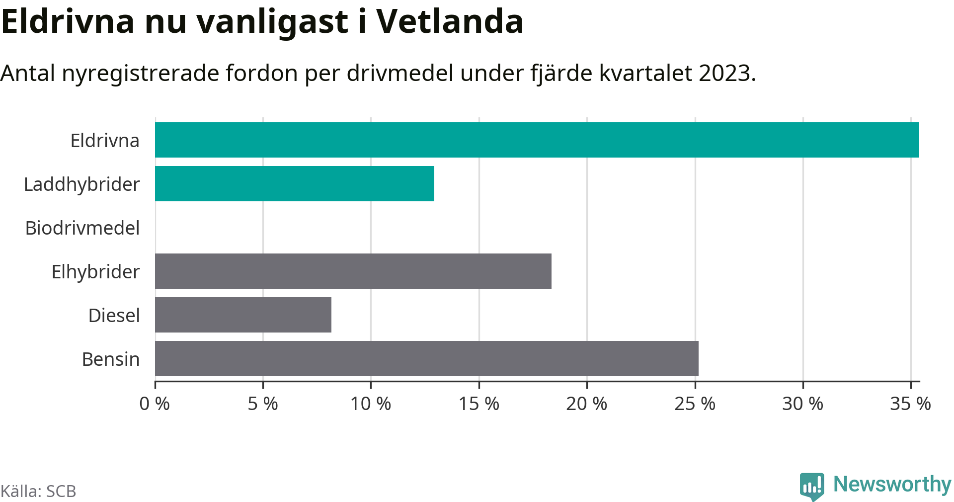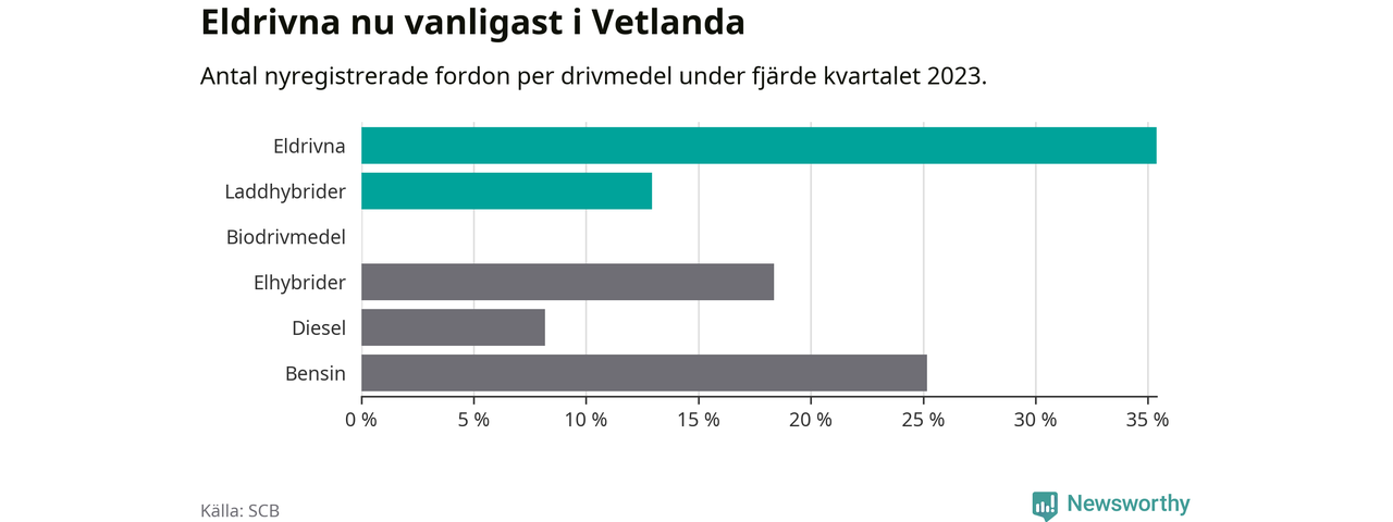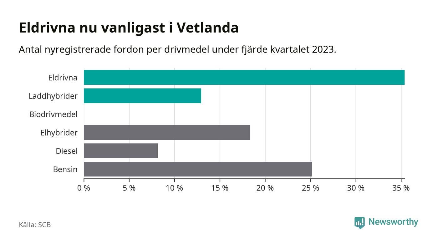 Under fjärde kvartalet 2023 var 48 procent av alla nyregistrerade personbilar i Vetlanda laddbara (sammanlagt registrerades 147 nya bilar). Merparten av de laddbara bilarna var rena elbilar (35 procent av alla).