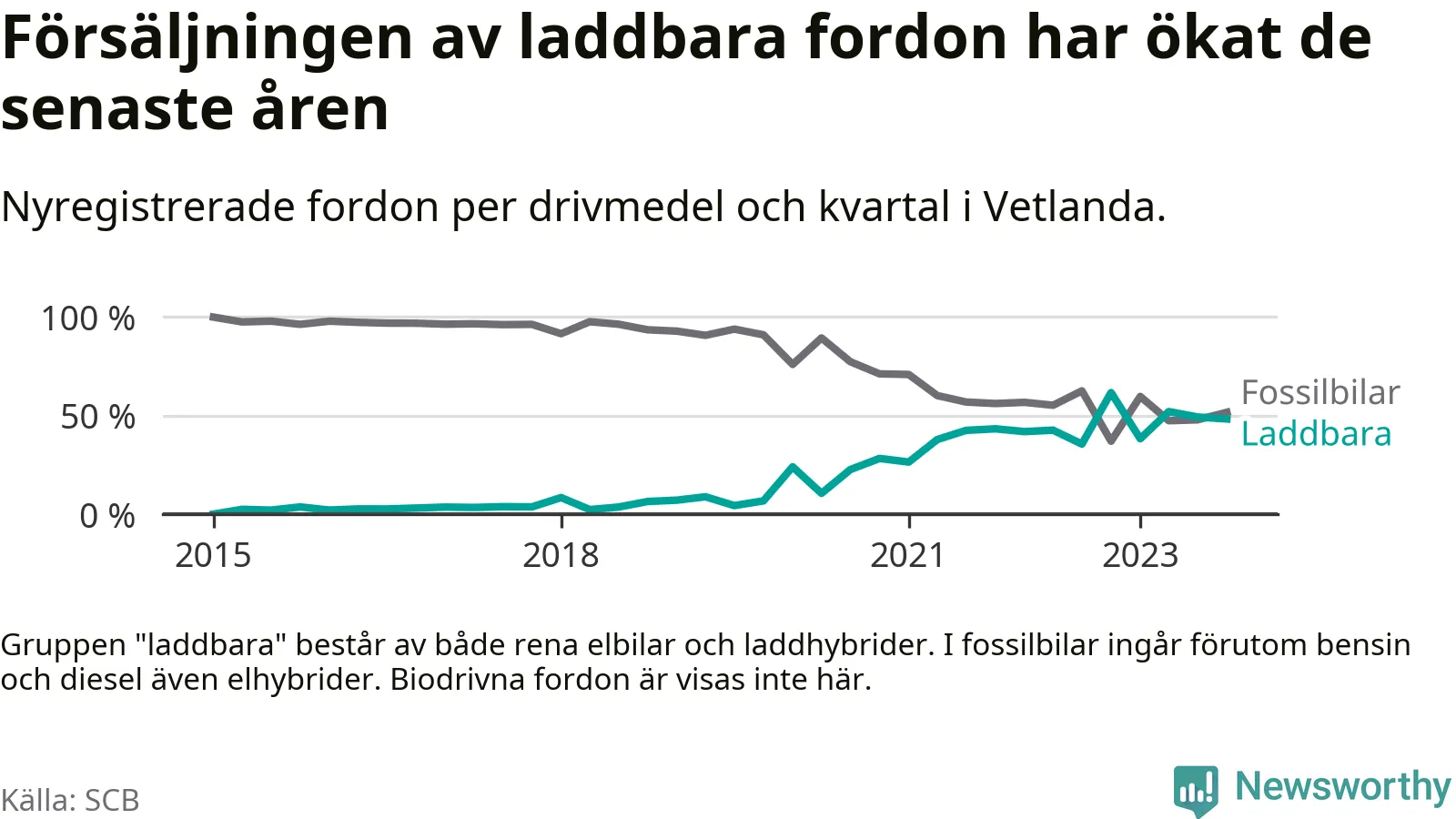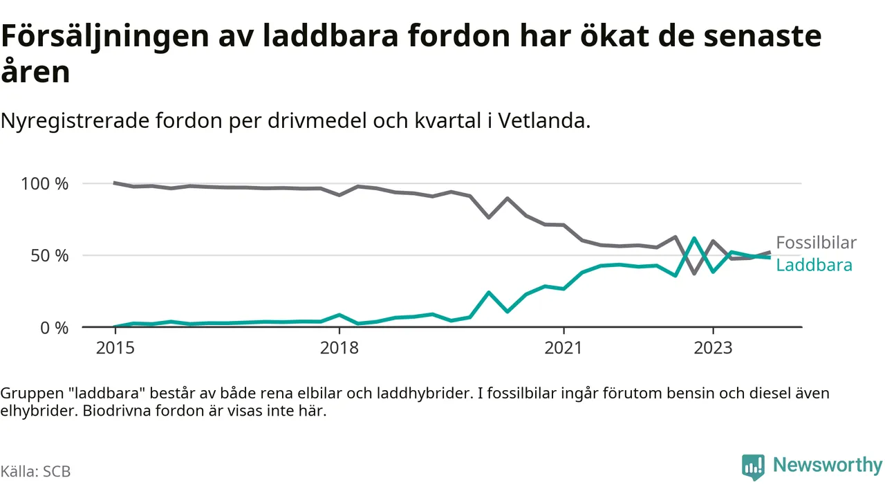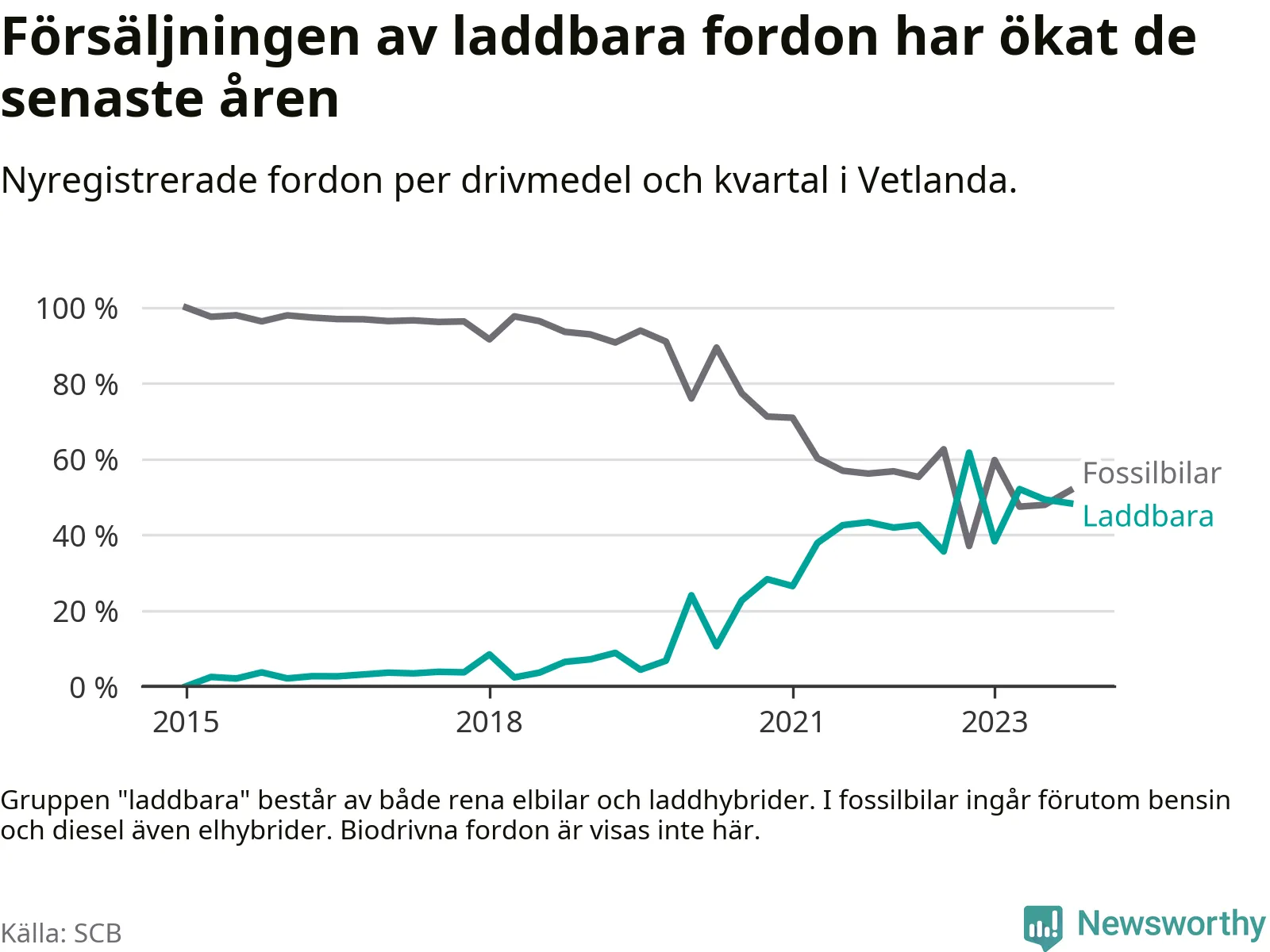 I Vetlanda var andelen laddbara bilar under fjärde kvartalet också lägre än under fjärde kvartalet 2022 då rekordet hittills noterades (62 procent).