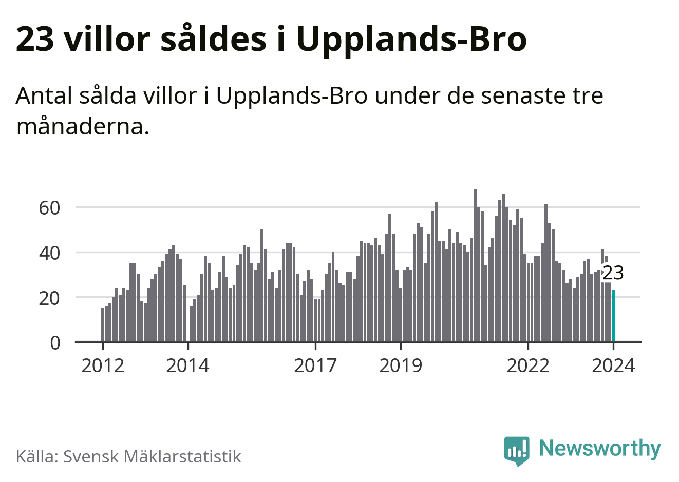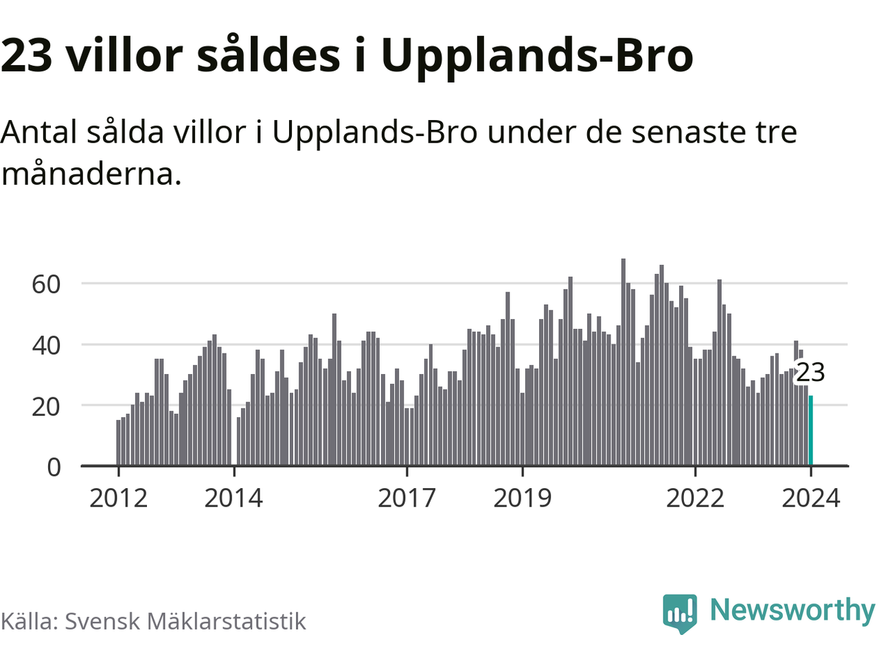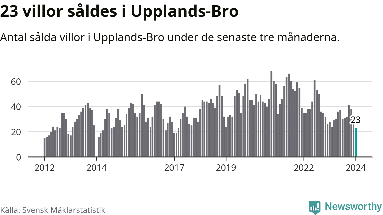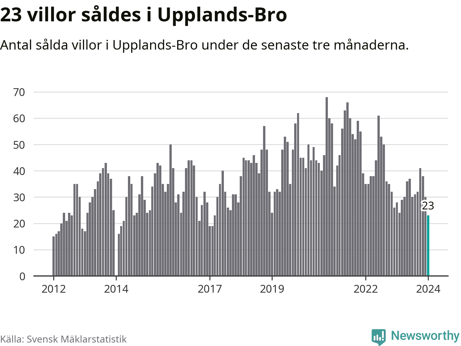 Mellan november och januari såldes 23 villor i Upplands-Bro kommun. Det är färre än någon tremånadersperiod sedan 2017.
