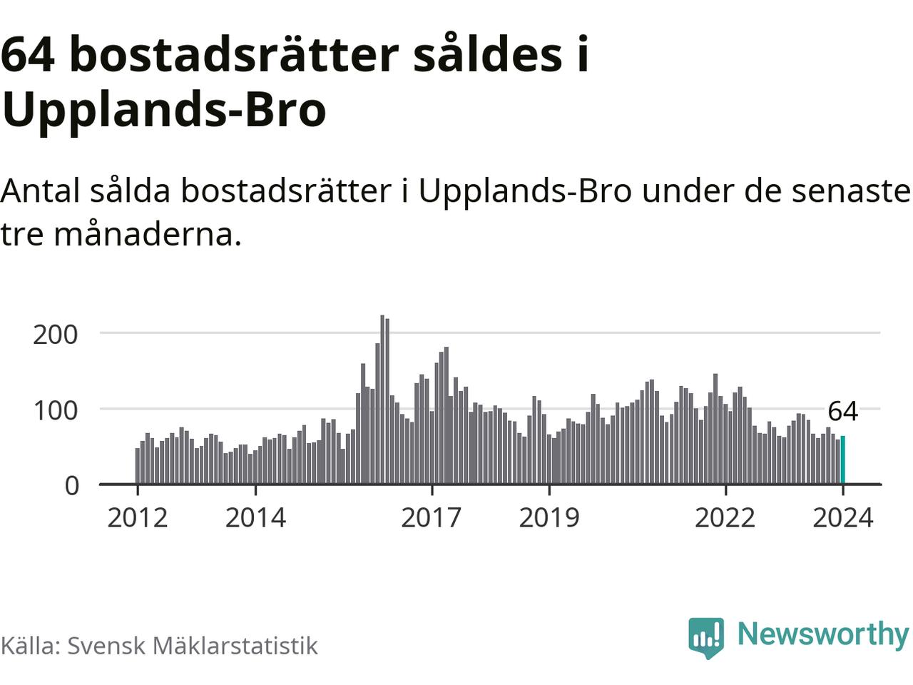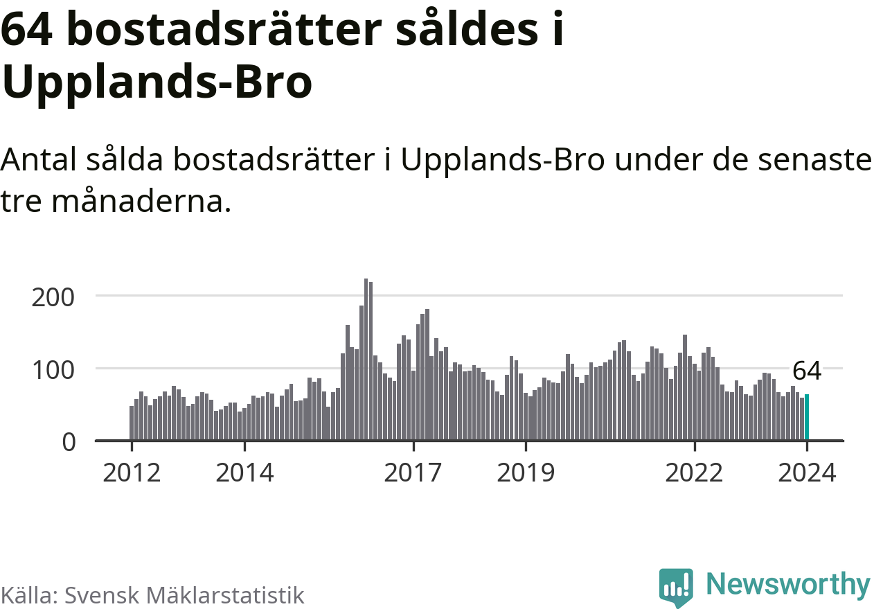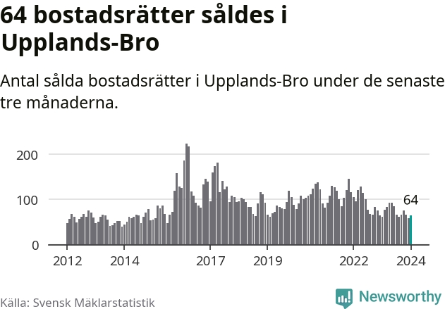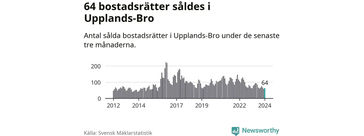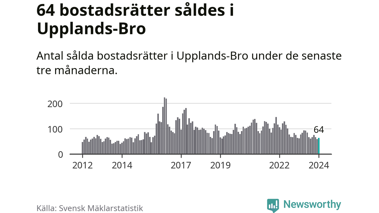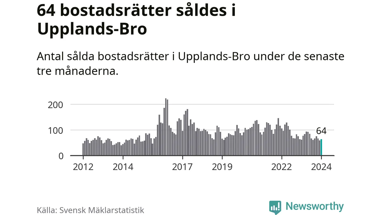 Sammanlagt såldes 64 bostadsrätter i Upplands-Bro kommun mellan november och januari till ett genomsnittligt pris på 2,1 miljoner kronor. I fjol gjordes 62 affärer vid den här tiden på året.