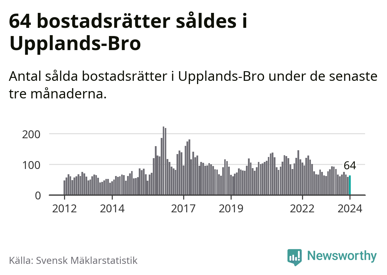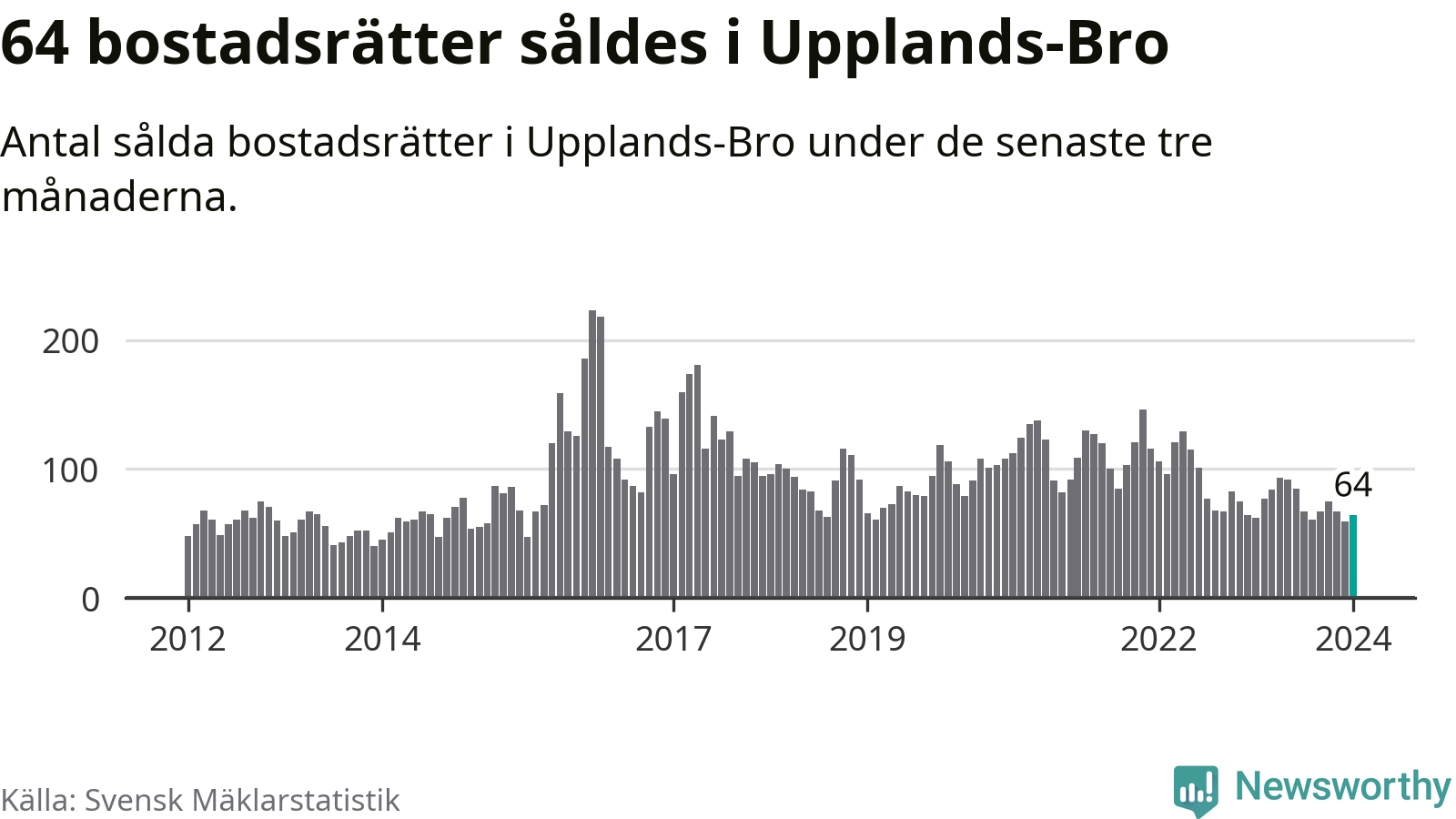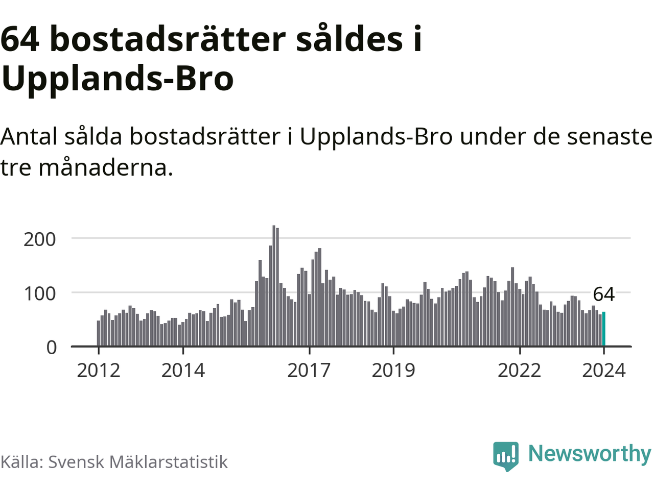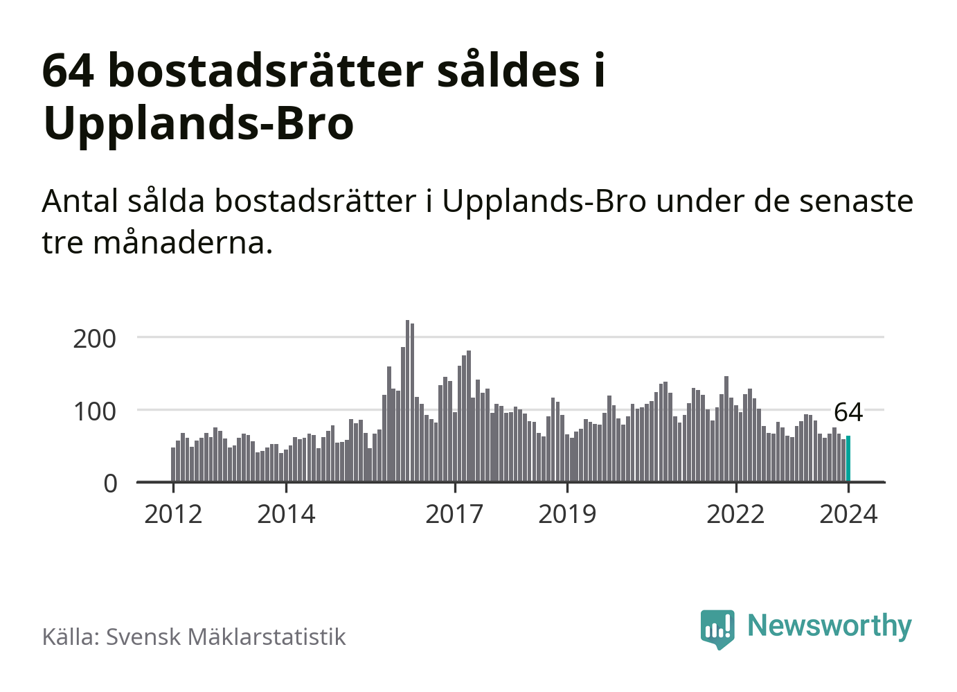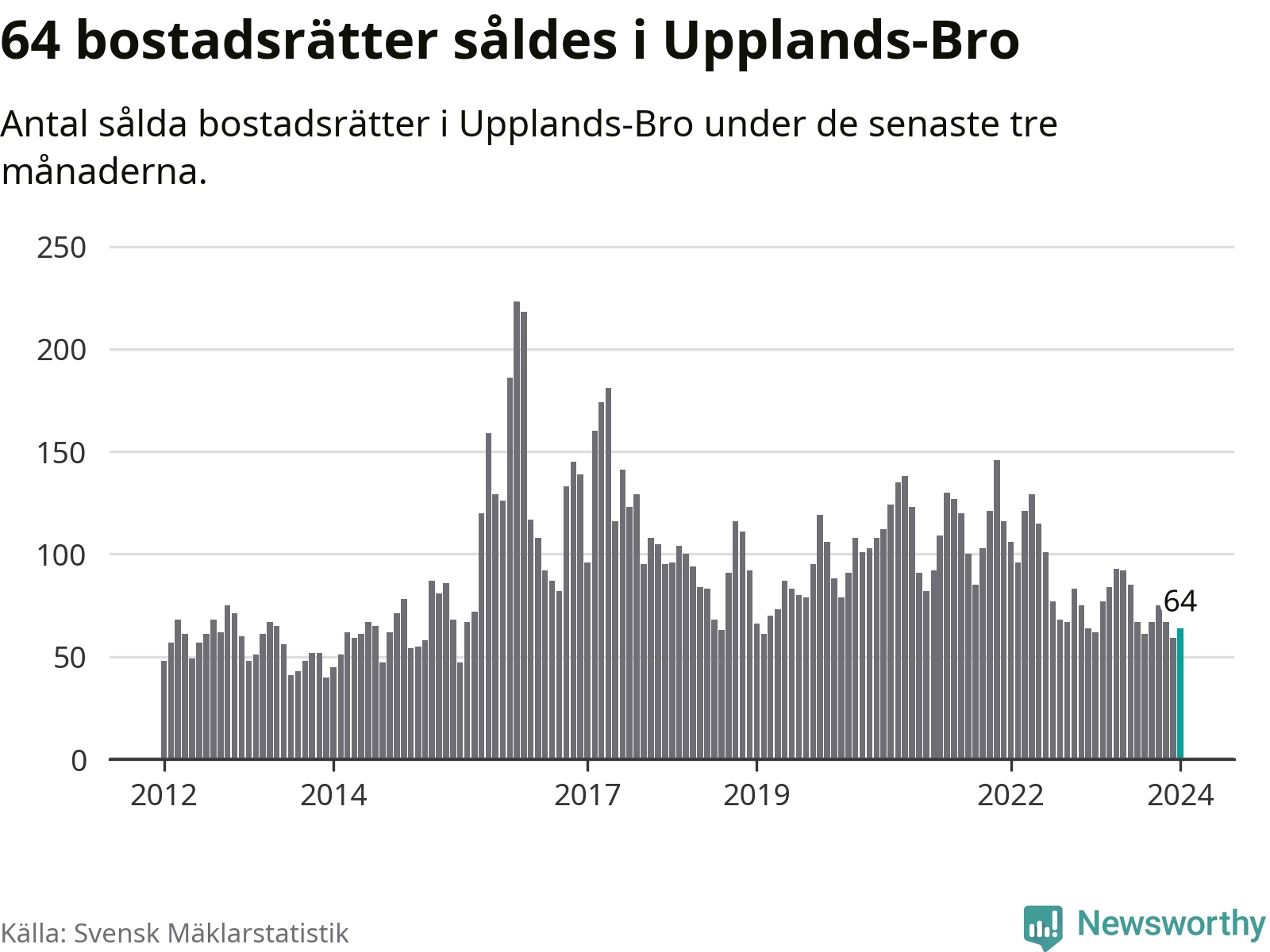 Sammanlagt såldes 64 bostadsrätter i Upplands-Bro kommun mellan november och januari till ett genomsnittligt pris på 2,1 miljoner kronor. I fjol gjordes 62 affärer vid den här tiden på året.