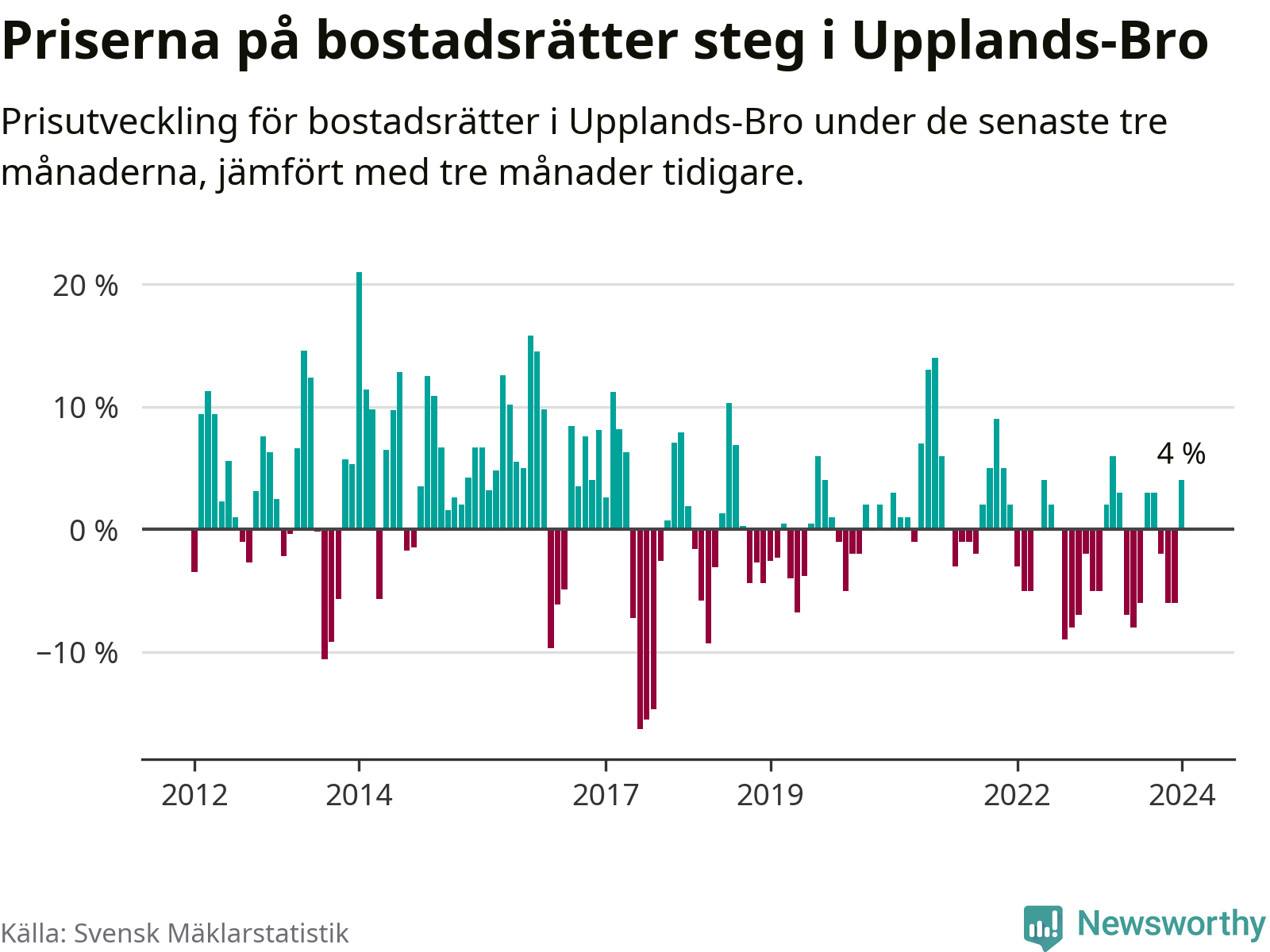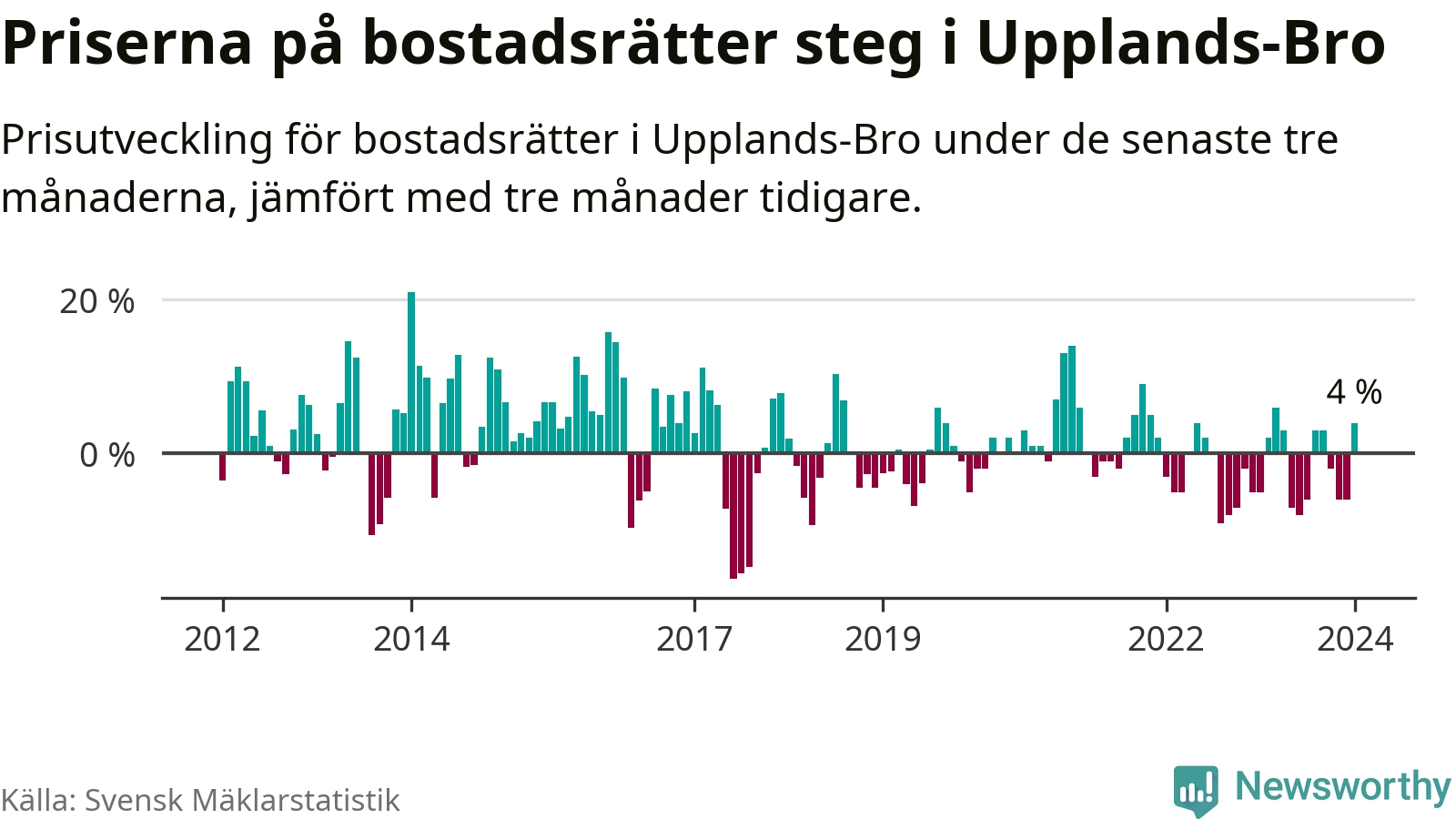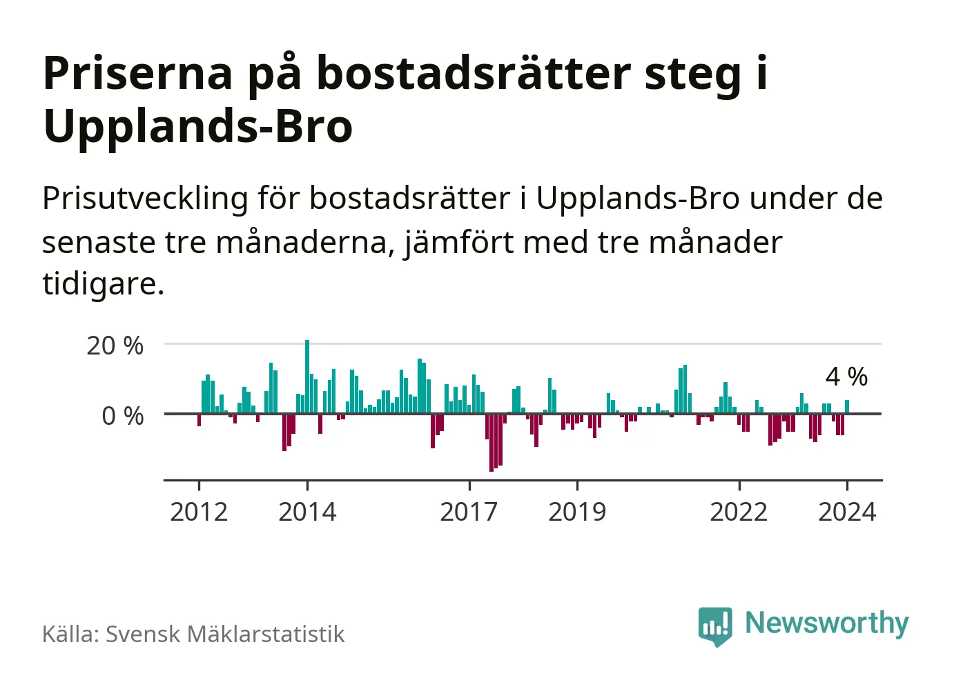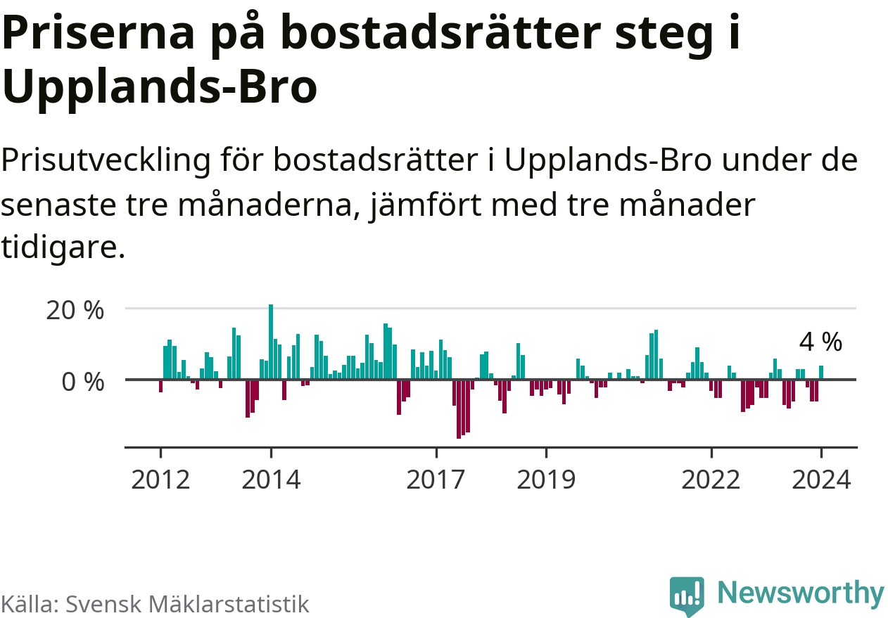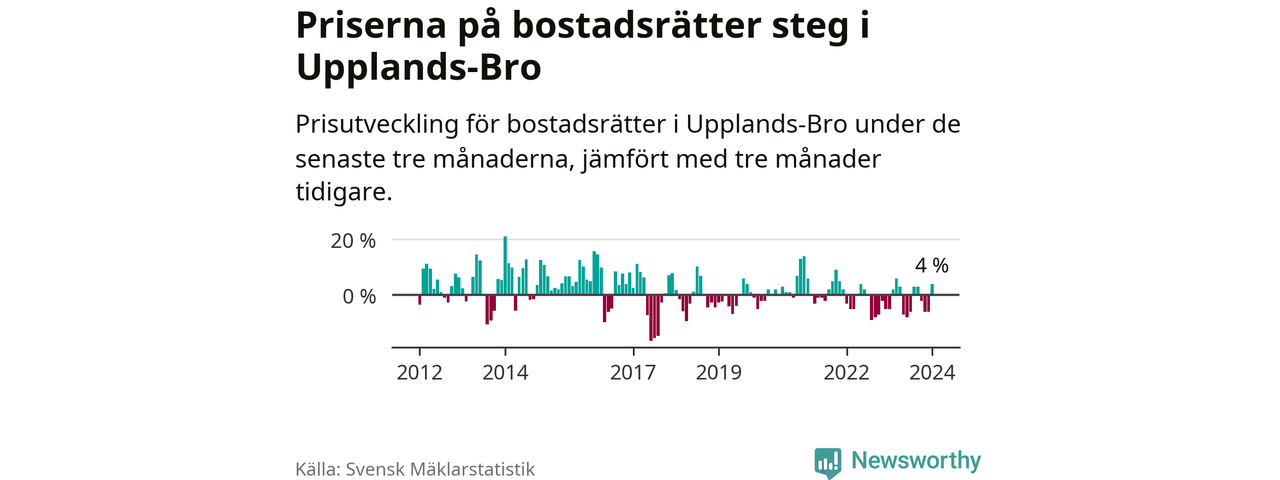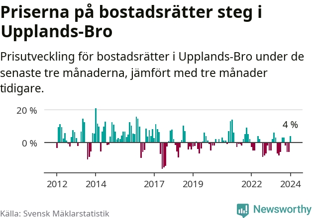 Priserna på bostadsrätter har gått upp i Upplands-Bro kommun. Medelpriset på försäljningarna under de senaste tre månaderna visar på en uppgång med 4 procent.