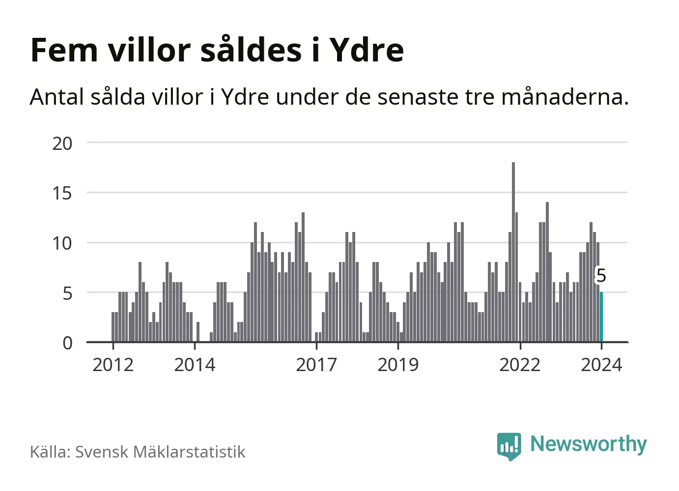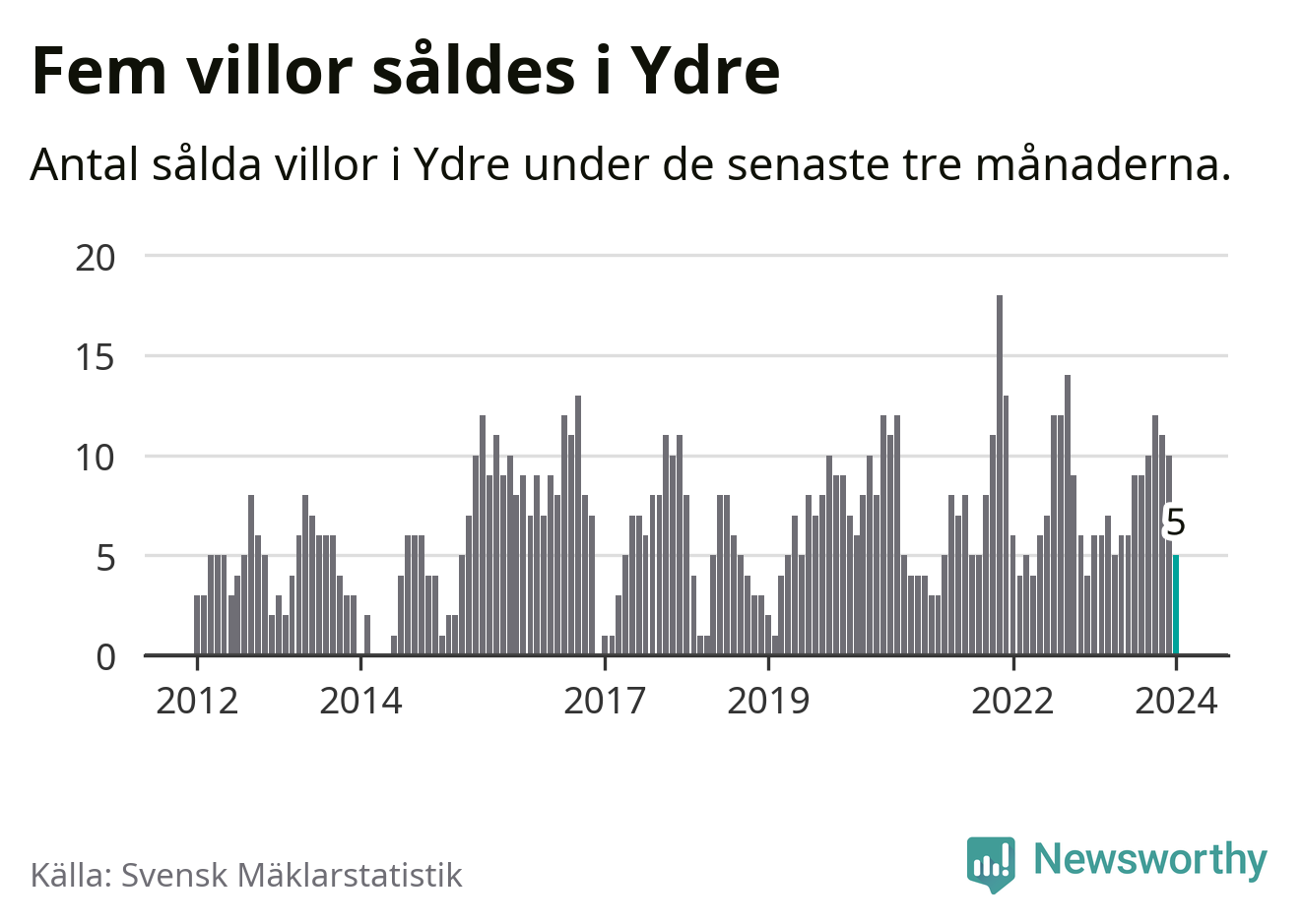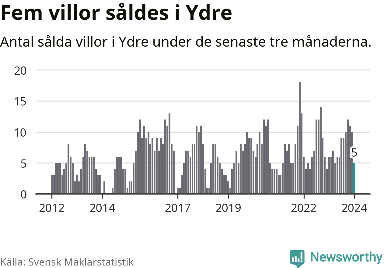 Mellan november och januari gjordes sammanlagt fem affärer med villor i Ydre kommun. Det kan jämföras med sex vid motsvarande tid i fjol.