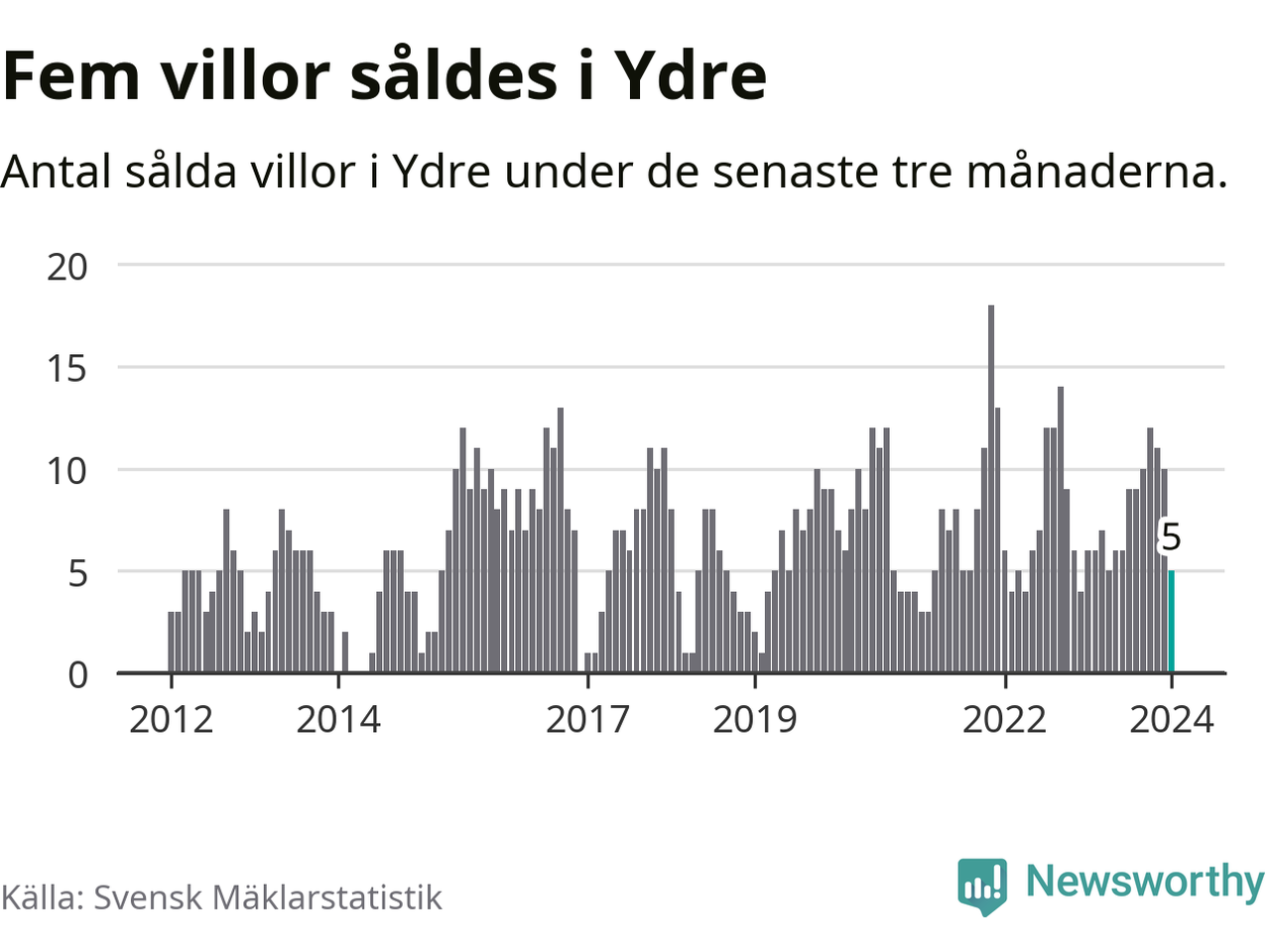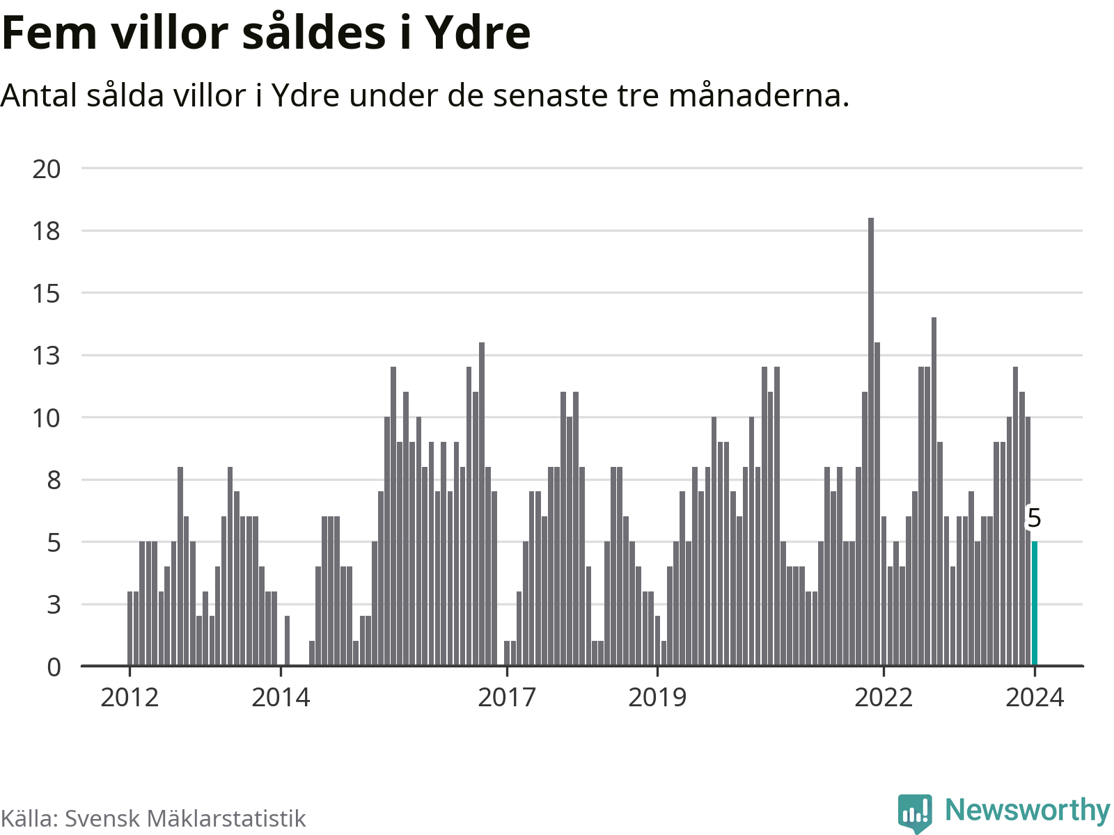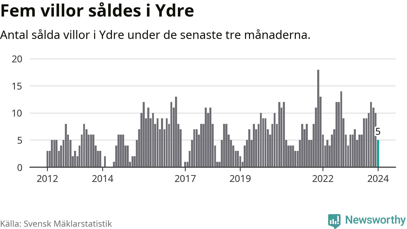 Mellan november och januari gjordes sammanlagt fem affärer med villor i Ydre kommun. Det kan jämföras med sex vid motsvarande tid i fjol.