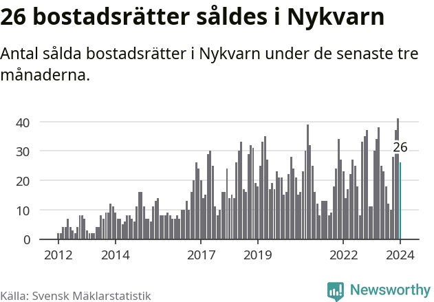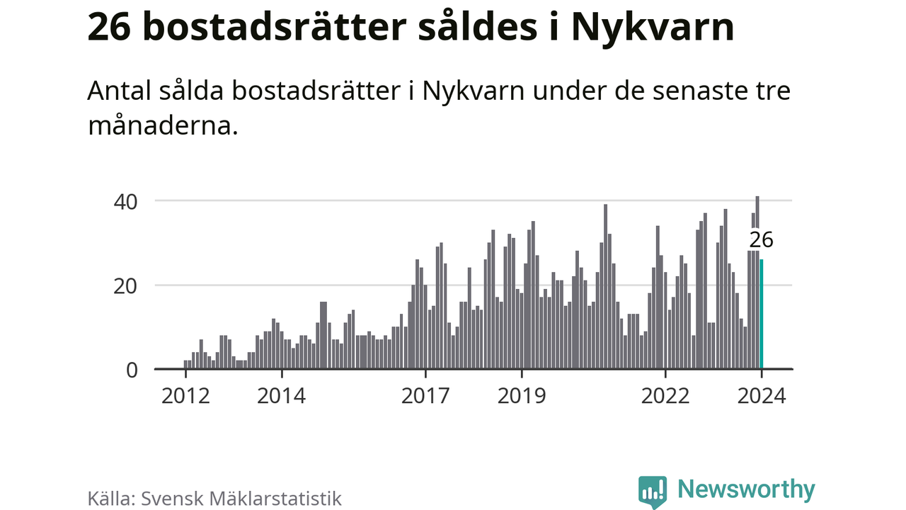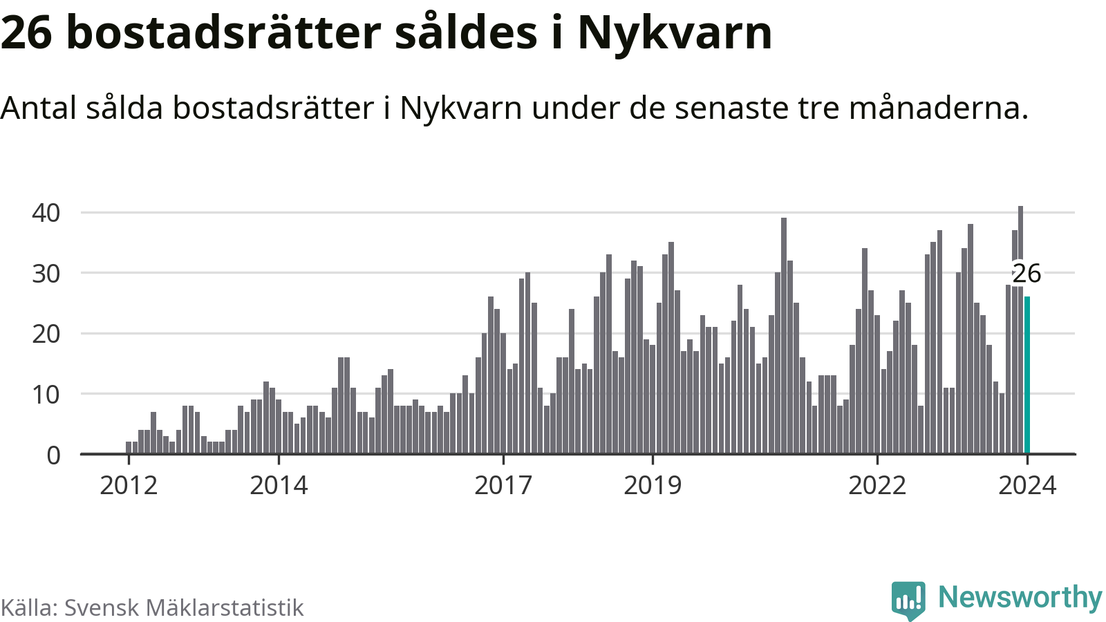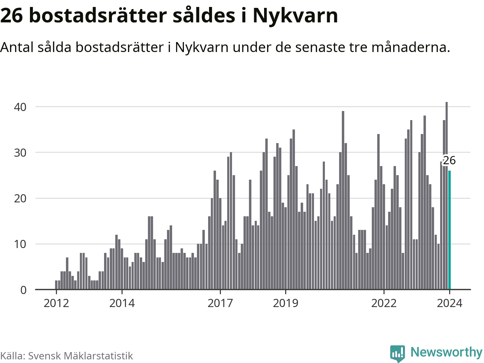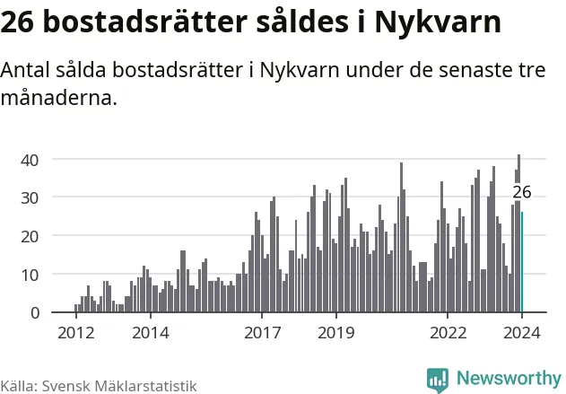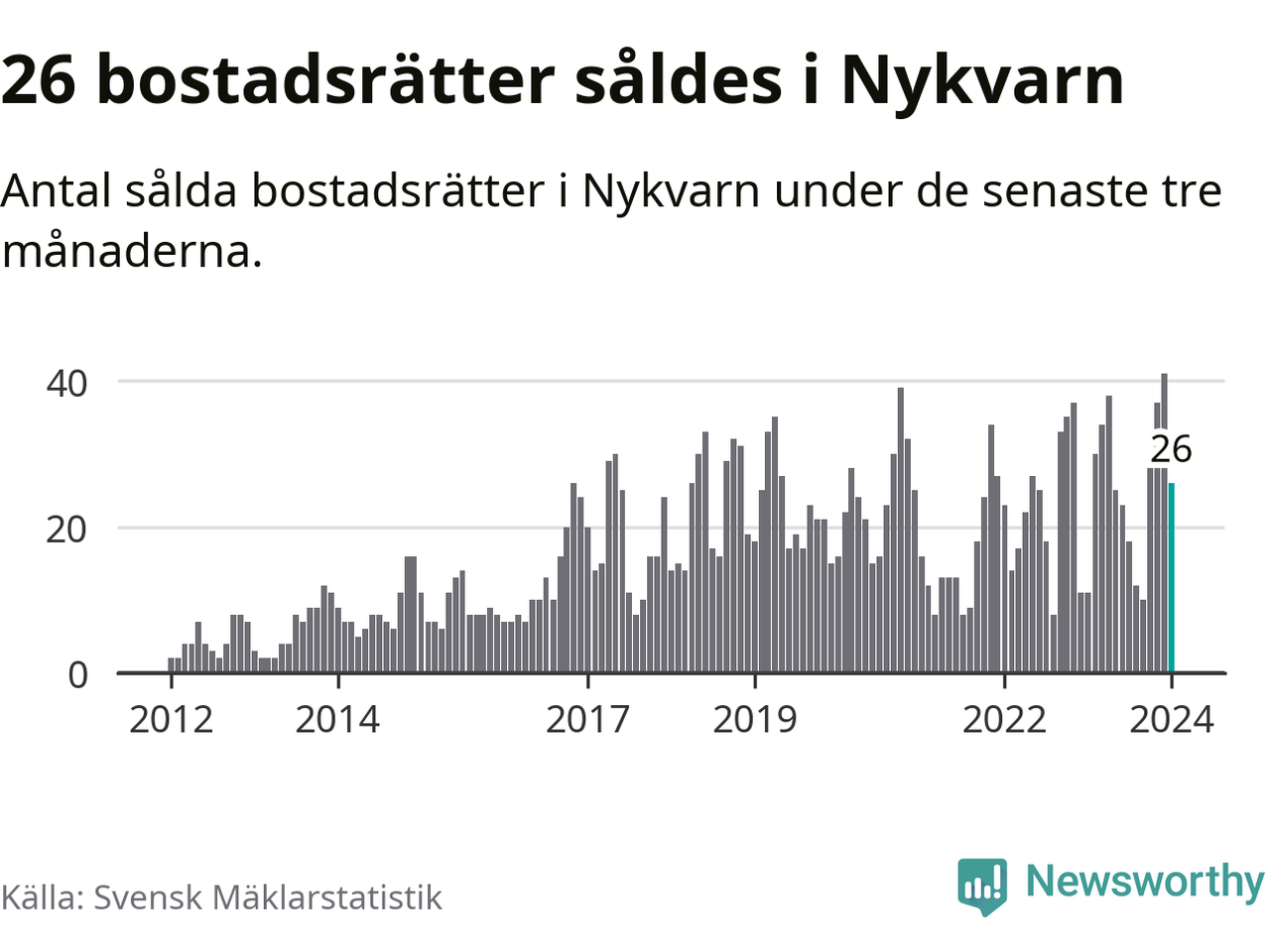 Mellan november och januari gjordes sammanlagt 26 affärer med bostadsrätter i Nykvarns kommun. Det kan jämföras med elva vid motsvarande tid i fjol.