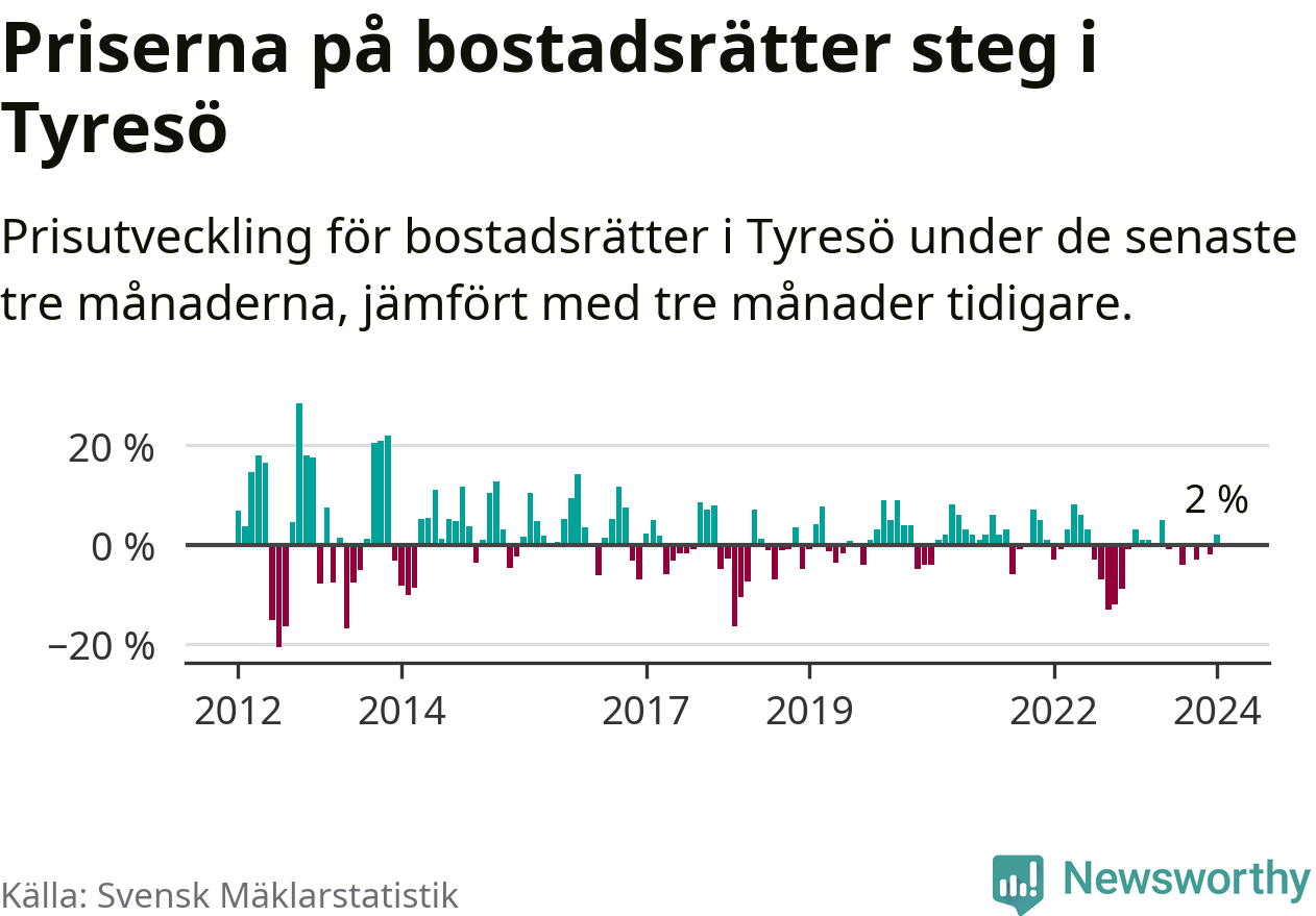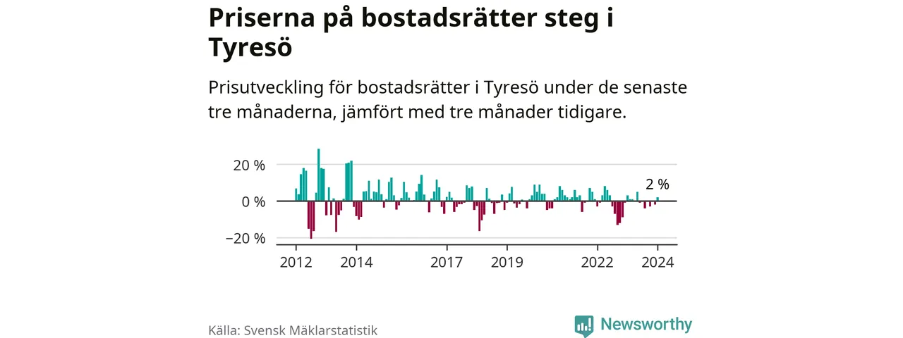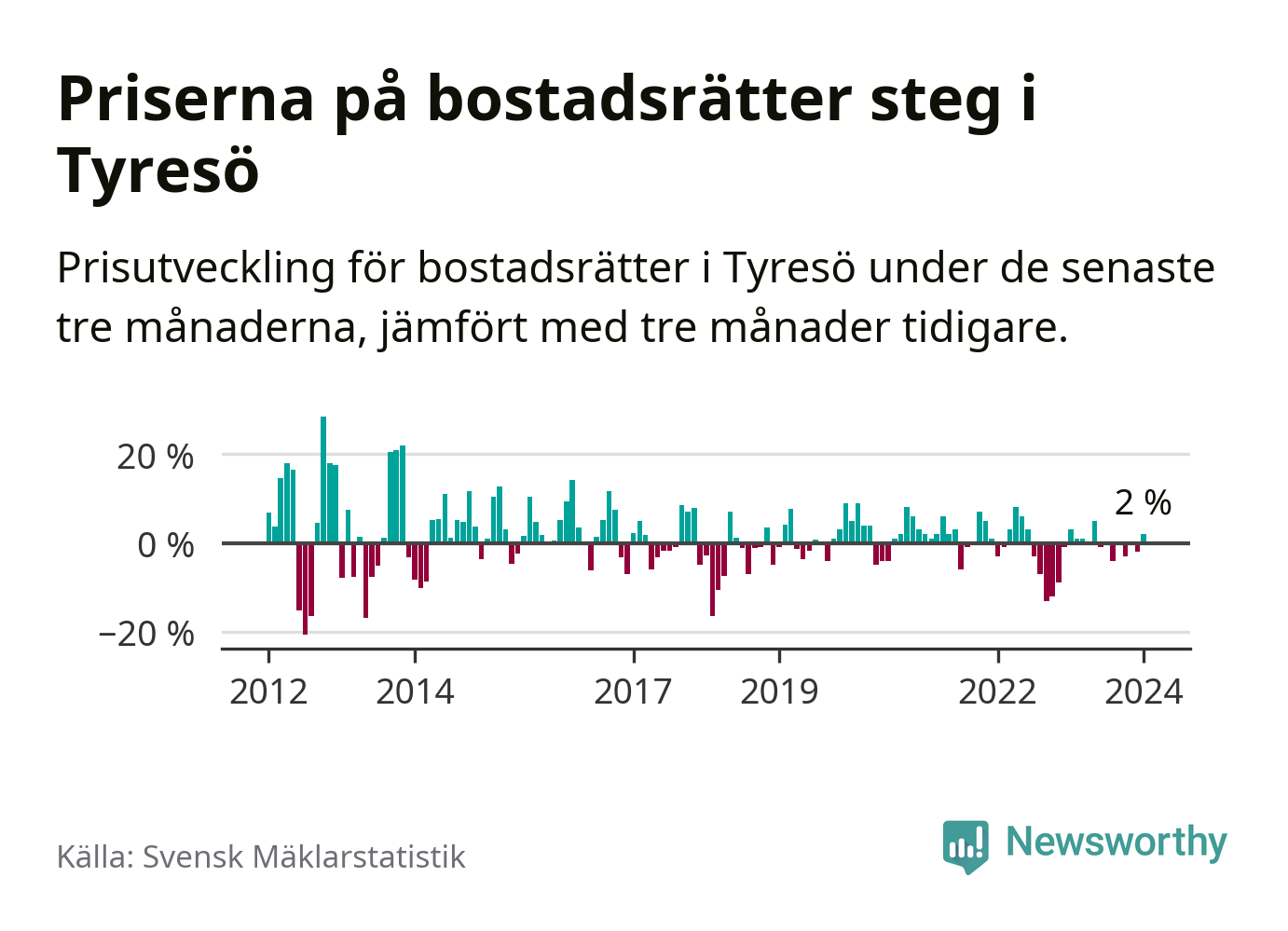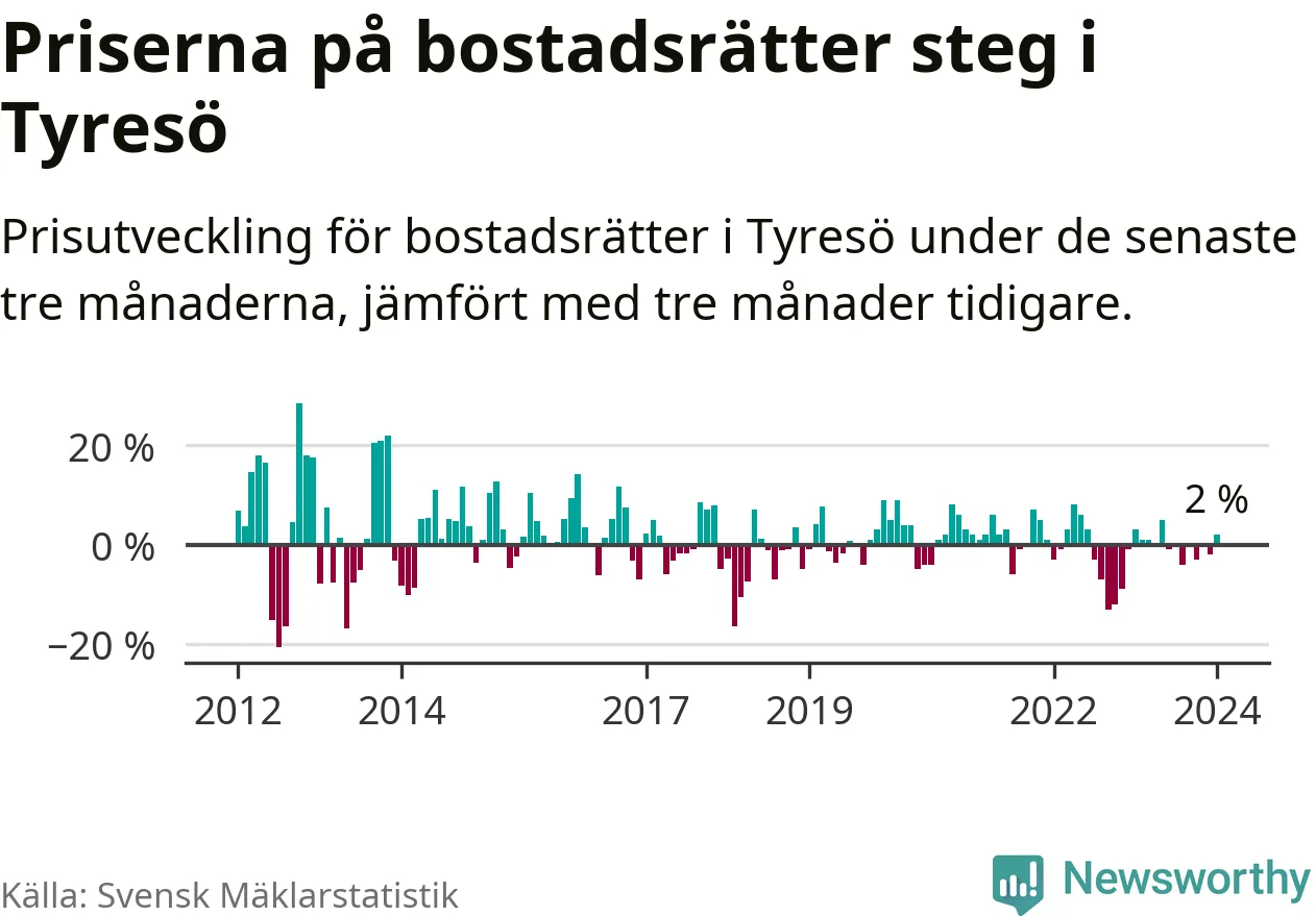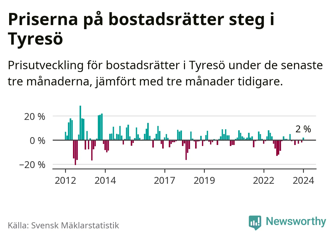 Priserna på bostadsrätter har gått upp i Tyresö kommun. Medelpriset på försäljningarna under de senaste tre månaderna visar på en uppgång med 2 procent.