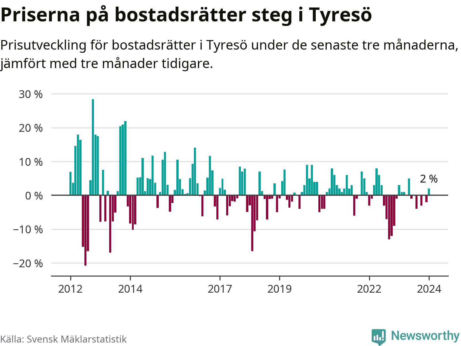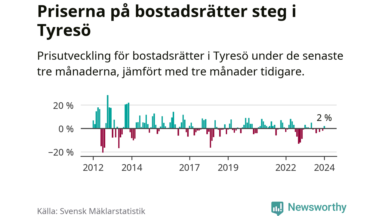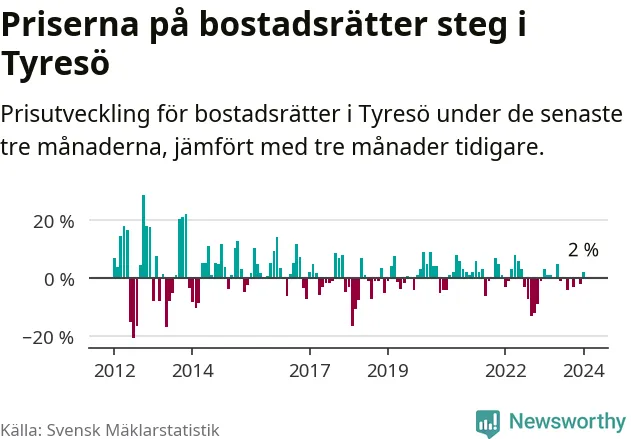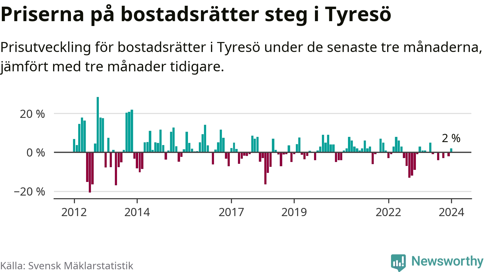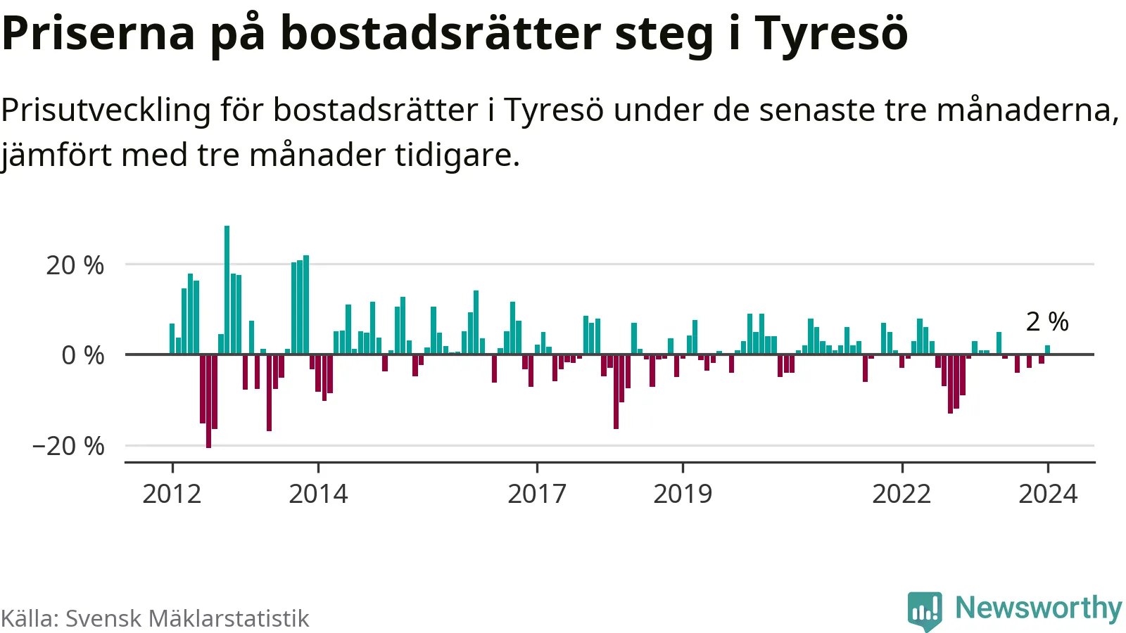 Priserna på bostadsrätter har gått upp i Tyresö kommun. Medelpriset på försäljningarna under de senaste tre månaderna visar på en uppgång med 2 procent.