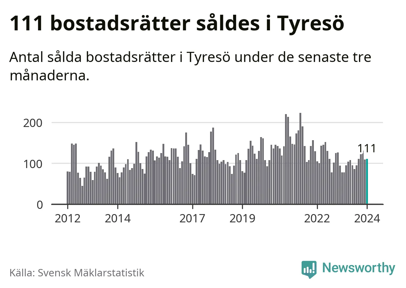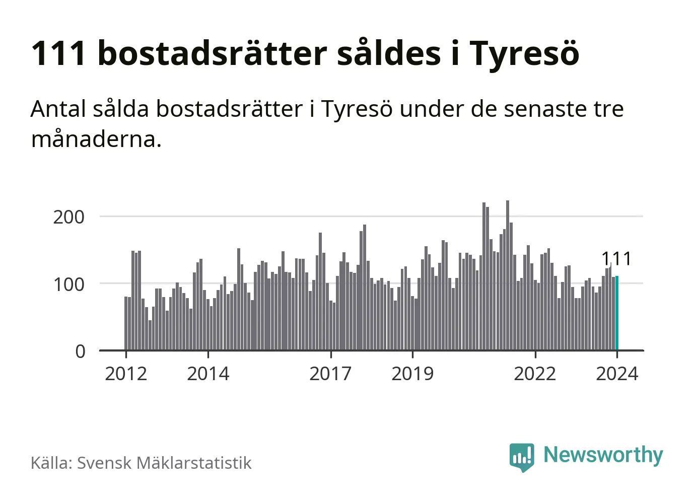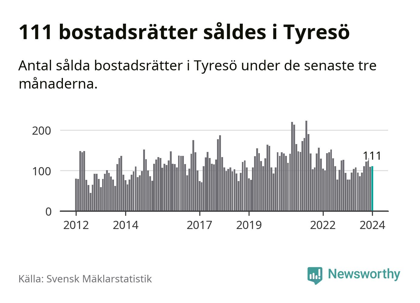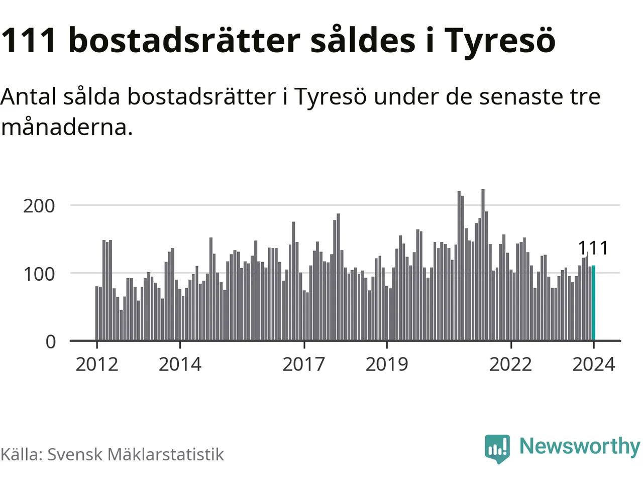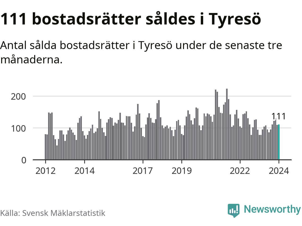 Sammanlagt såldes 111 bostadsrätter i Tyresö kommun mellan november och januari till ett genomsnittligt pris på 2,6 miljoner kronor. I fjol gjordes 78 affärer vid den här tiden på året.