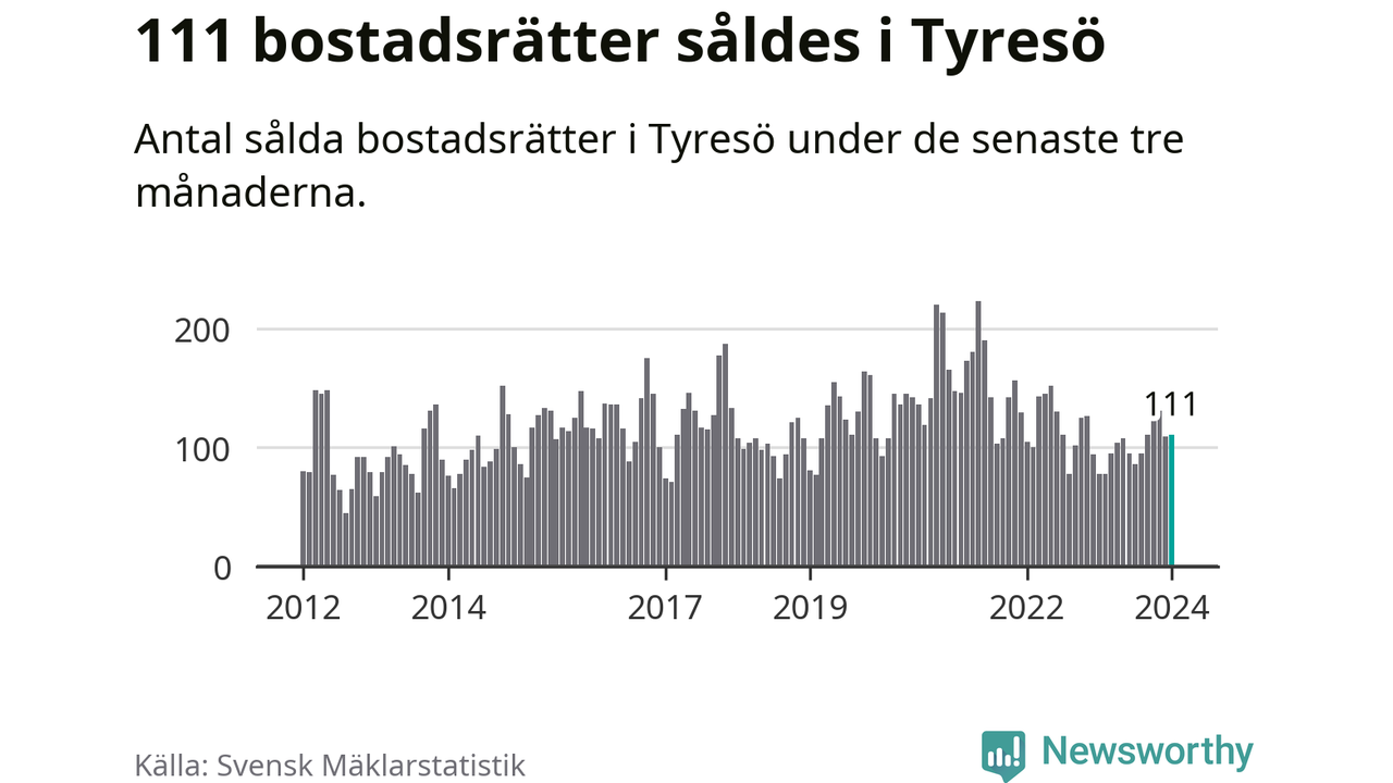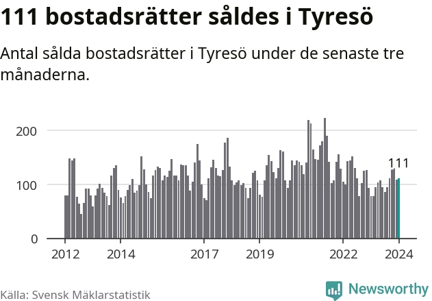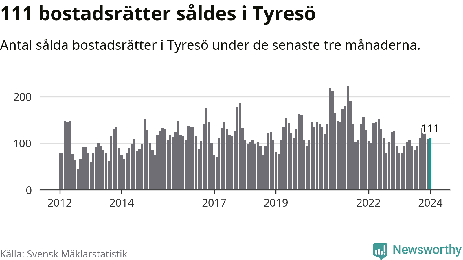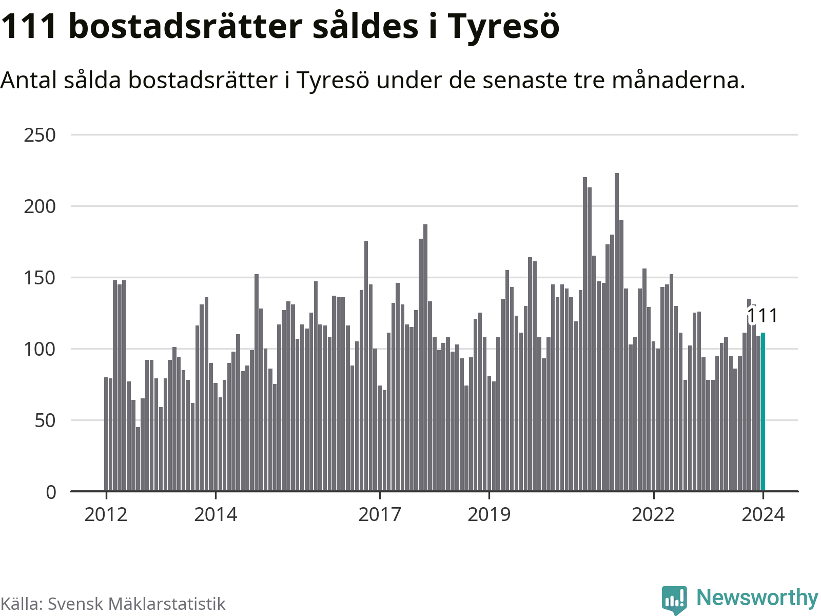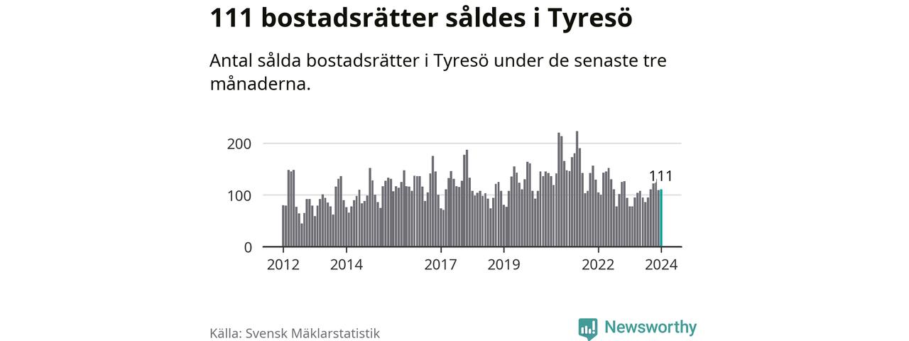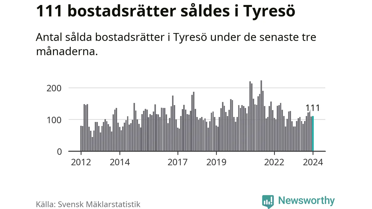 Sammanlagt såldes 111 bostadsrätter i Tyresö kommun mellan november och januari till ett genomsnittligt pris på 2,6 miljoner kronor. I fjol gjordes 78 affärer vid den här tiden på året.