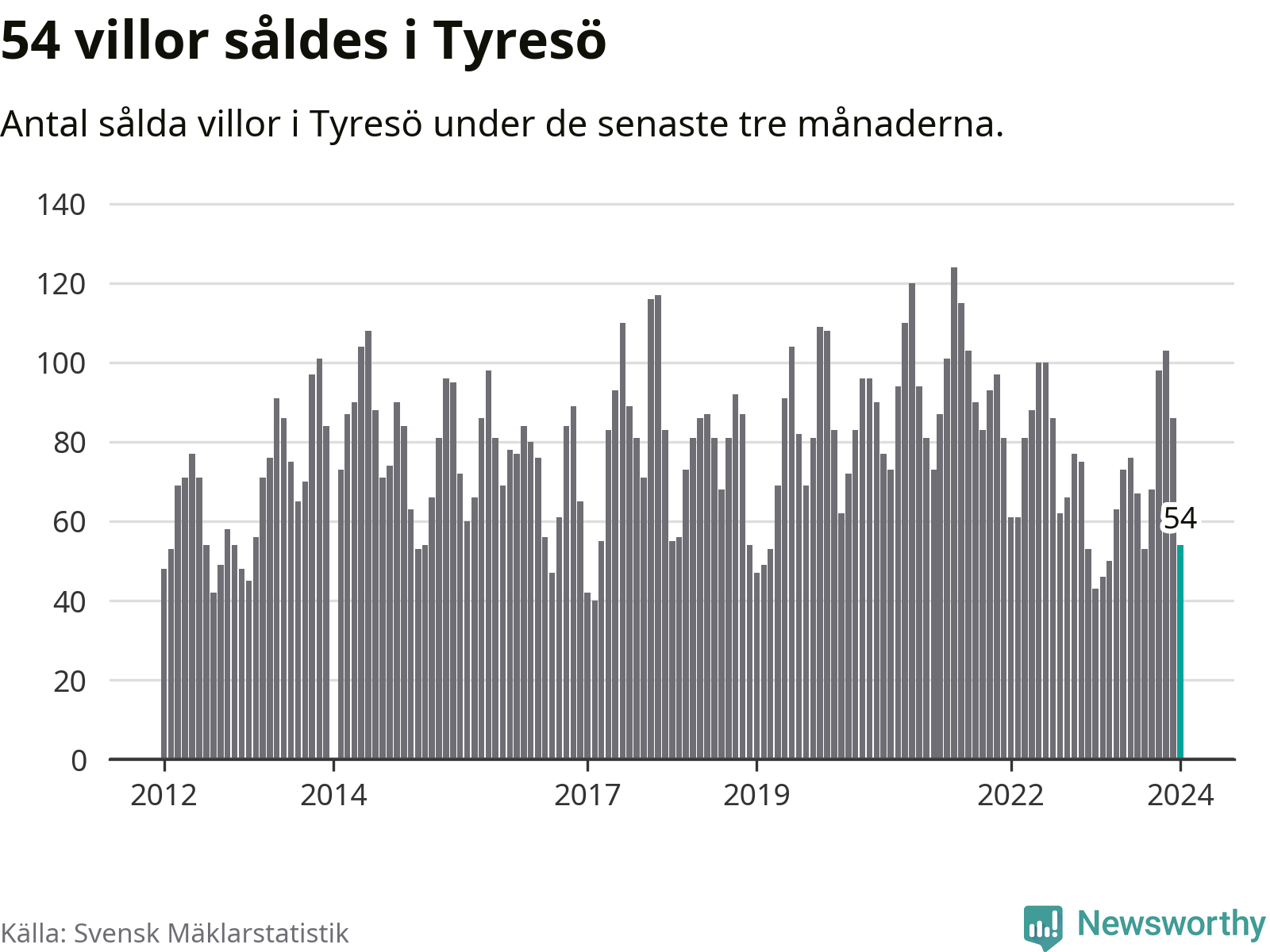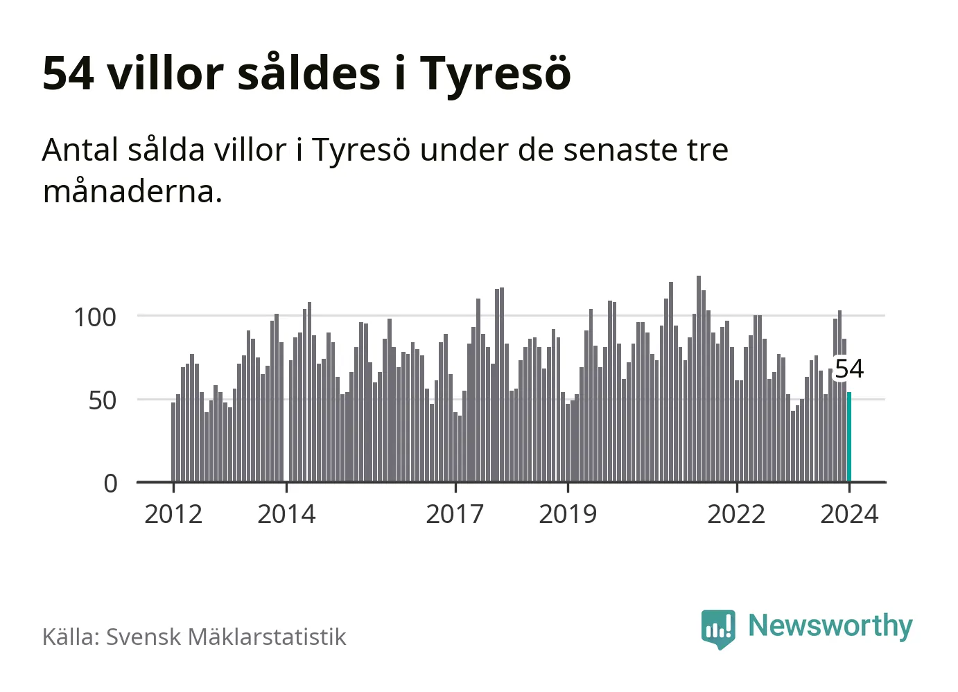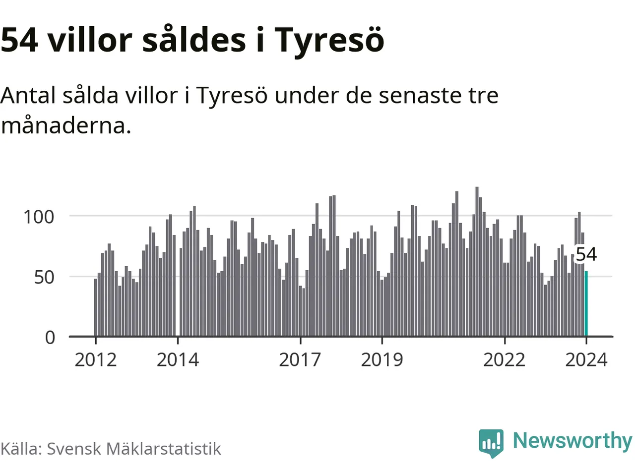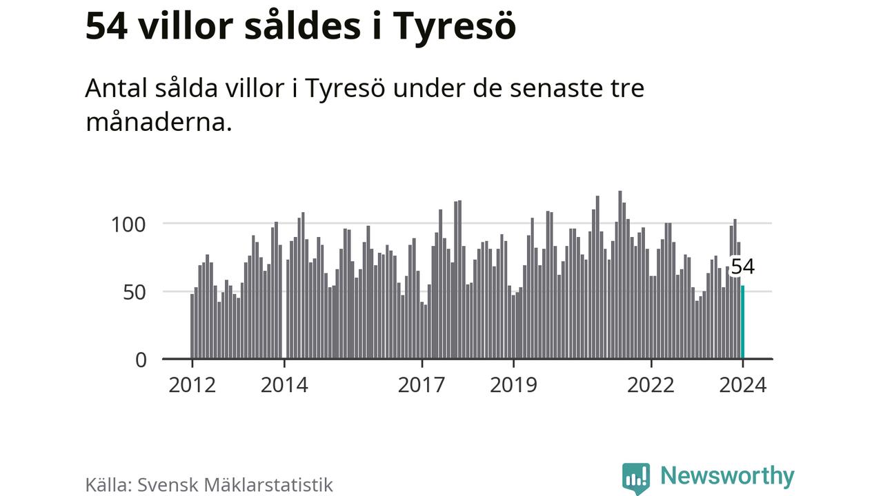 Sammanlagt såldes 54 villor i Tyresö kommun mellan november och januari till ett genomsnittligt pris på 5,5 miljoner kronor. I fjol gjordes 43 affärer vid den här tiden på året.