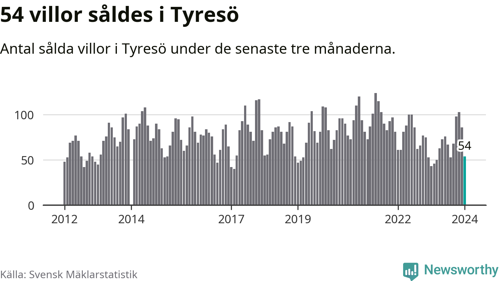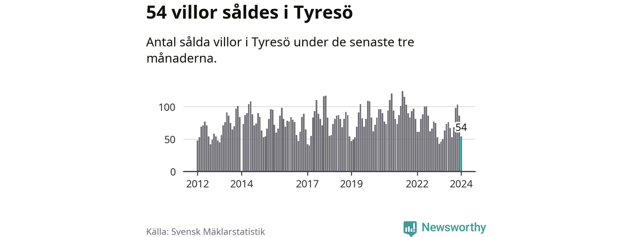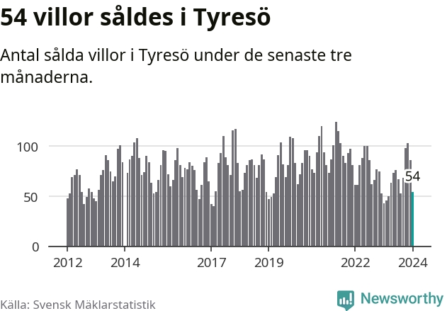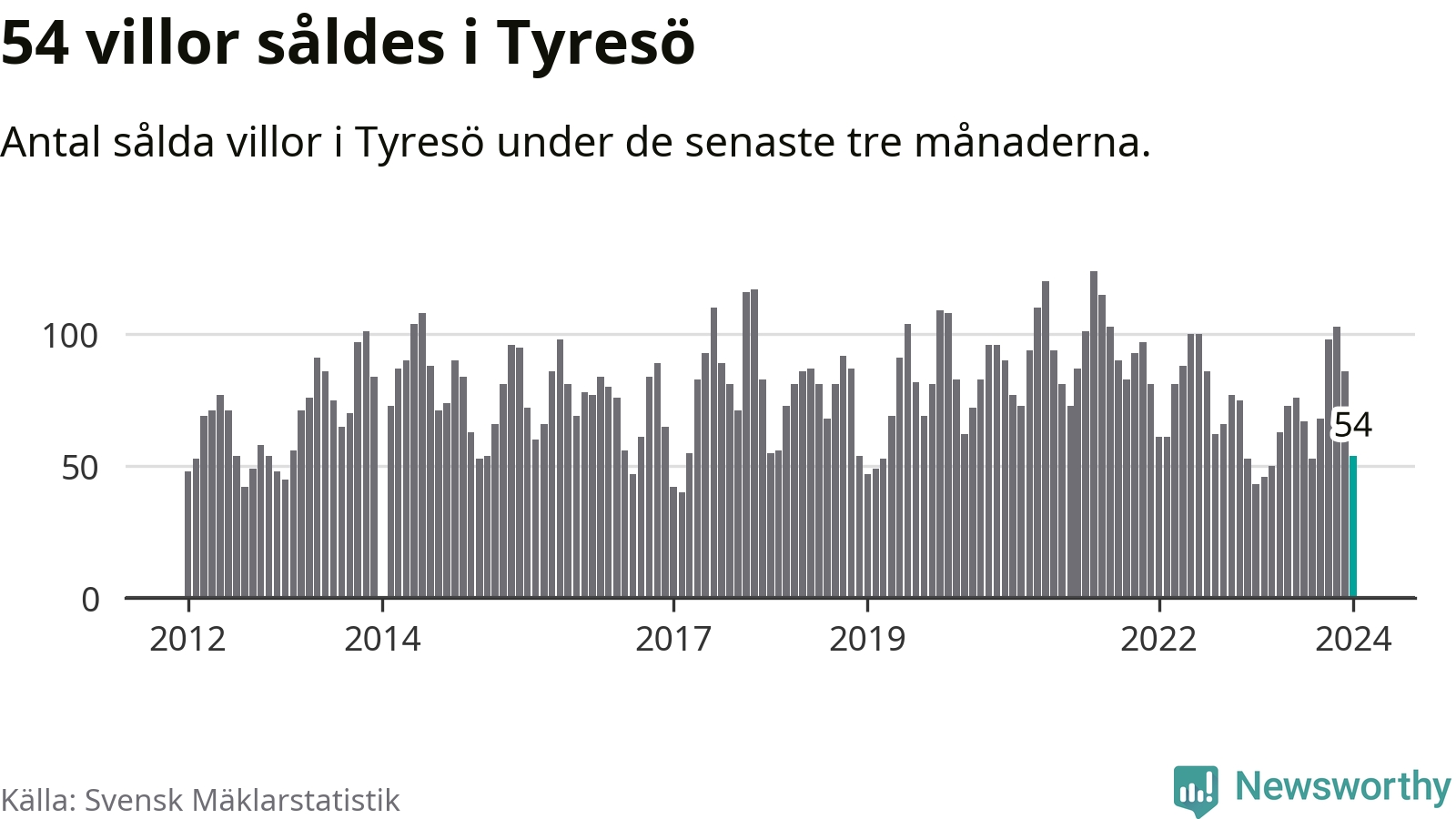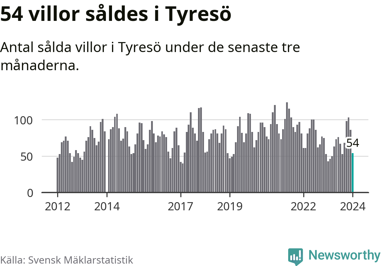 Sammanlagt såldes 54 villor i Tyresö kommun mellan november och januari till ett genomsnittligt pris på 5,5 miljoner kronor. I fjol gjordes 43 affärer vid den här tiden på året.
