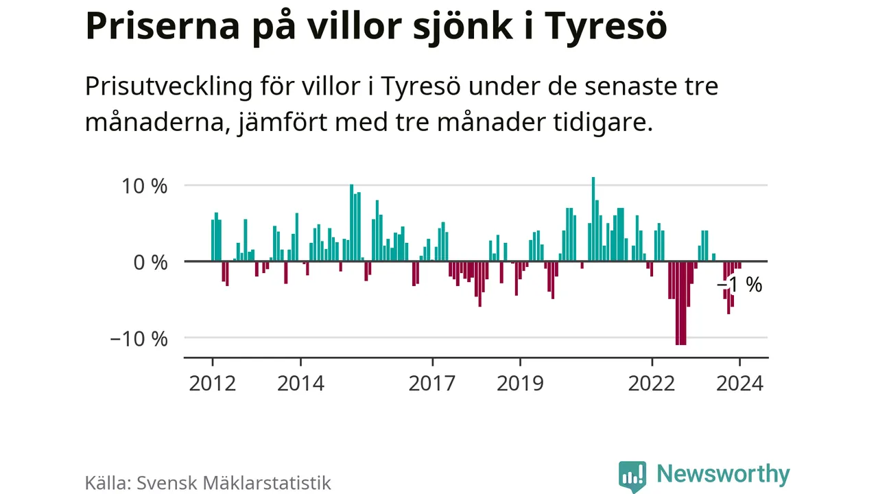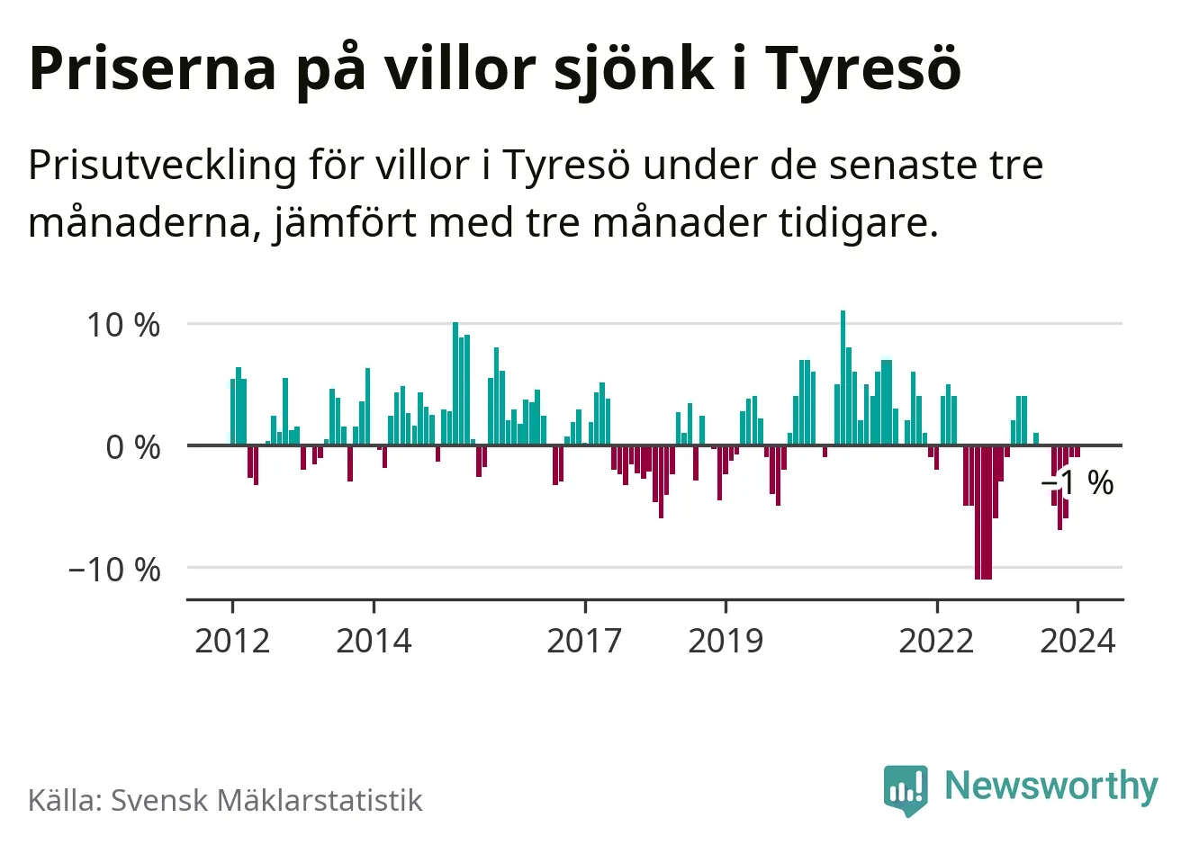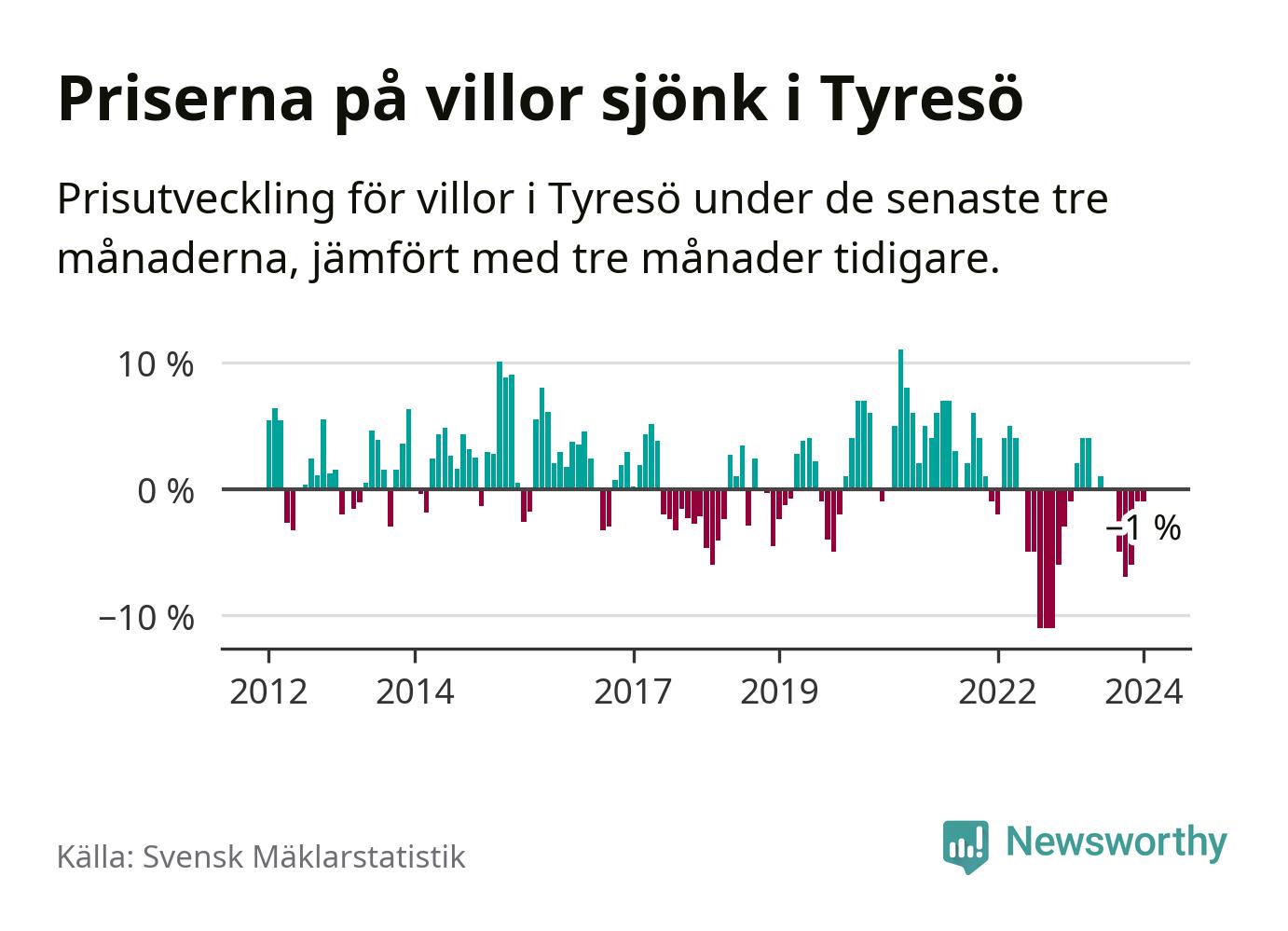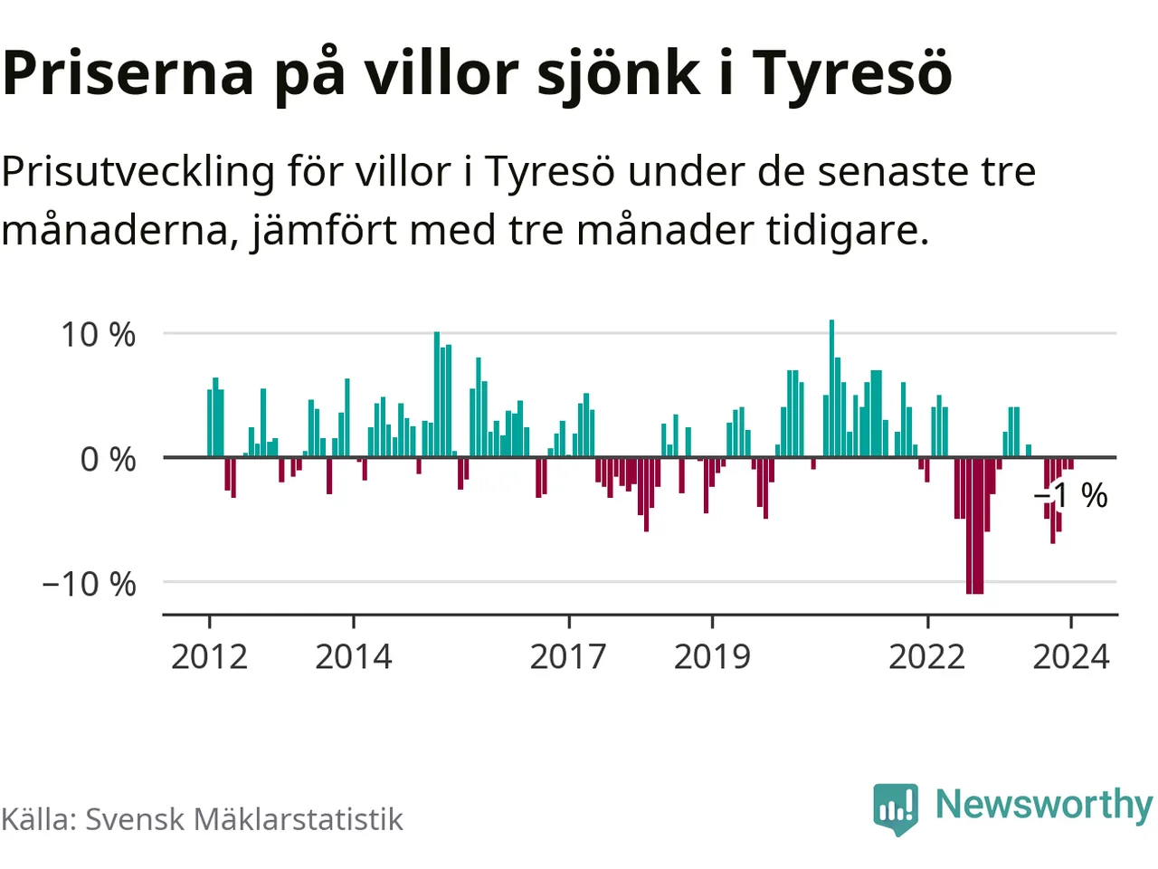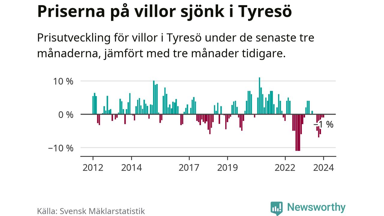 Villapriserna har gått ner i Tyresö kommun. Medelpriset på försäljningarna under de senaste tre månaderna visar på en nedgång med 1 procent.