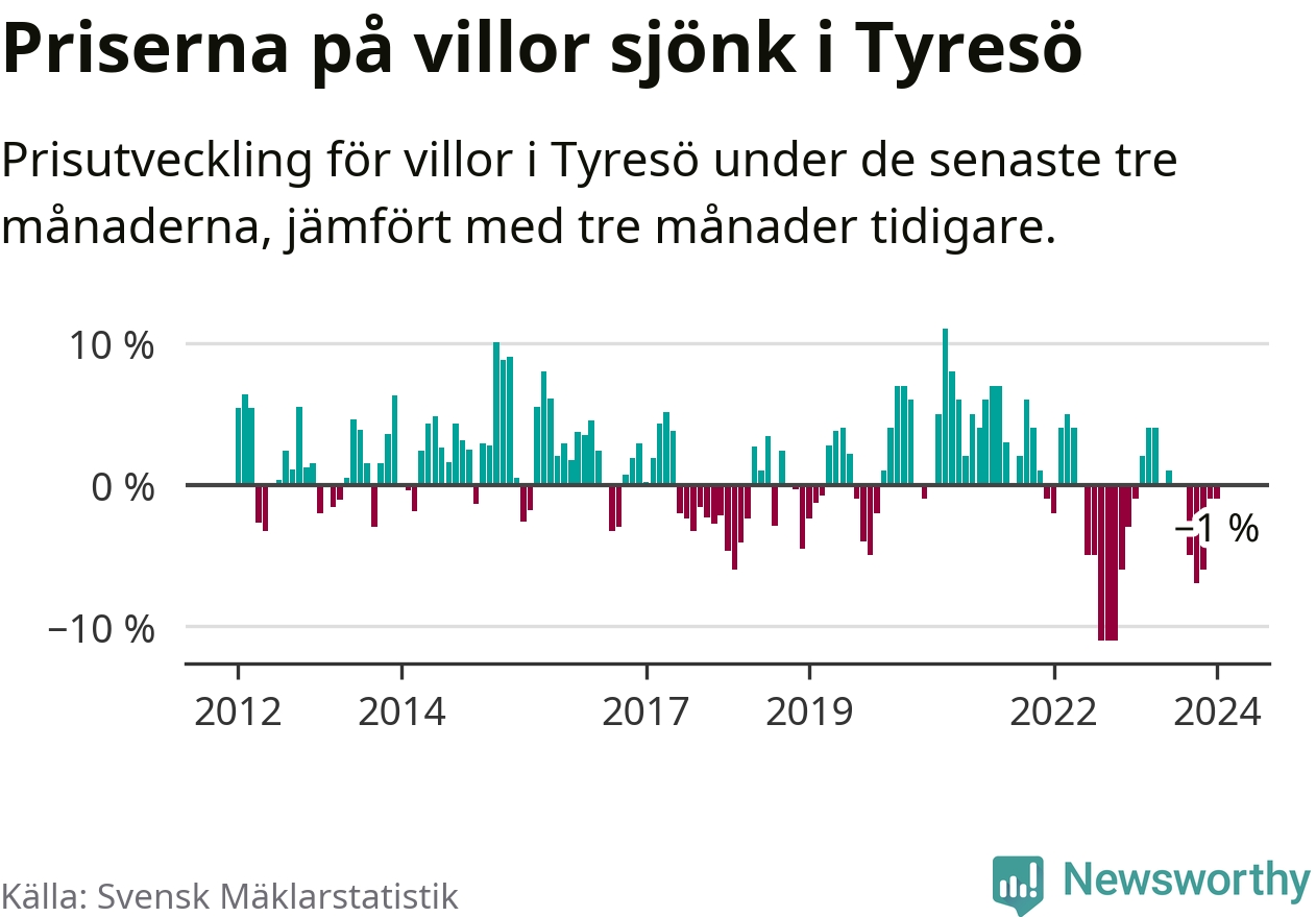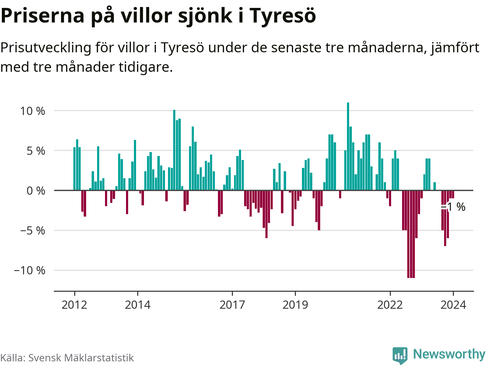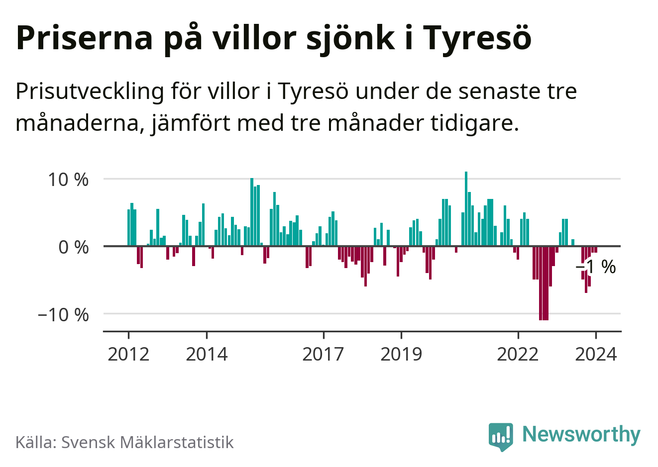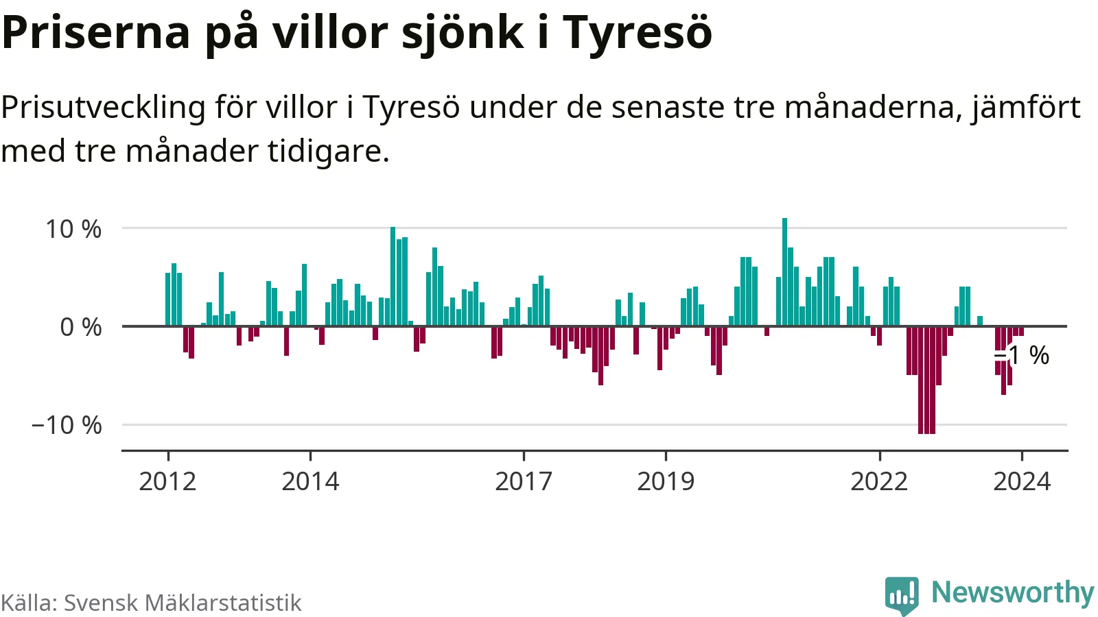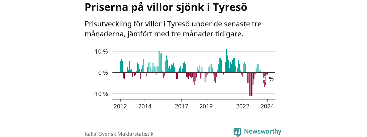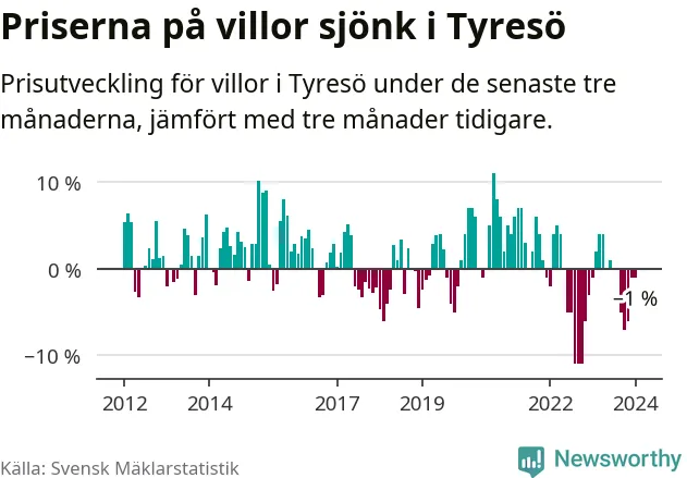 Villapriserna har gått ner i Tyresö kommun. Medelpriset på försäljningarna under de senaste tre månaderna visar på en nedgång med 1 procent.