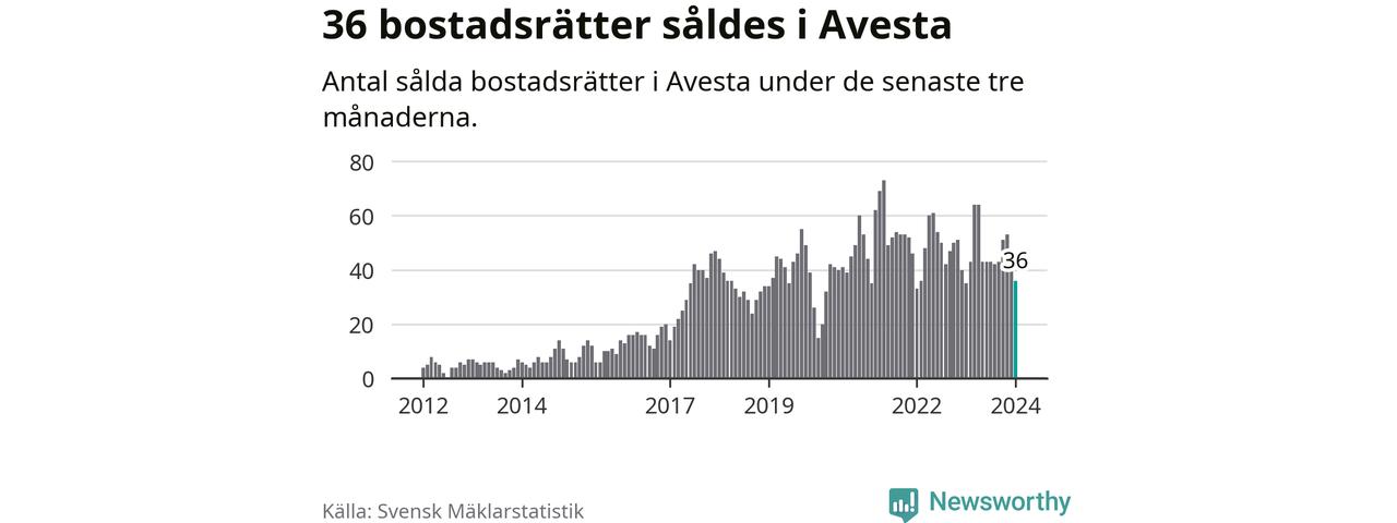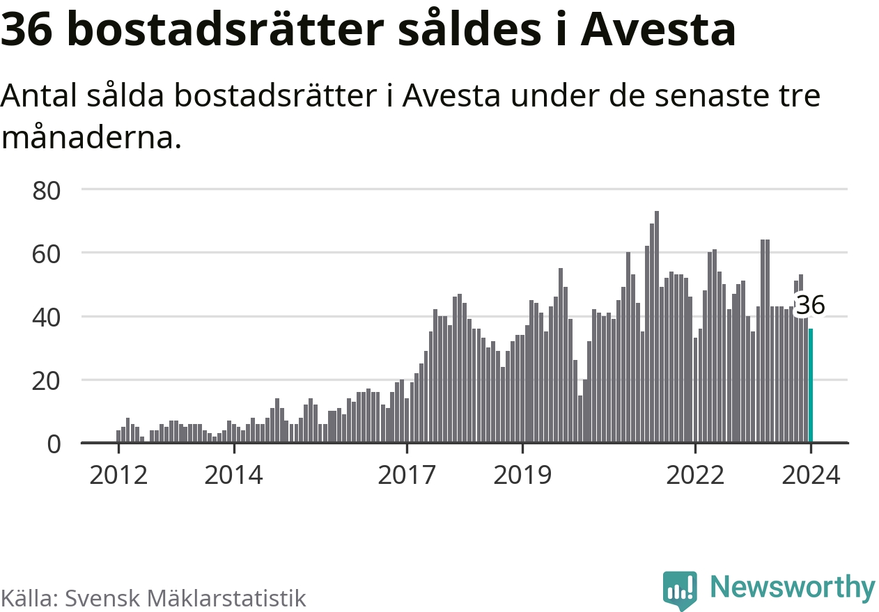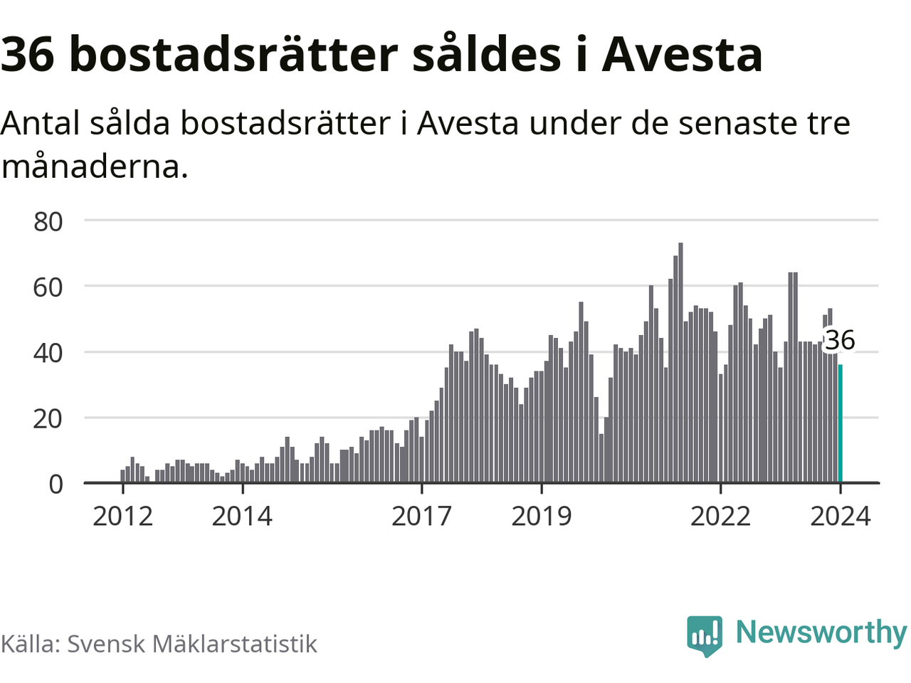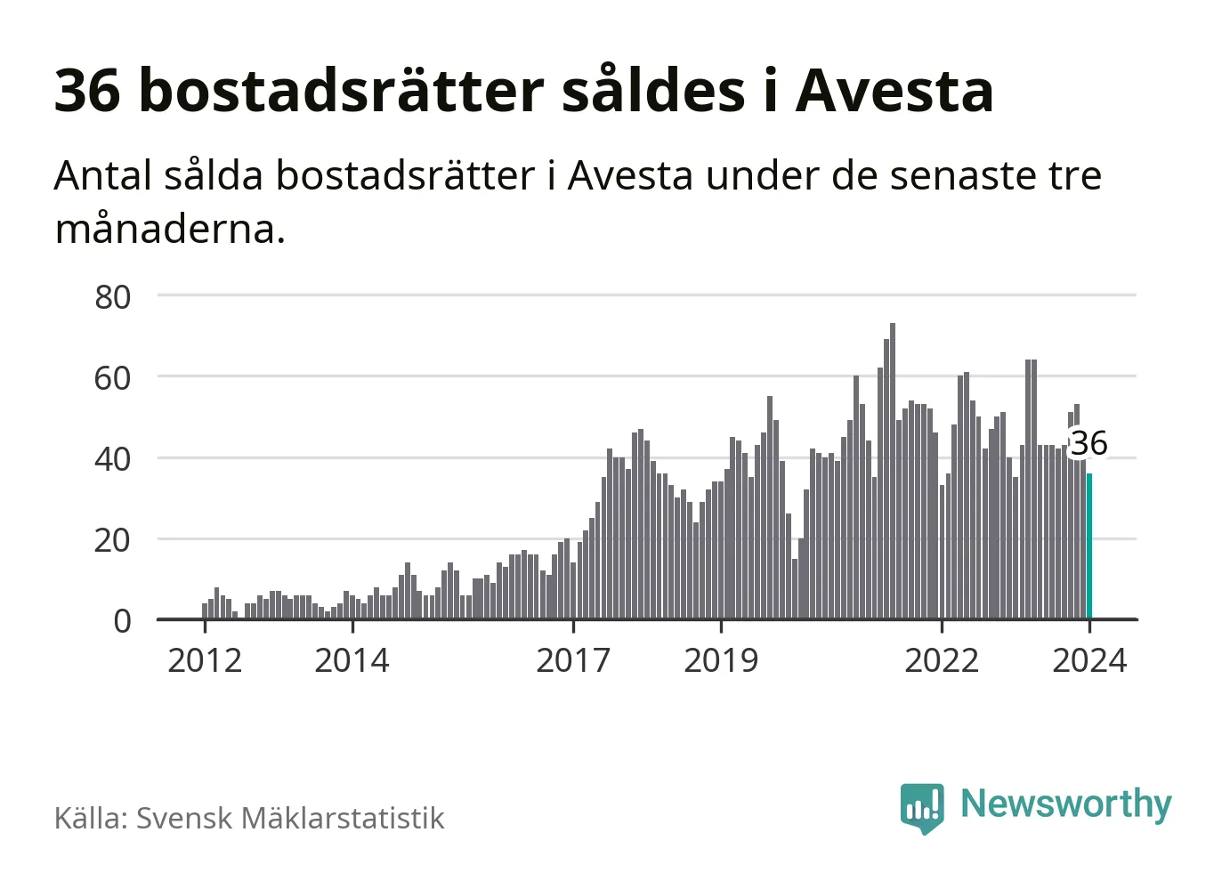 Sammanlagt såldes 36 bostadsrätter i Avesta kommun mellan november och januari till ett genomsnittligt pris på 0,5 miljoner kronor. I fjol gjordes 35 affärer vid den här tiden på året.