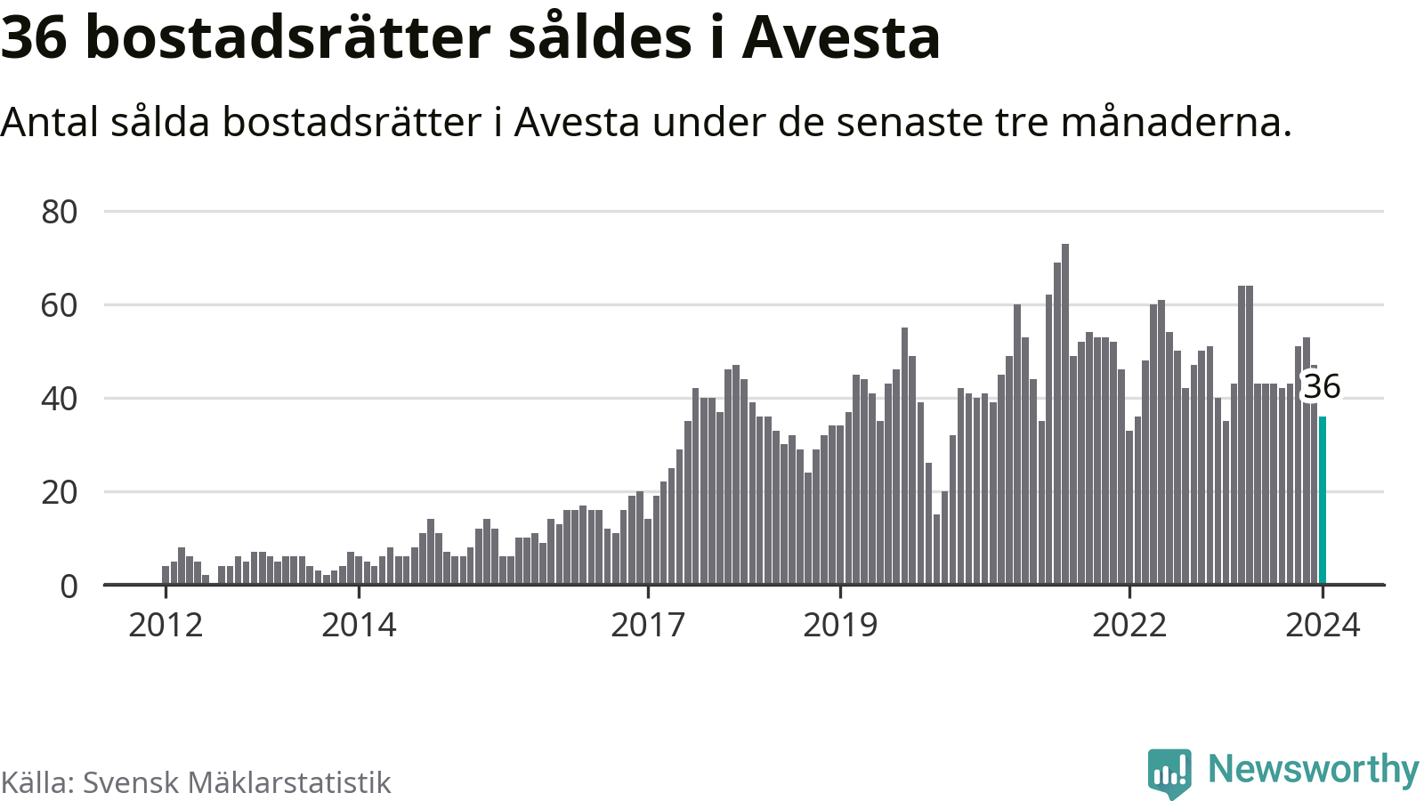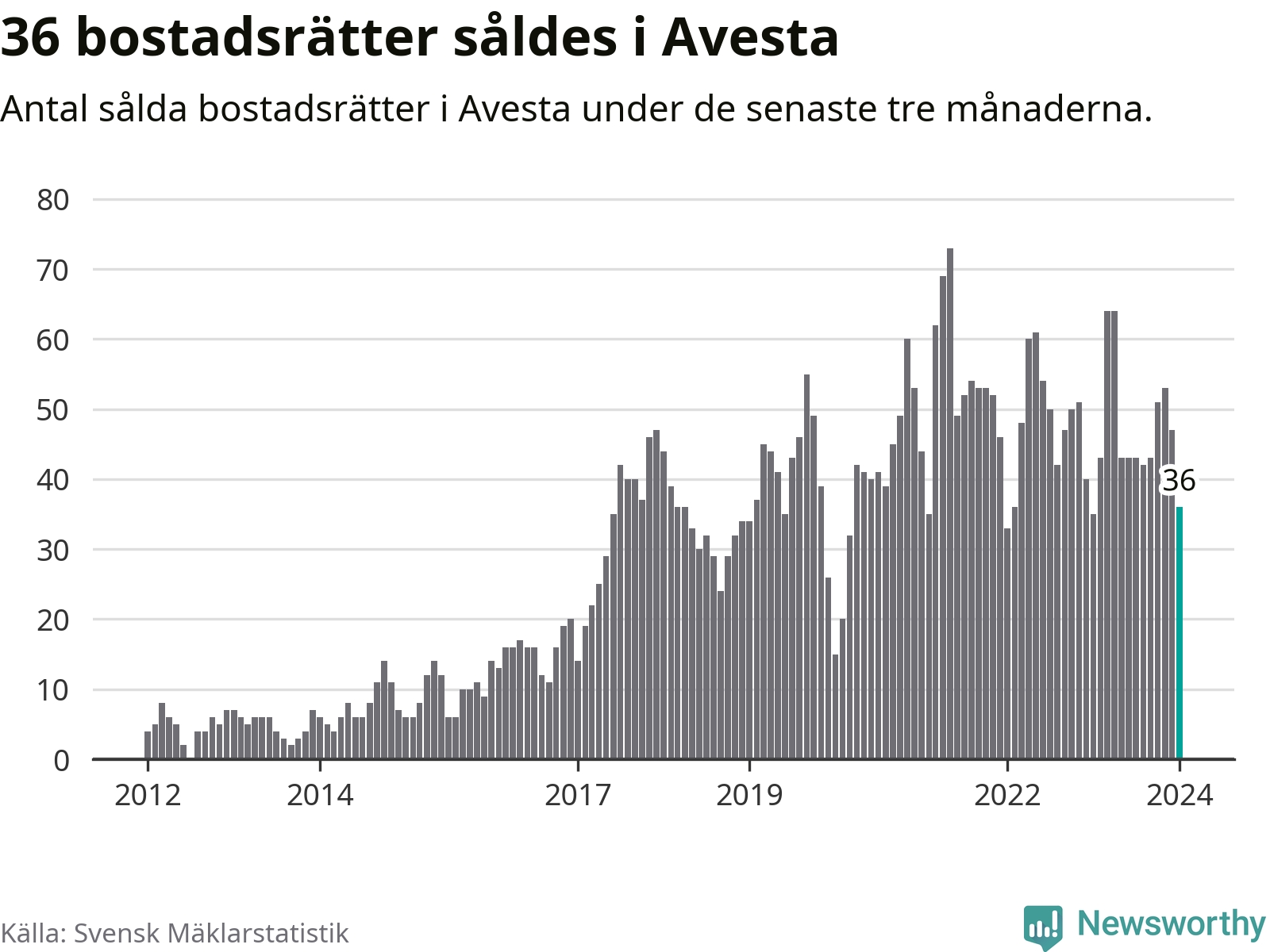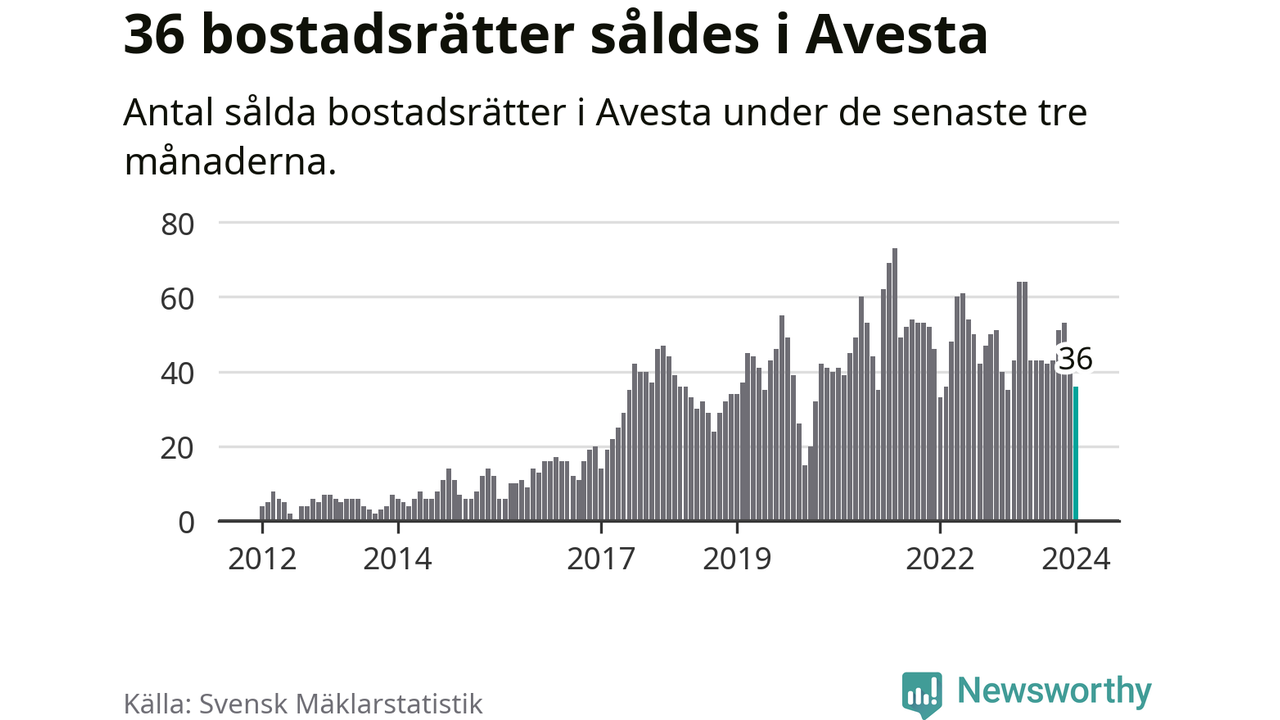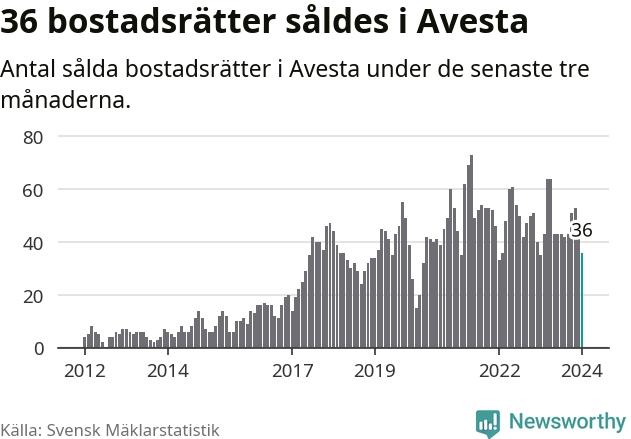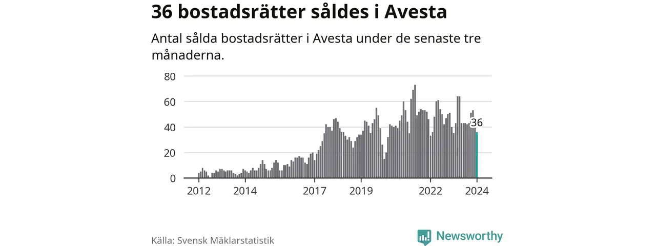 Sammanlagt såldes 36 bostadsrätter i Avesta kommun mellan november och januari till ett genomsnittligt pris på 0,5 miljoner kronor. I fjol gjordes 35 affärer vid den här tiden på året.