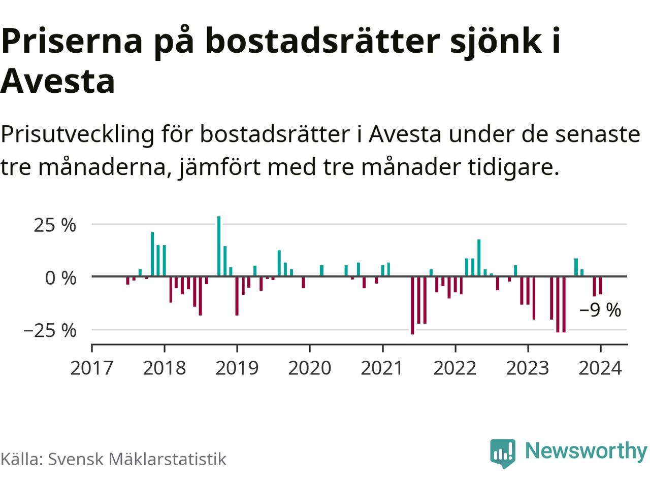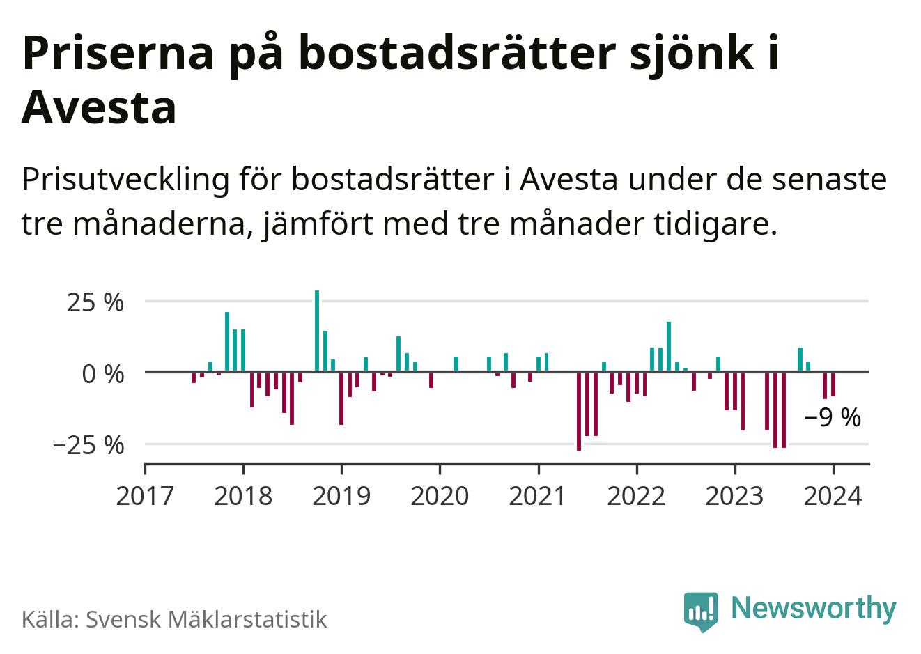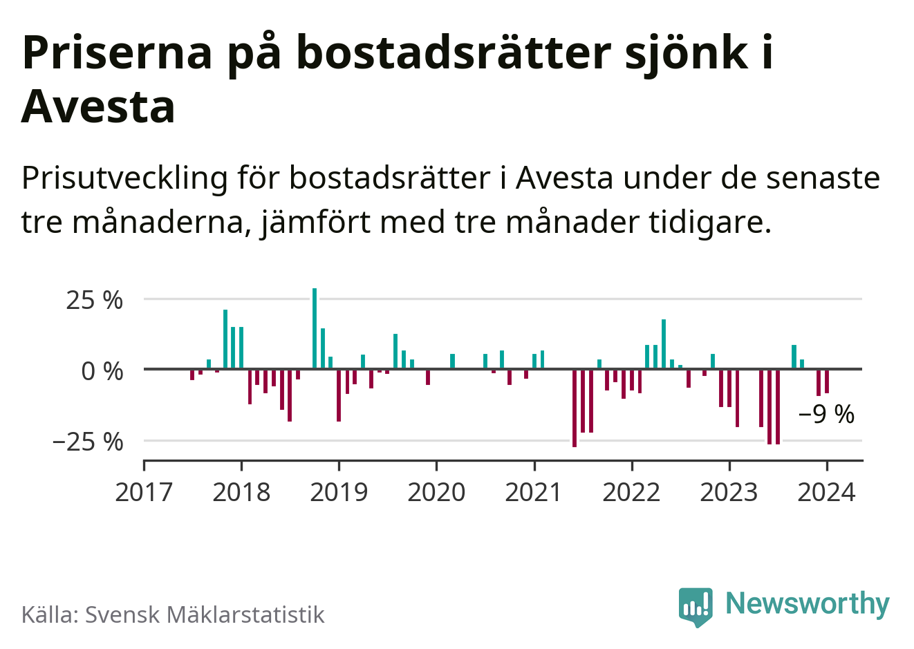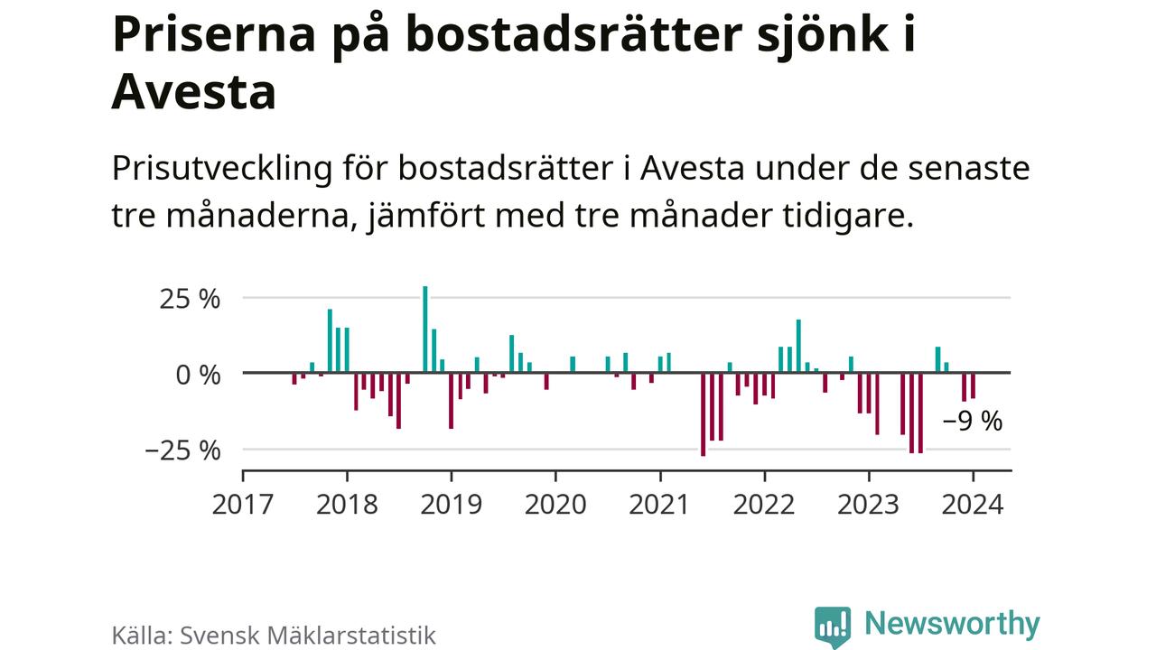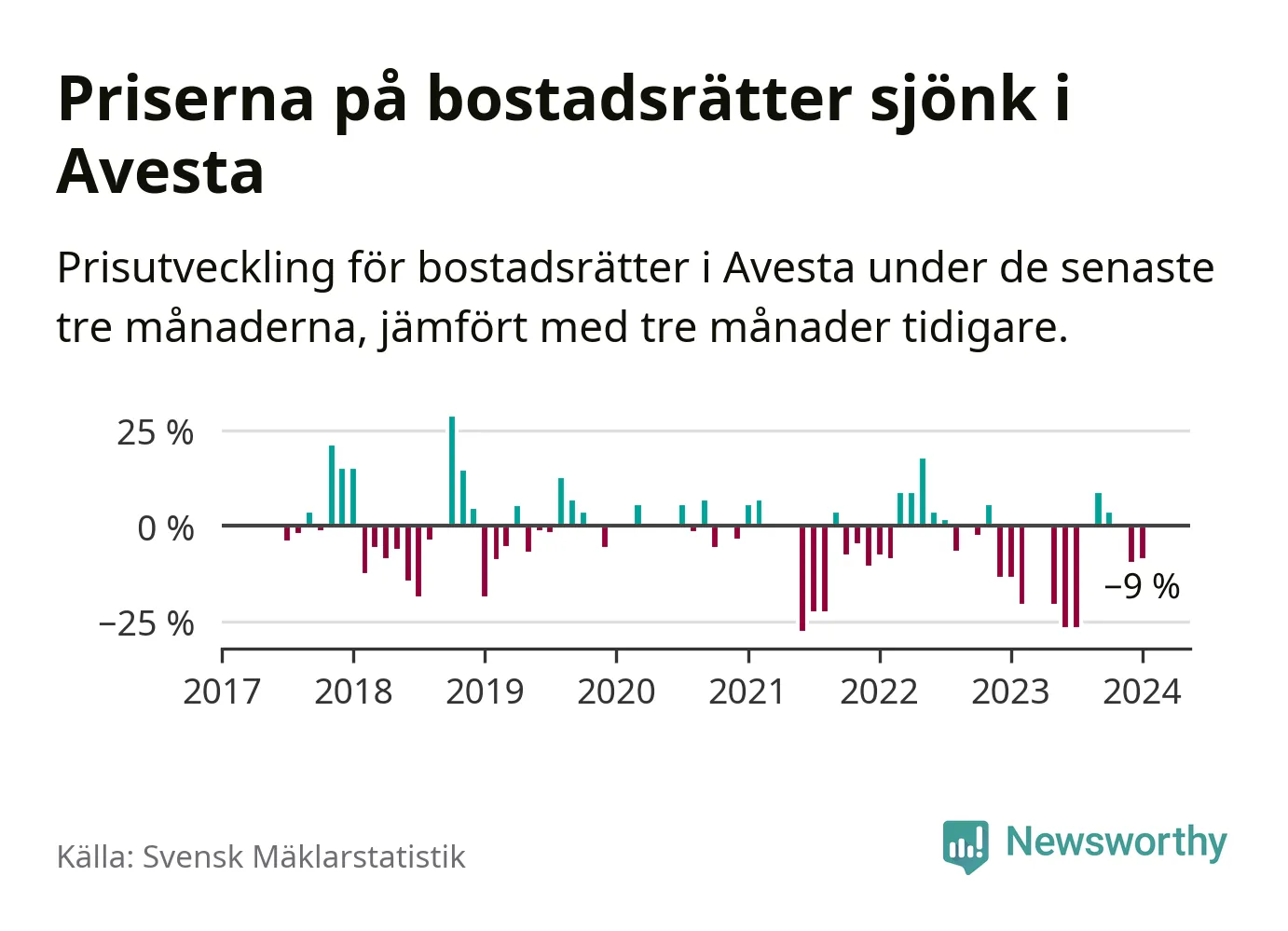 Priserna på bostadsrätter har gått ner i Avesta kommun. Medelpriset på försäljningarna under de senaste tre månaderna visar på en nedgång med 9 procent.