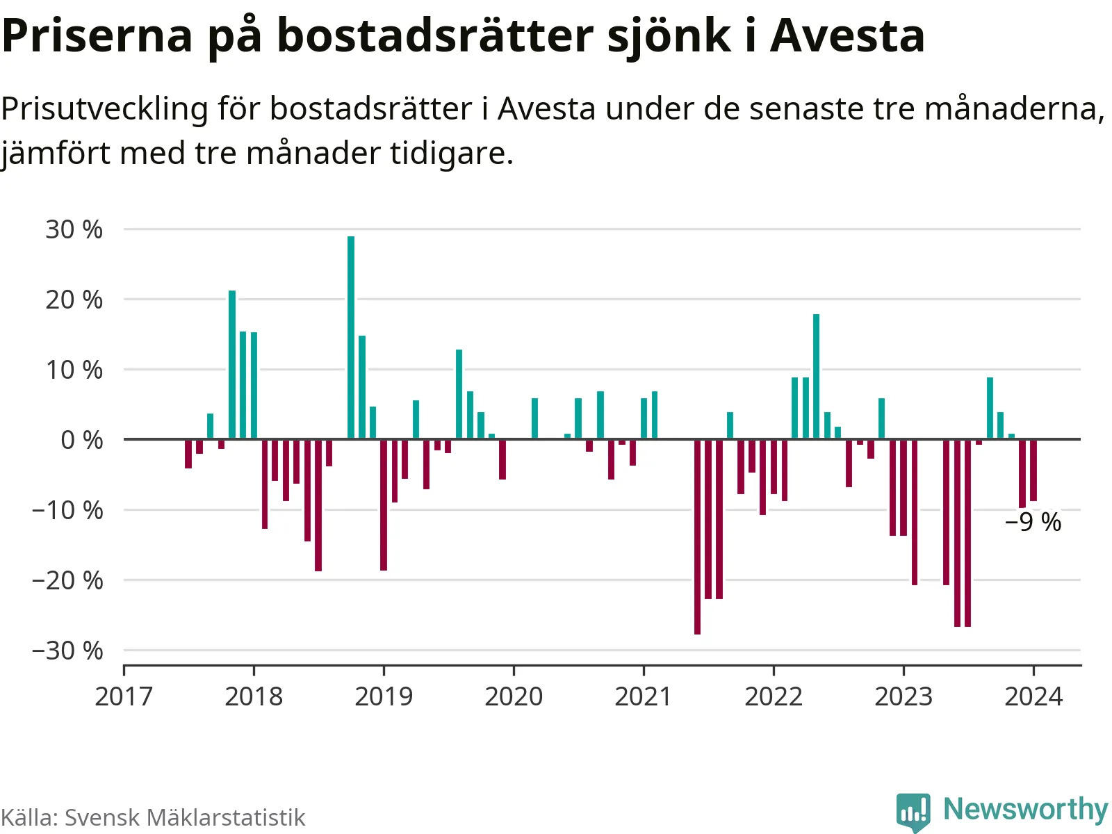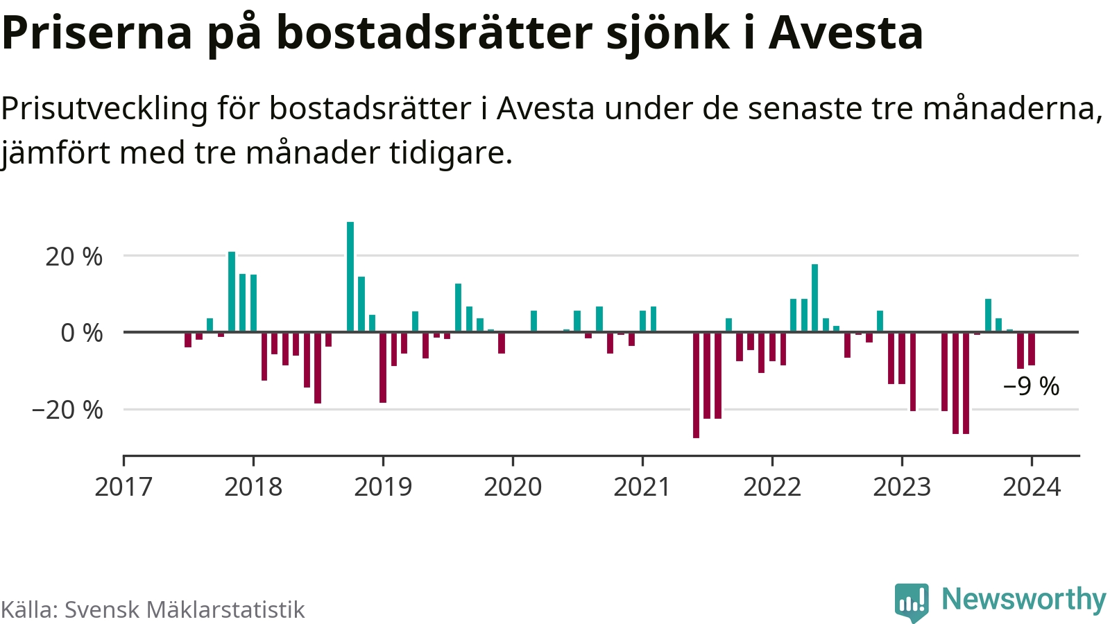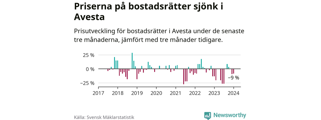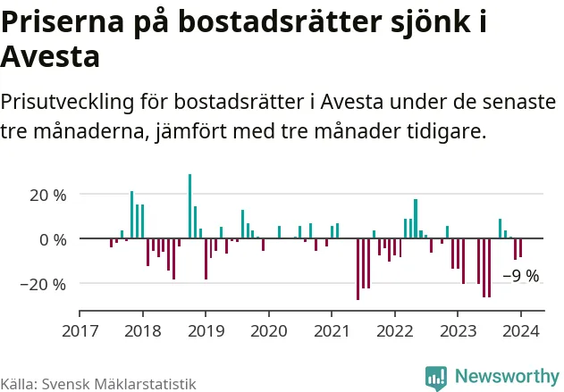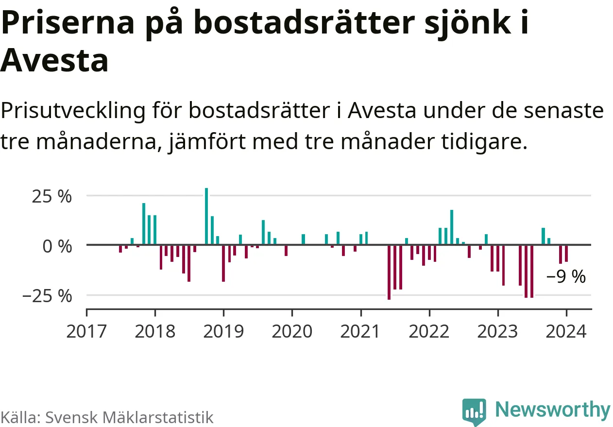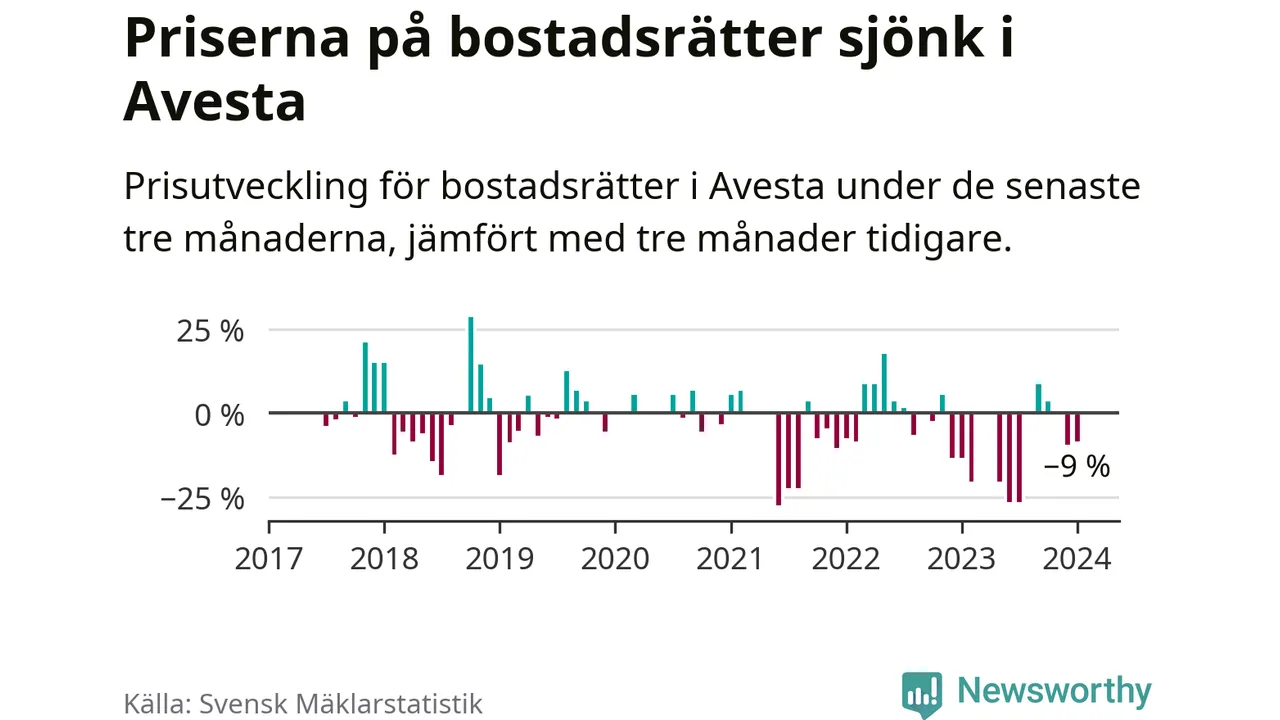 Priserna på bostadsrätter har gått ner i Avesta kommun. Medelpriset på försäljningarna under de senaste tre månaderna visar på en nedgång med 9 procent.