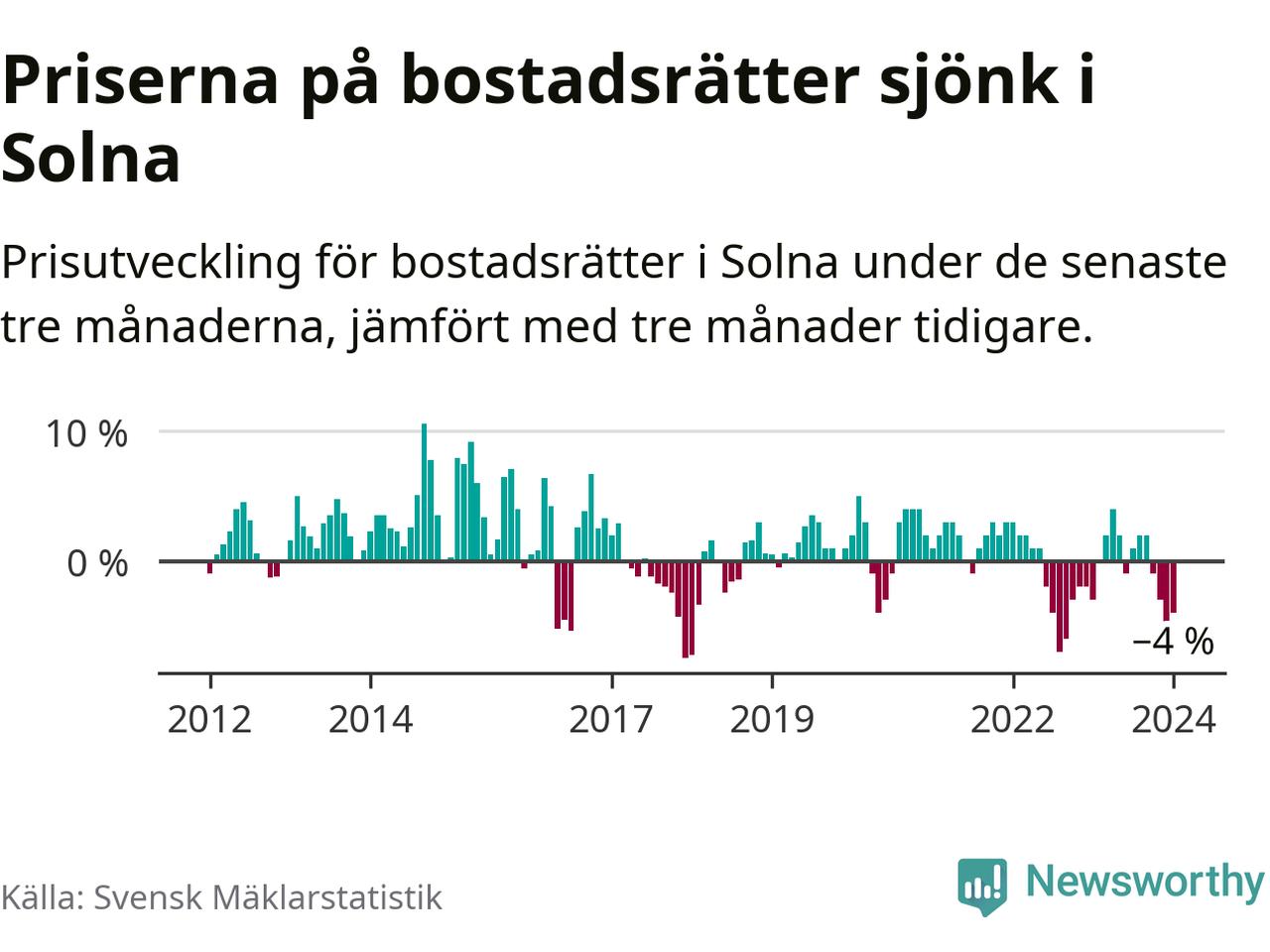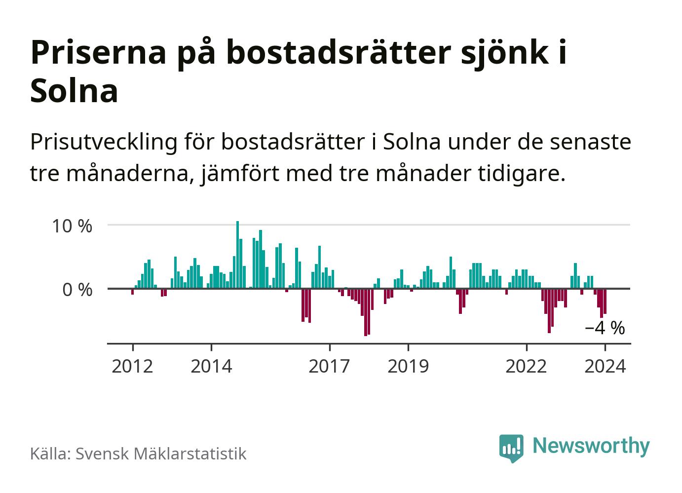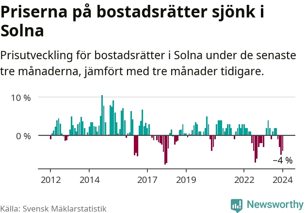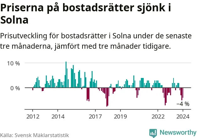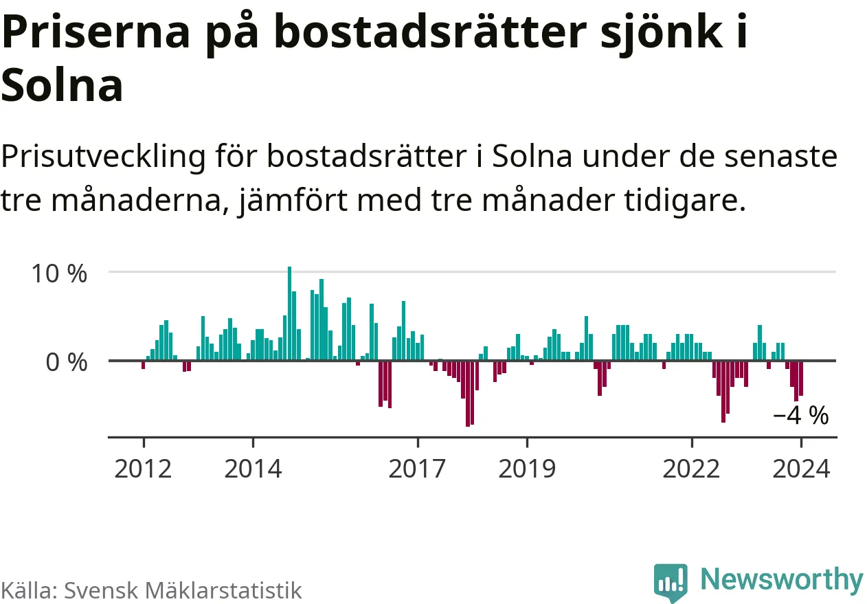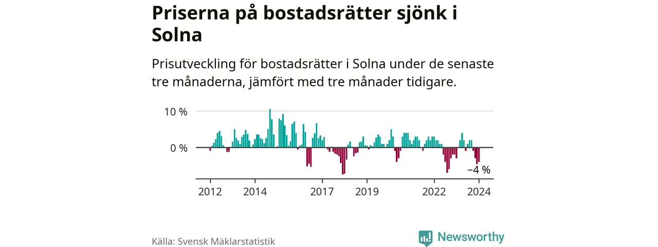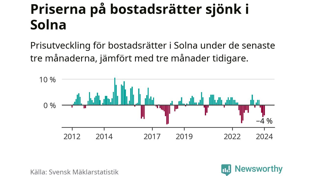 Priserna på bostadsrätter har gått ner i Solna kommun. Medelpriset på försäljningarna under de senaste tre månaderna visar på en nedgång med 4 procent.
