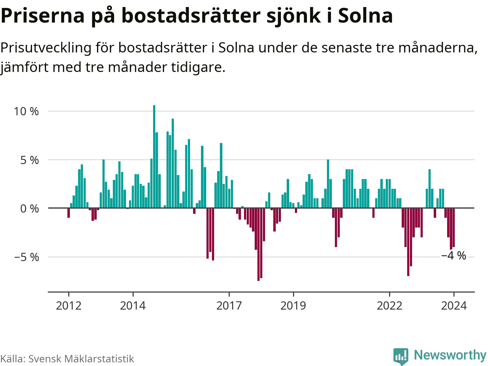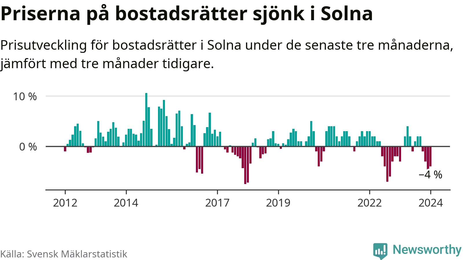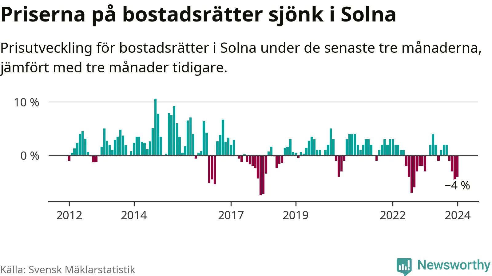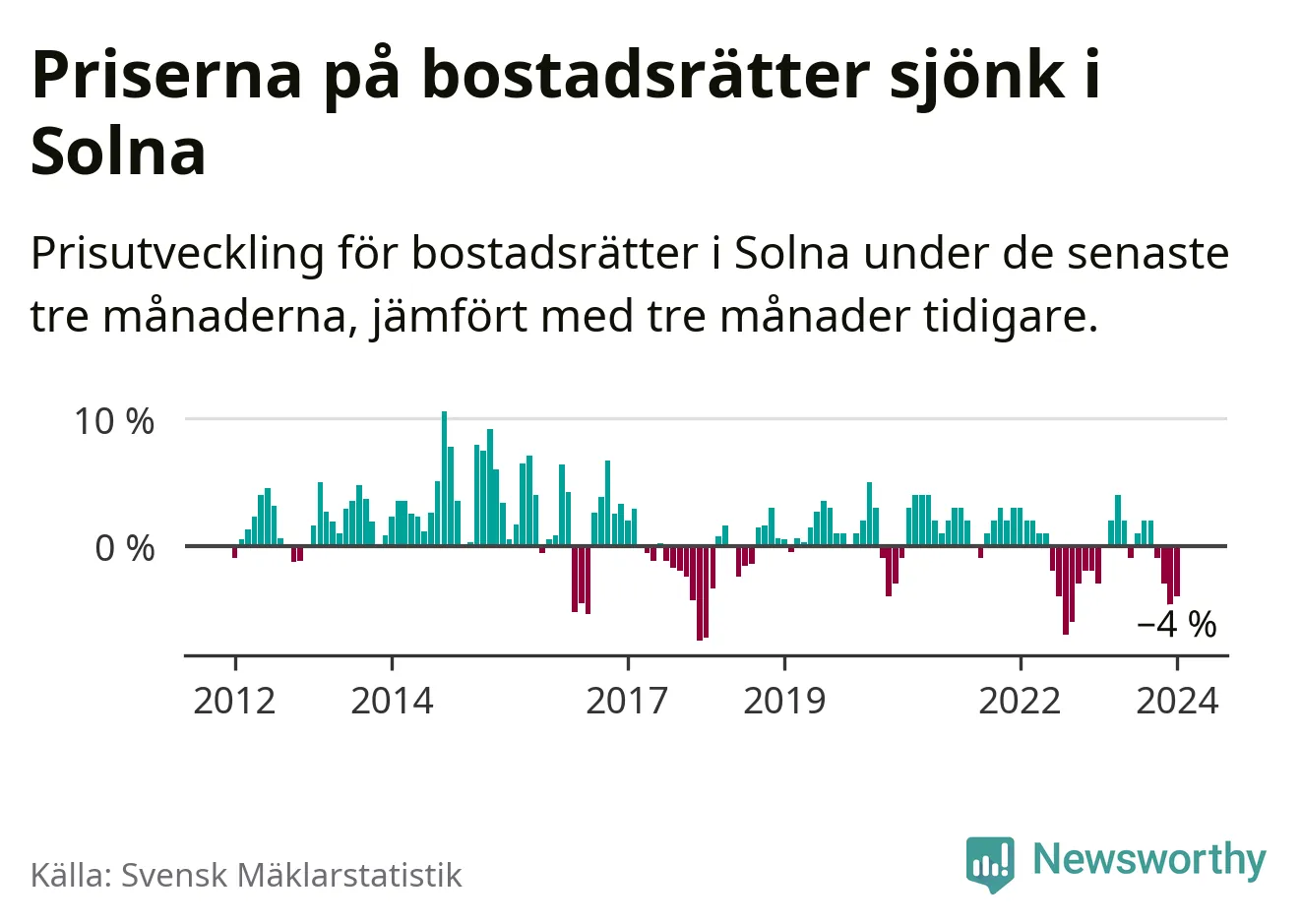 Priserna på bostadsrätter har gått ner i Solna kommun. Medelpriset på försäljningarna under de senaste tre månaderna visar på en nedgång med 4 procent.