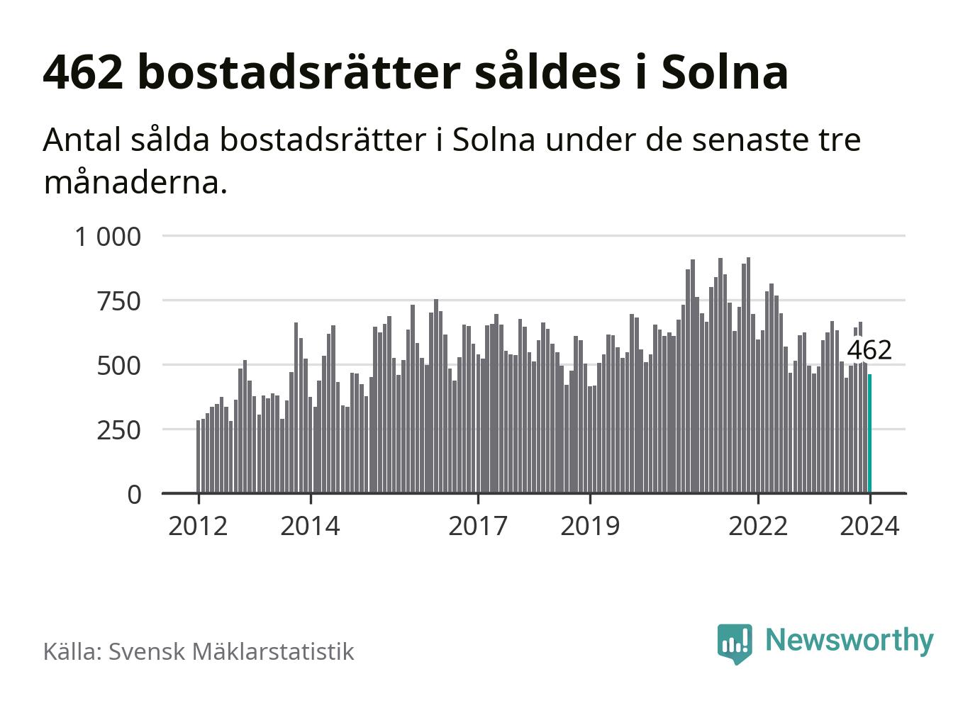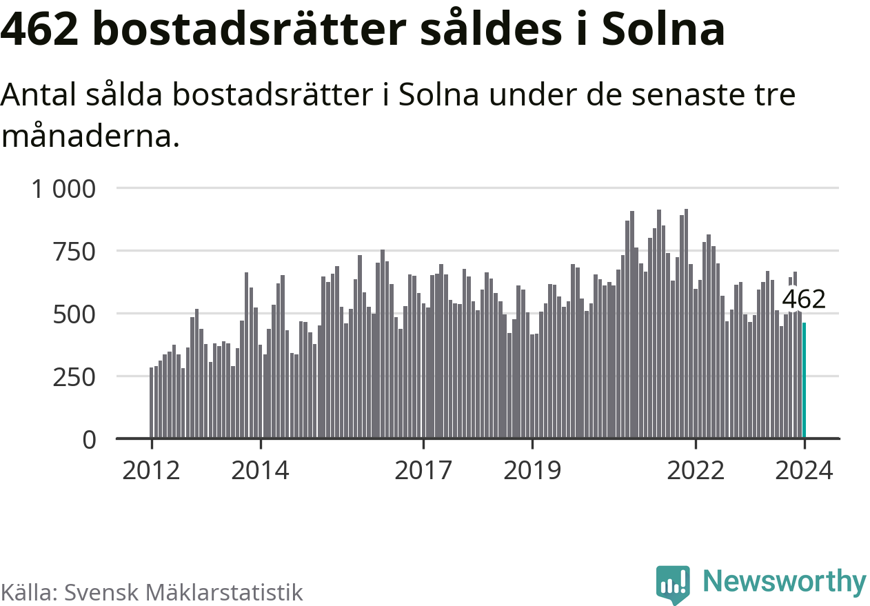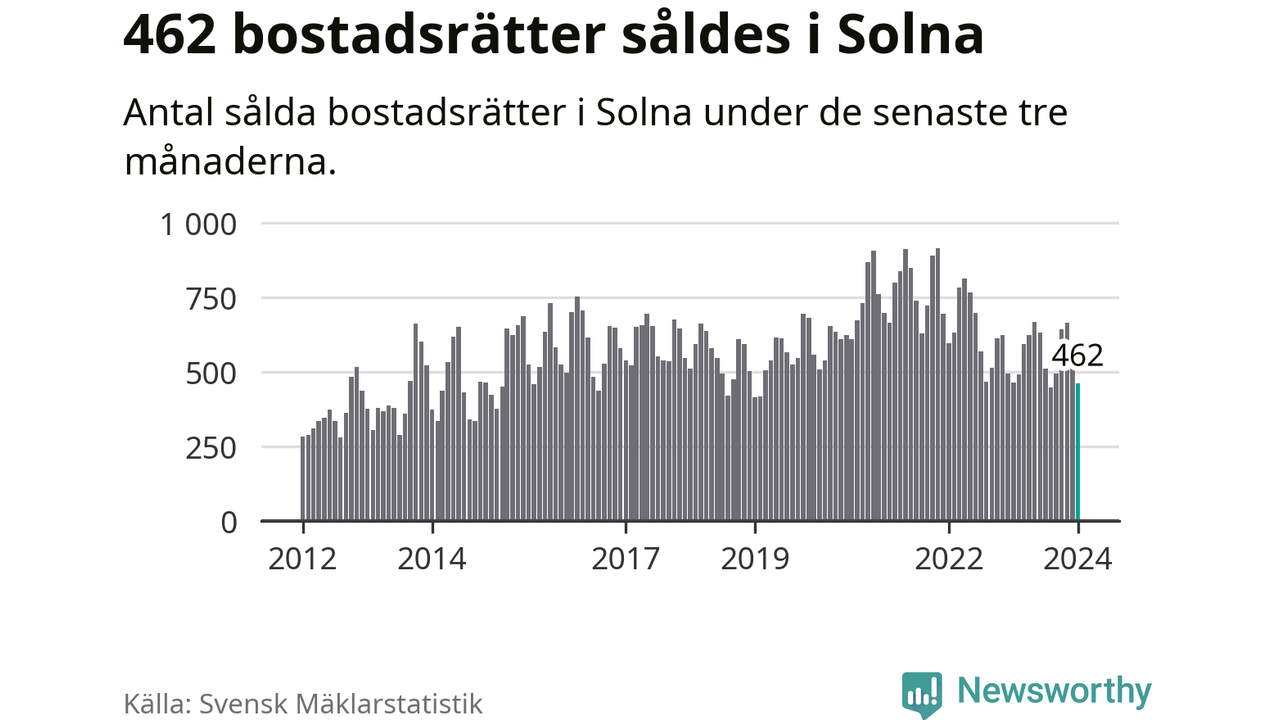 Sammanlagt såldes 462 bostadsrätter i Solna kommun mellan november och januari till ett genomsnittligt pris på 3,7 miljoner kronor. I fjol gjordes 465 affärer vid den här tiden på året.