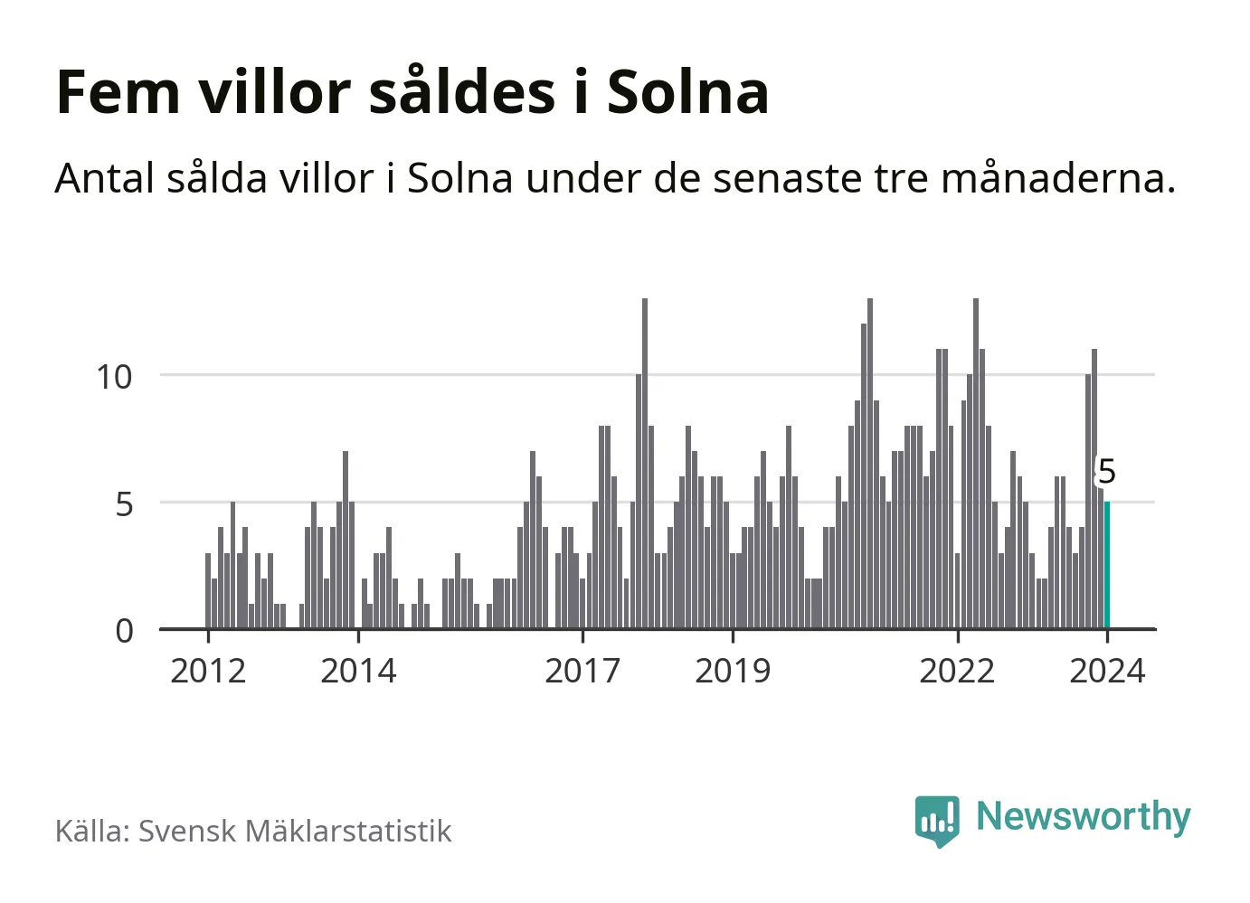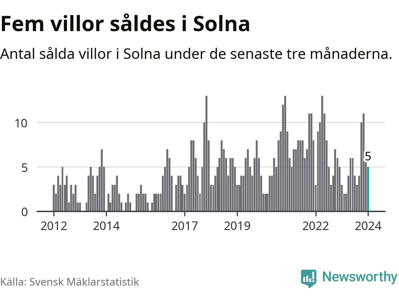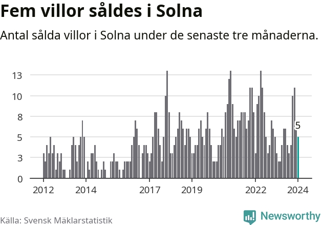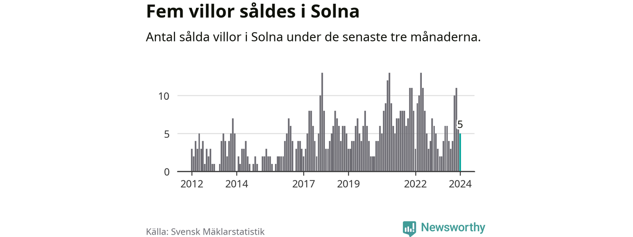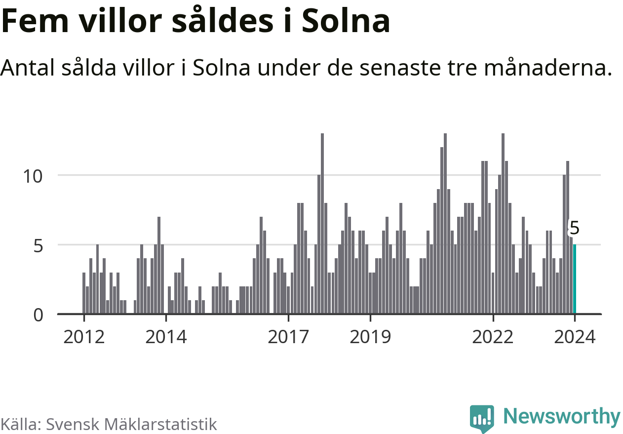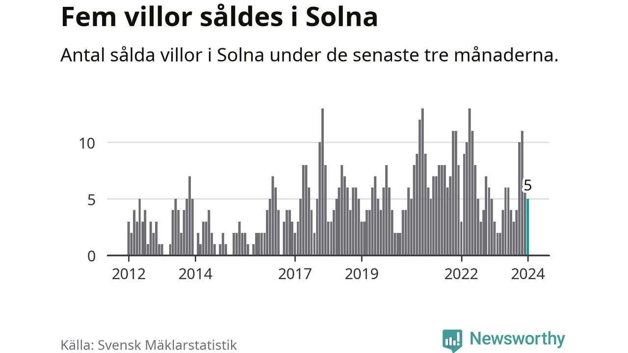 Mellan november och januari gjordes sammanlagt fem affärer med villor i Solna kommun. Det kan jämföras med tre vid motsvarande tid i fjol.