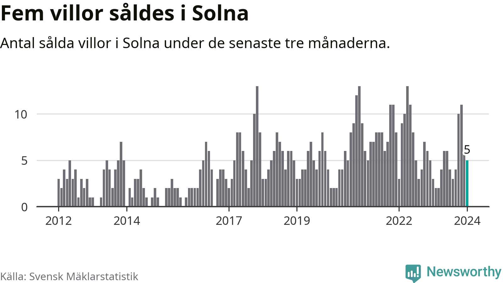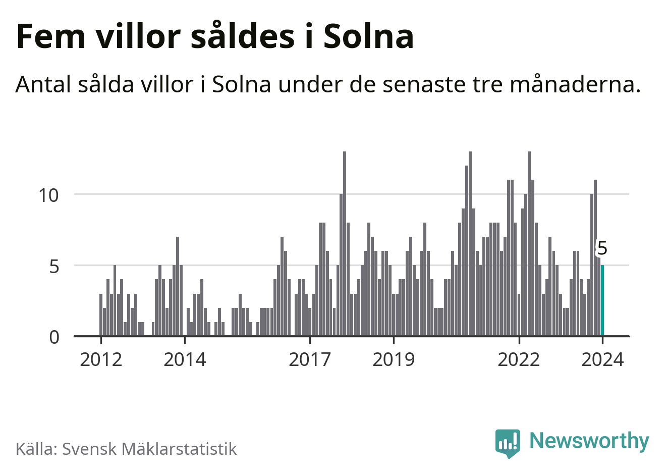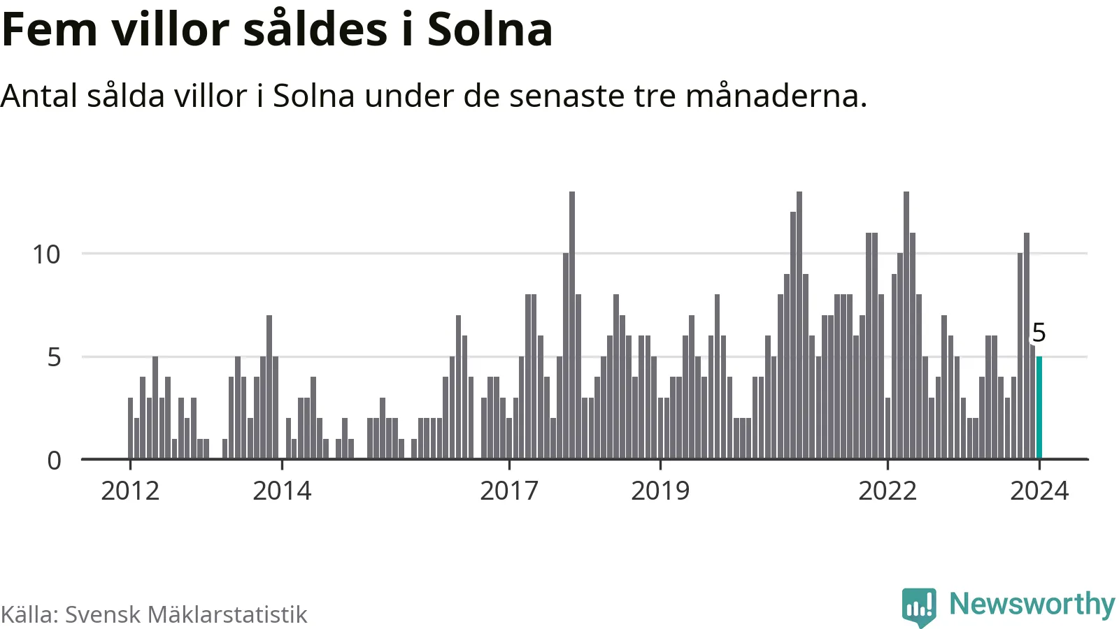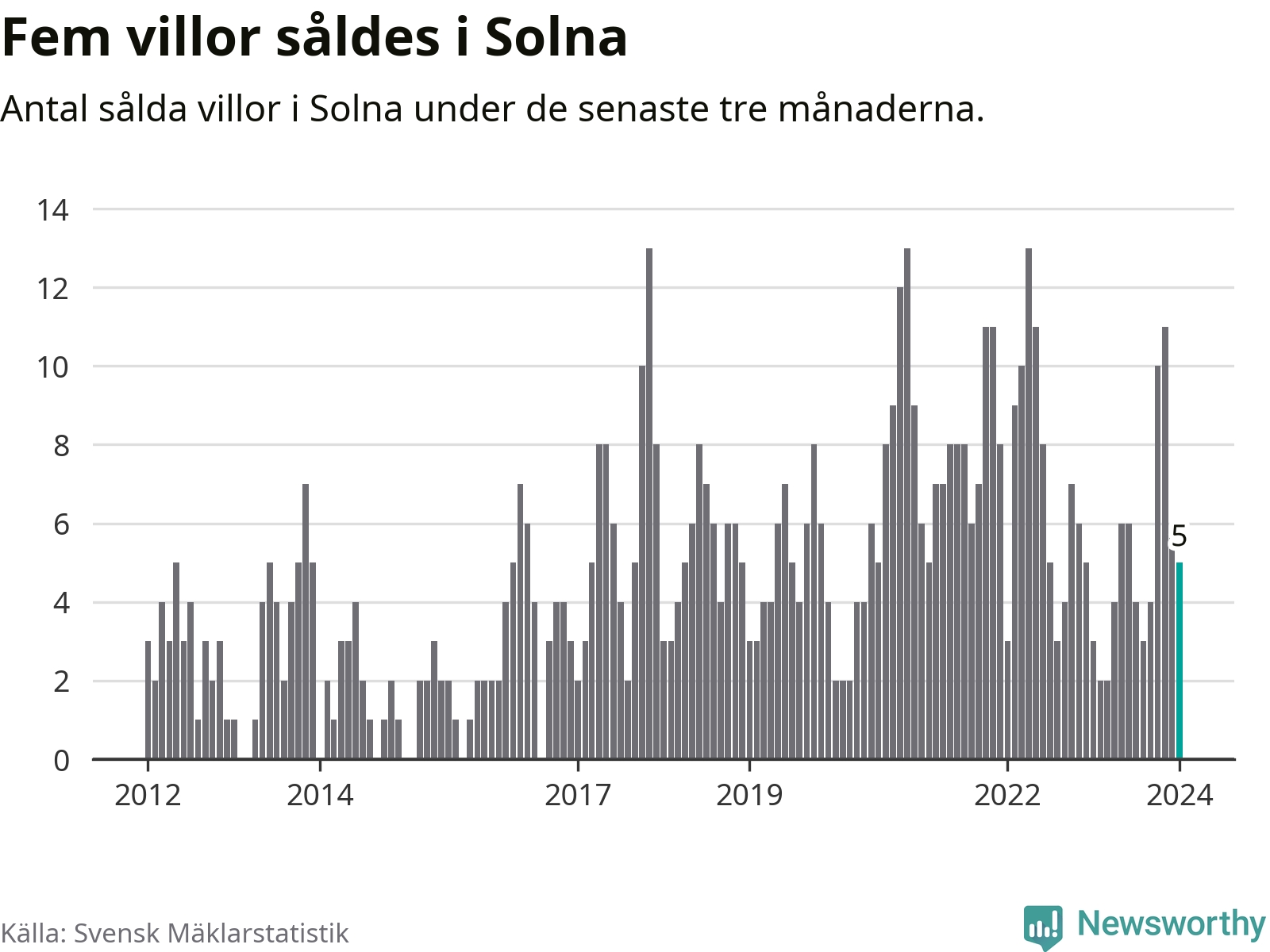 Mellan november och januari gjordes sammanlagt fem affärer med villor i Solna kommun. Det kan jämföras med tre vid motsvarande tid i fjol.