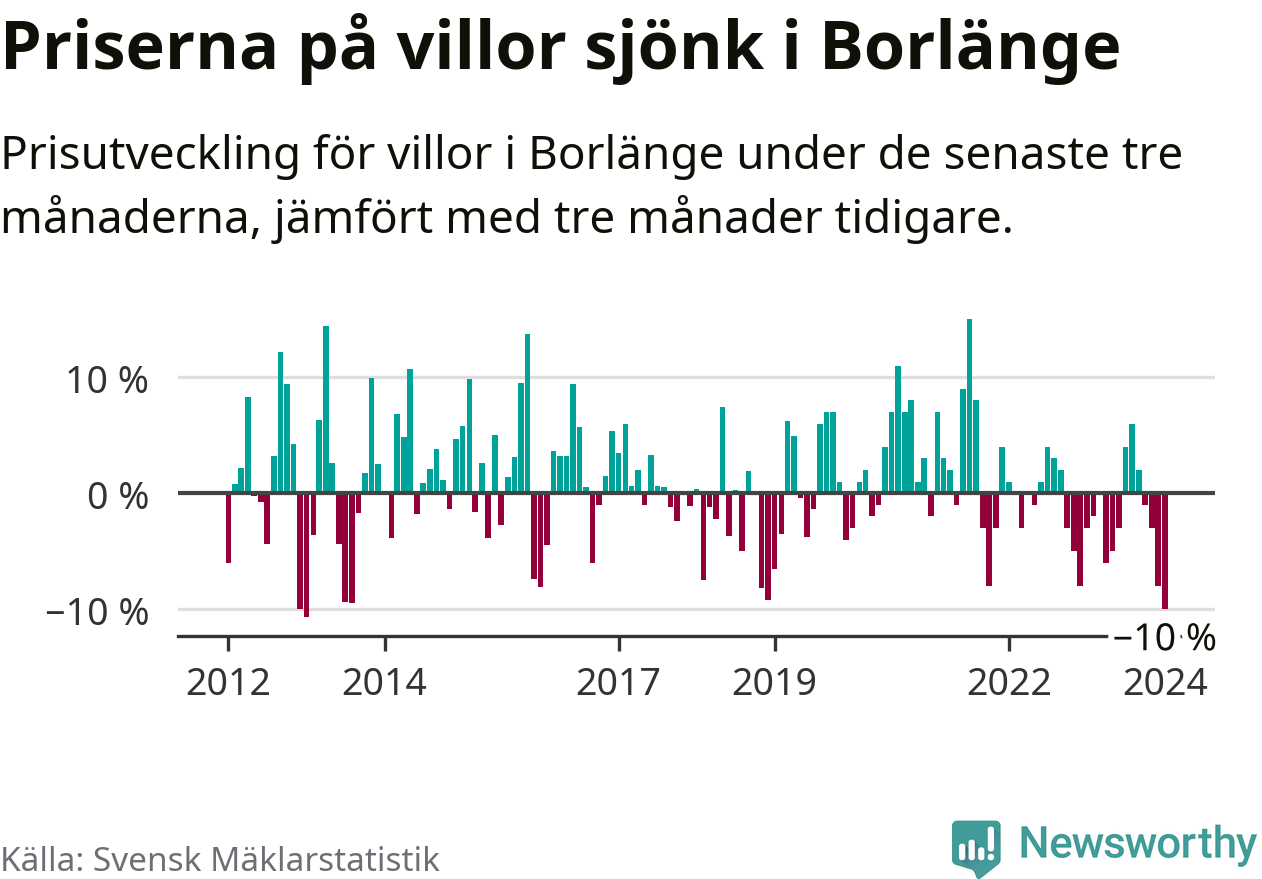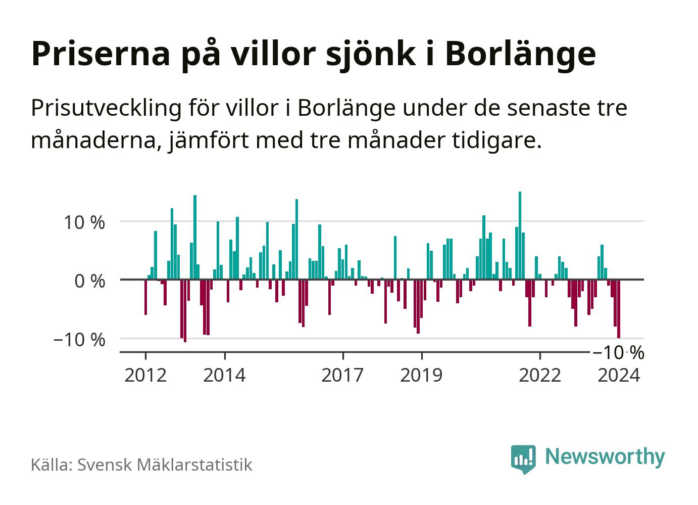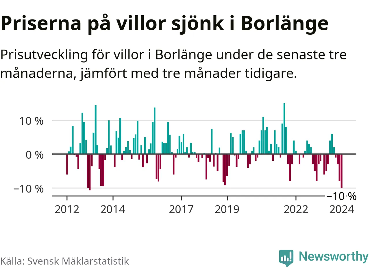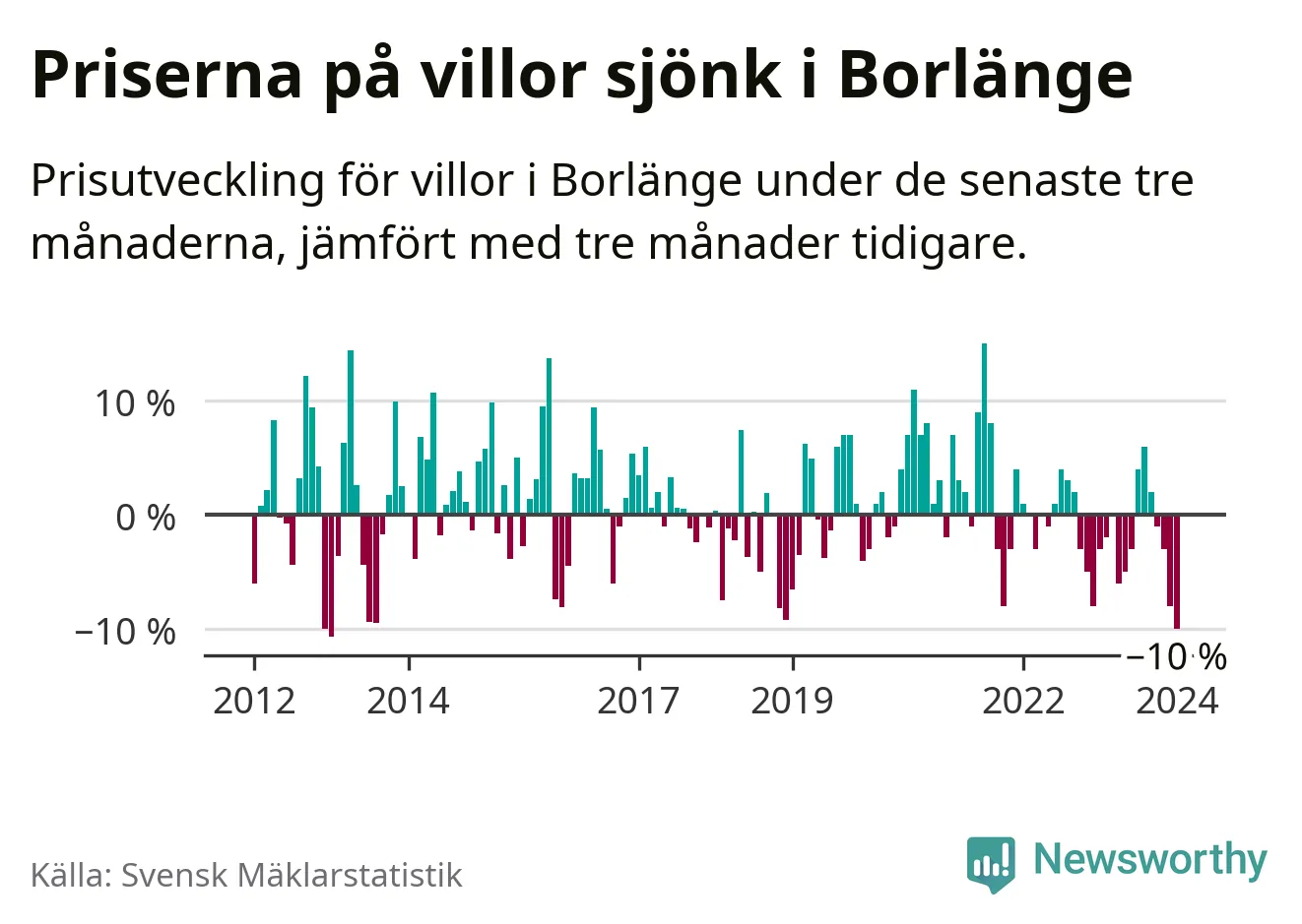 Villapriserna sjönk med tio procent i Borlänge kommun under de senaste tre månaderna. Det är den svagaste prisutvecklingen sedan 2013.