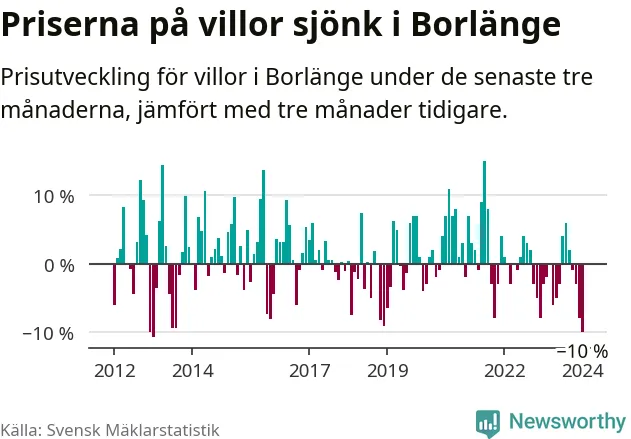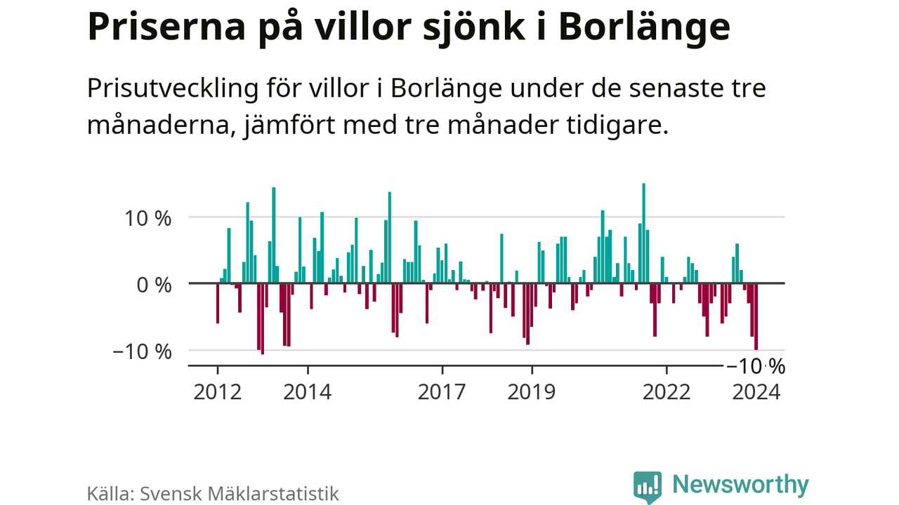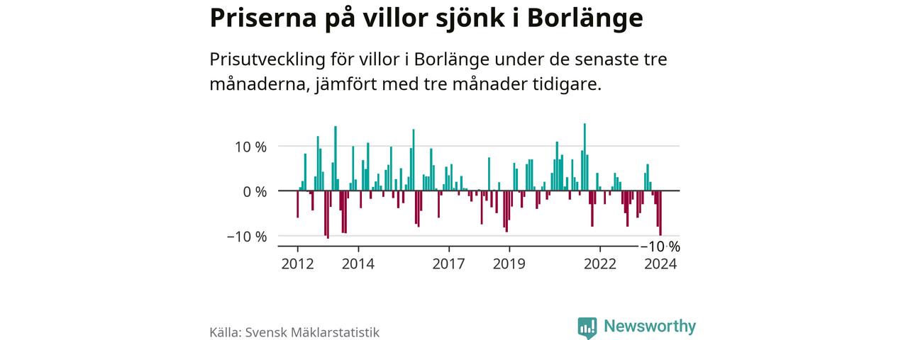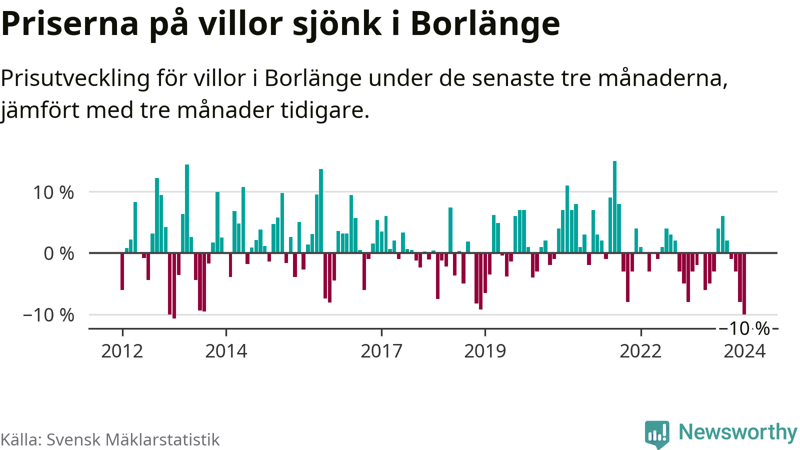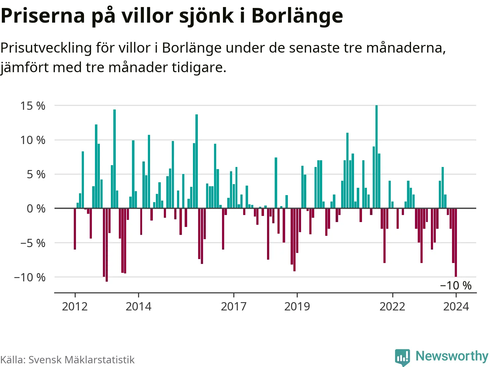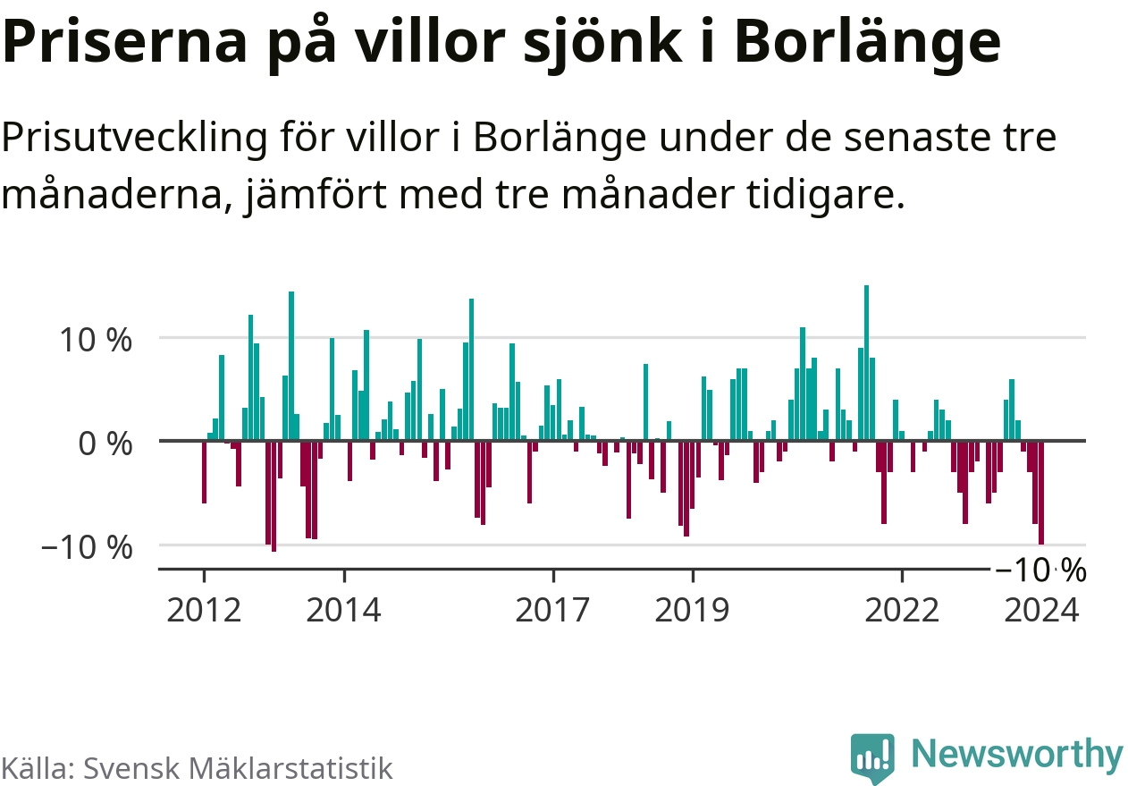 Villapriserna sjönk med tio procent i Borlänge kommun under de senaste tre månaderna. Det är den svagaste prisutvecklingen sedan 2013.