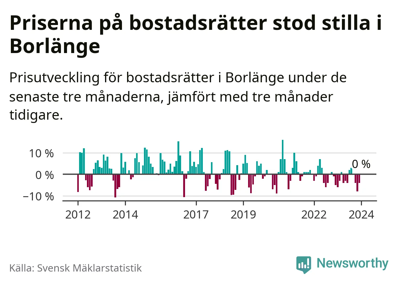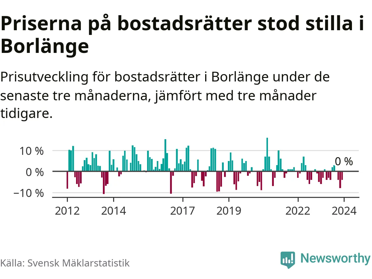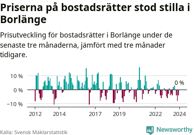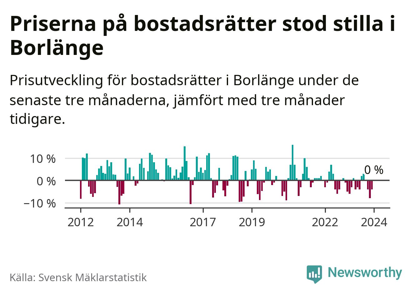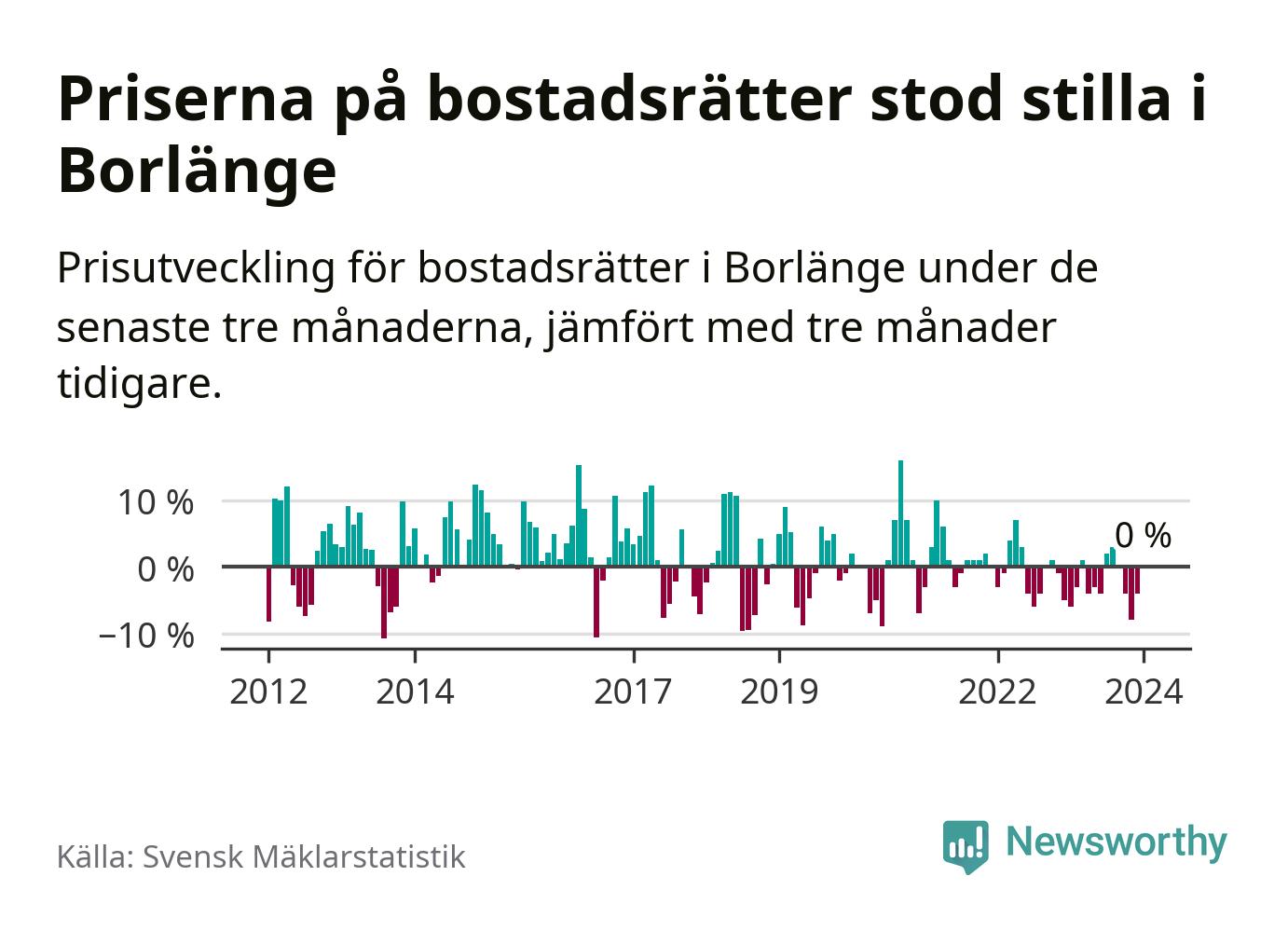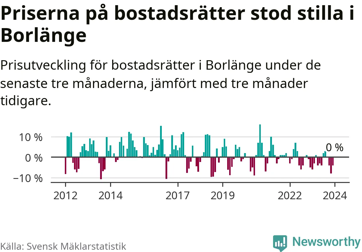 Priserna på bostadsrätter står i stort sett stilla i Borlänge kommun. Medelpriset på de på försäljningarna under de senaste tre månaderna låg på samma nivå som för tre månader sedan.