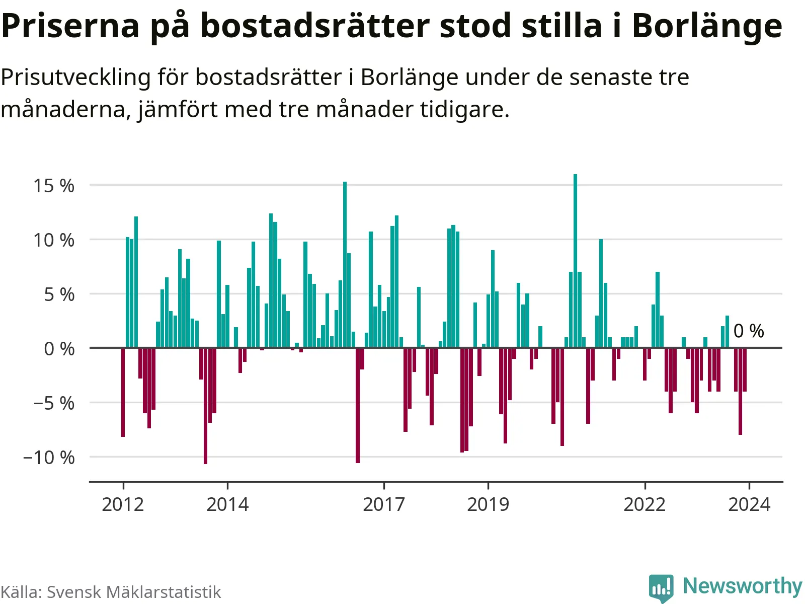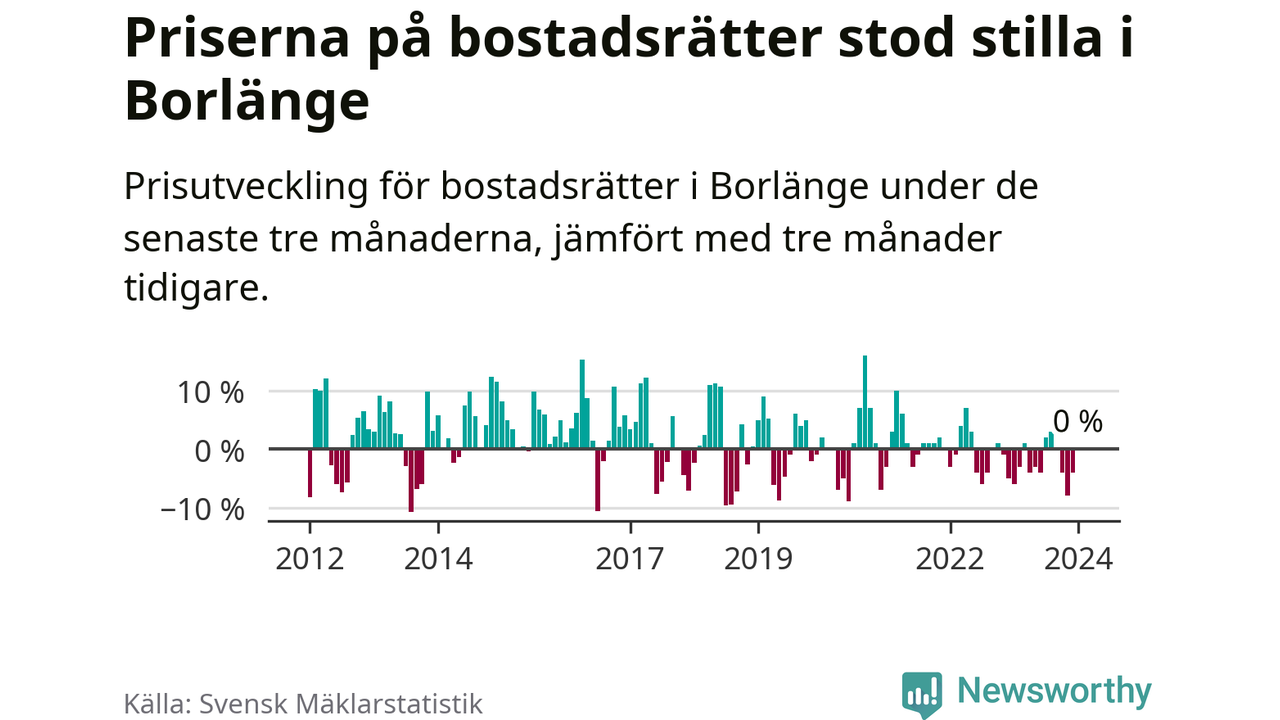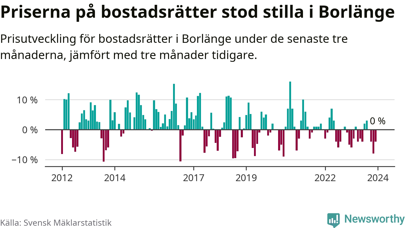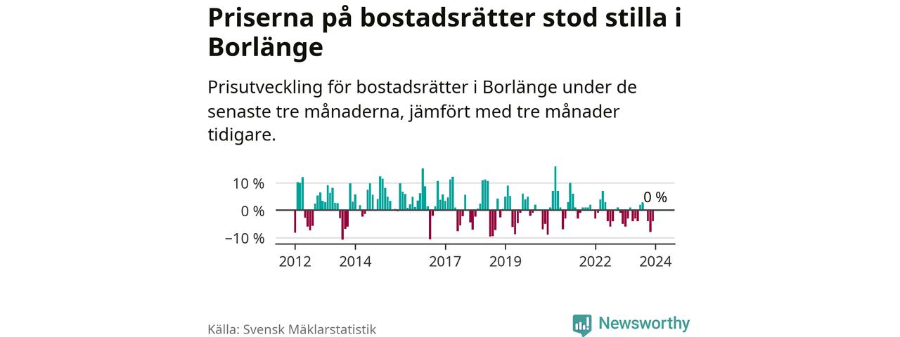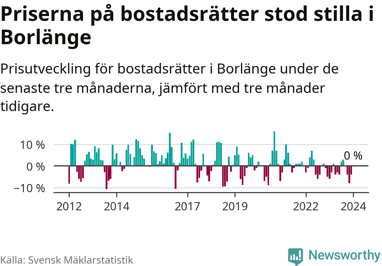 Priserna på bostadsrätter står i stort sett stilla i Borlänge kommun. Medelpriset på de på försäljningarna under de senaste tre månaderna låg på samma nivå som för tre månader sedan.