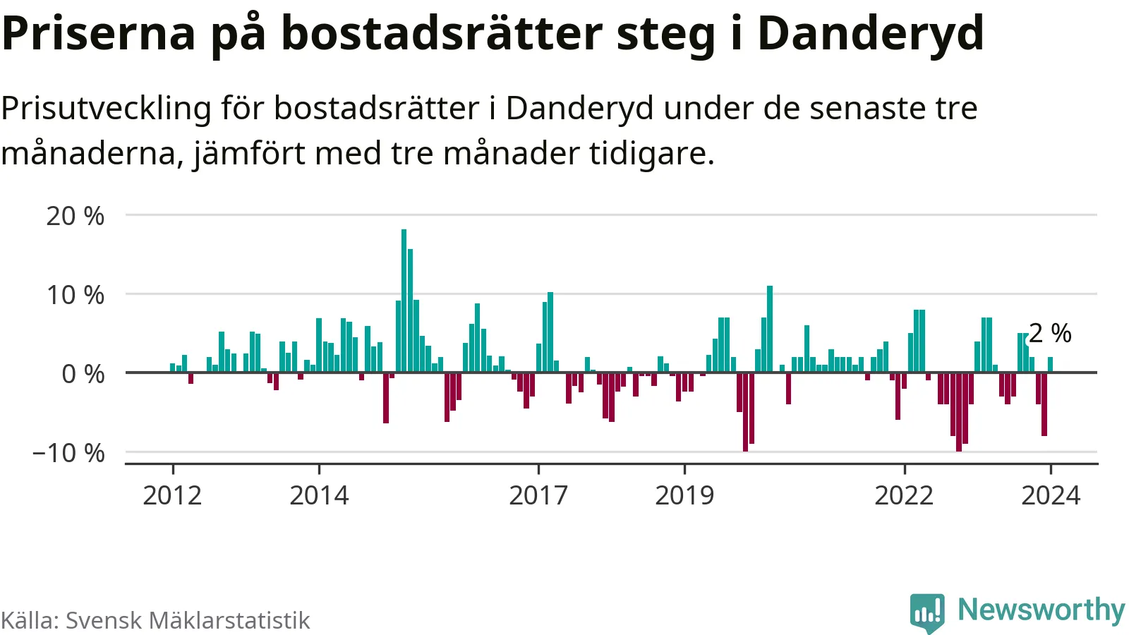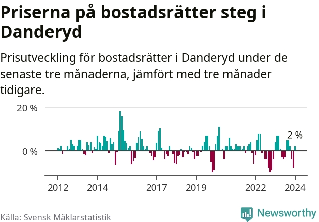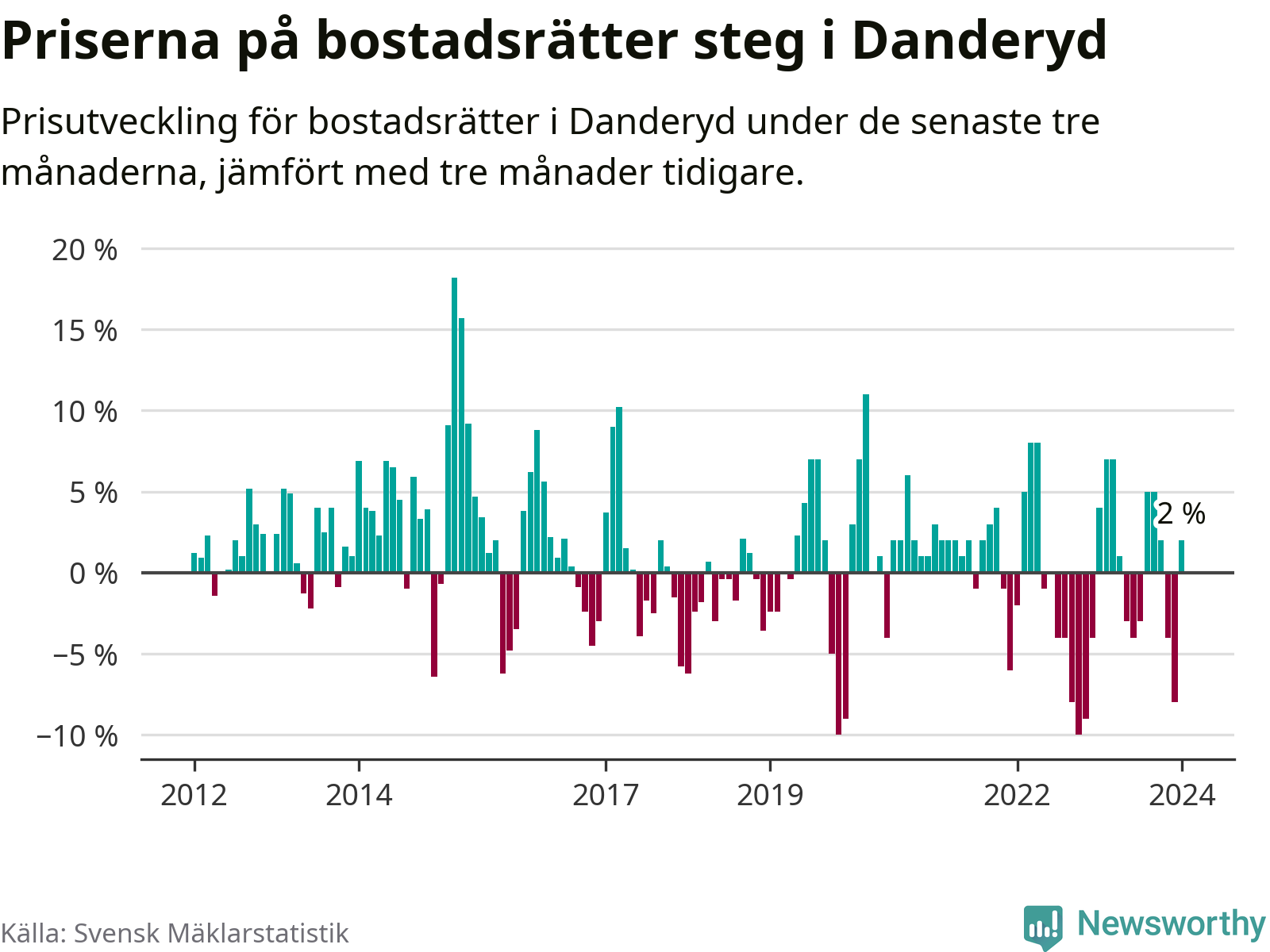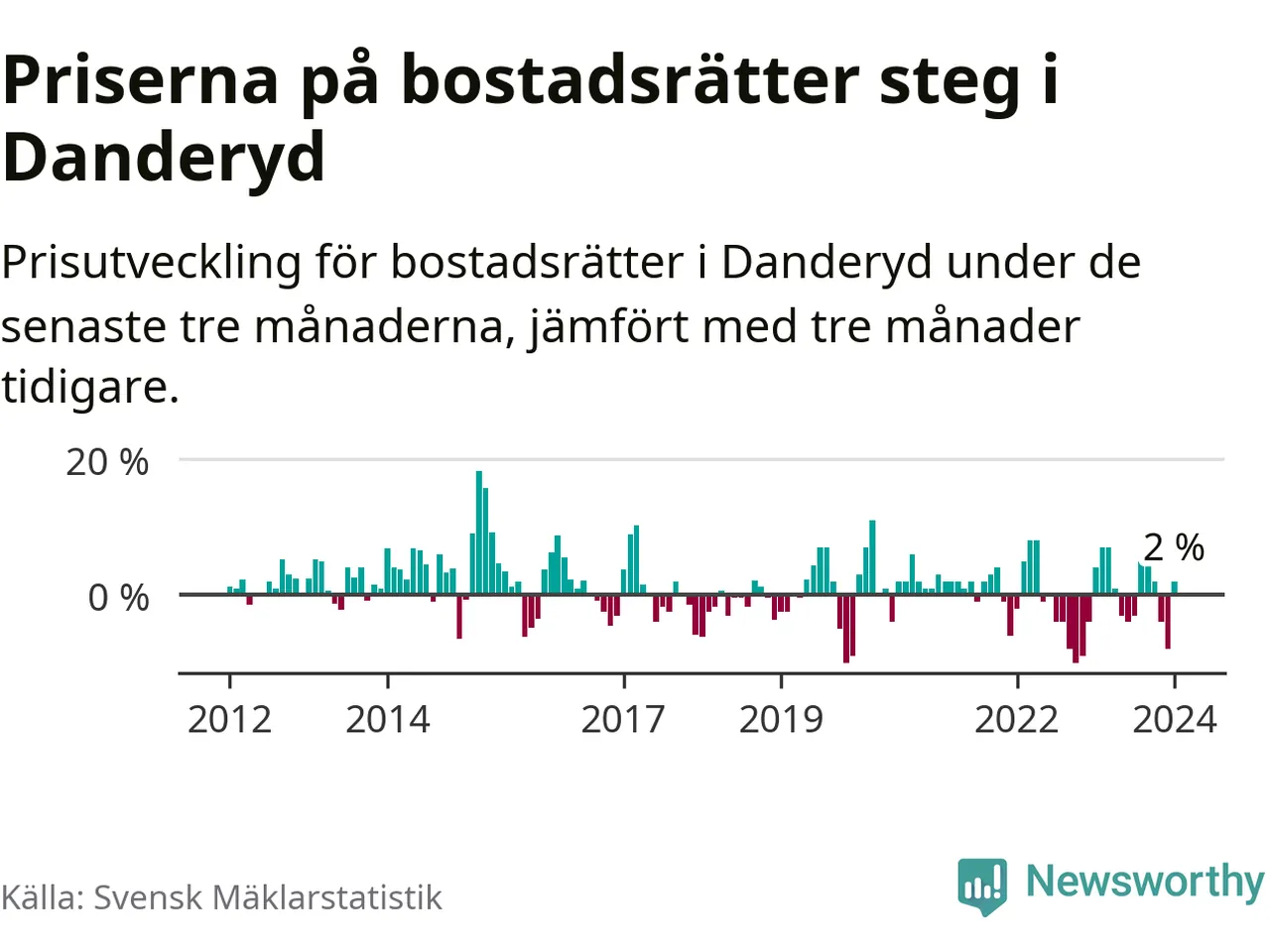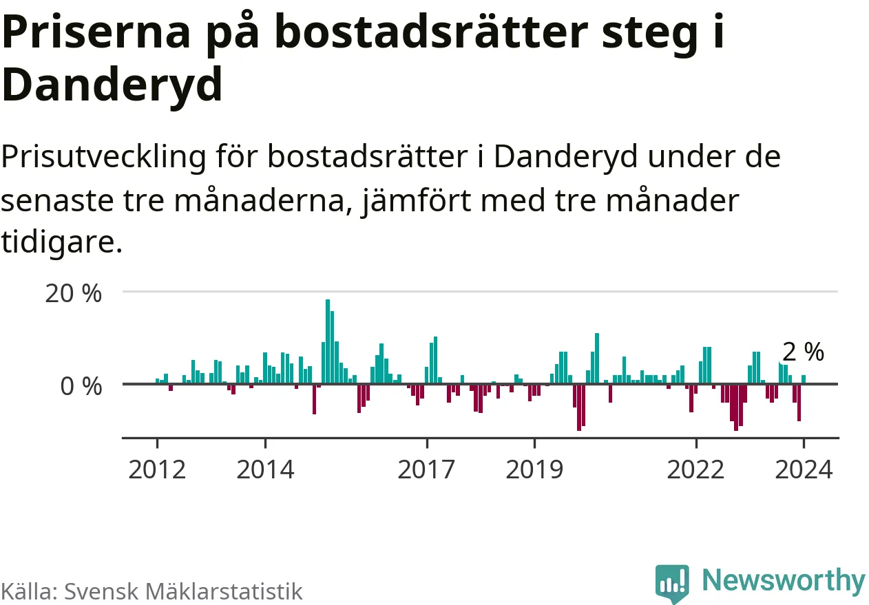 Priserna på bostadsrätter har gått upp i Danderyds kommun. Medelpriset på försäljningarna under de senaste tre månaderna visar på en uppgång med 2 procent.