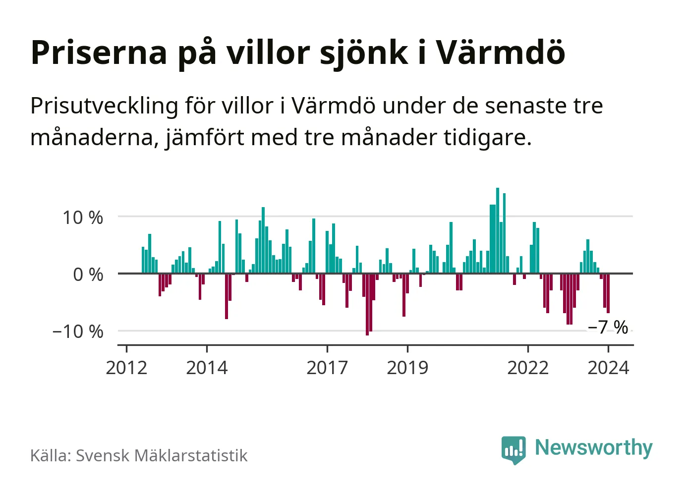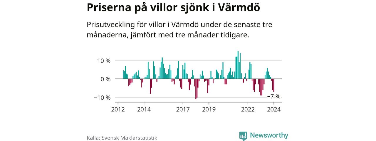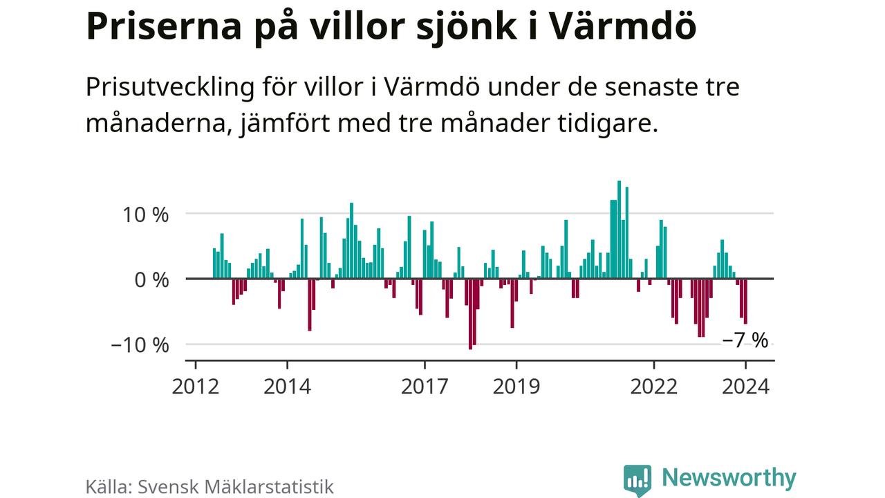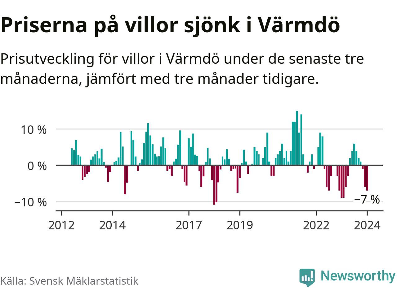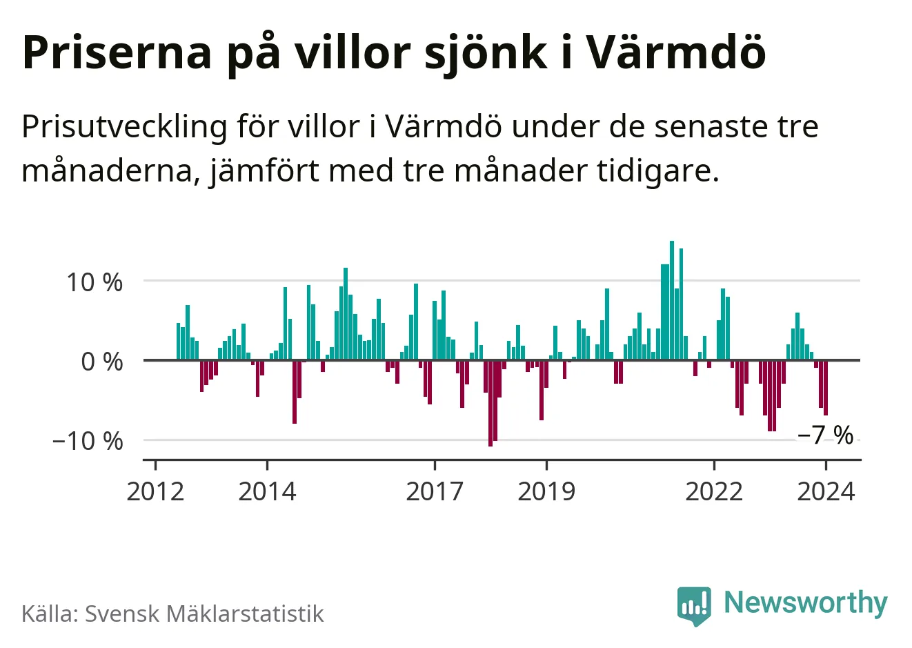 Statistiken visar även på en kännbar prisnedgång i Värmdö kommun. Medelpriset på försäljningarna av villor i kommunen var 7 procent lägre än för tre månader sedan. Även i hela Stockholms län sjunker villapriserna. I hela länet noterades en prisnedgång på 2 procent.