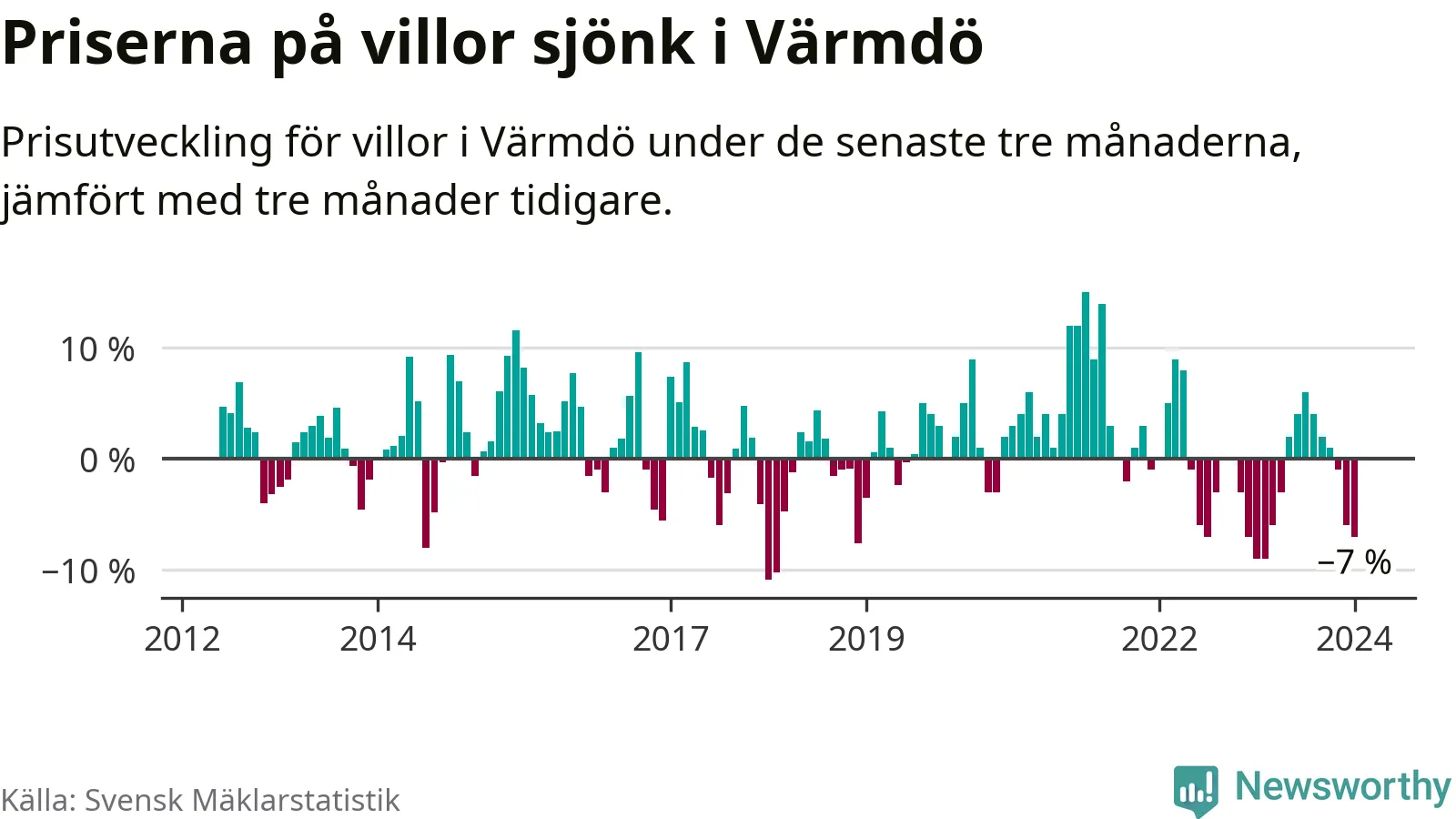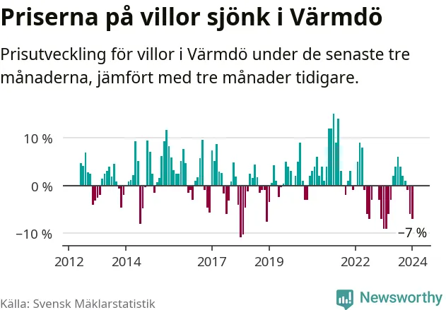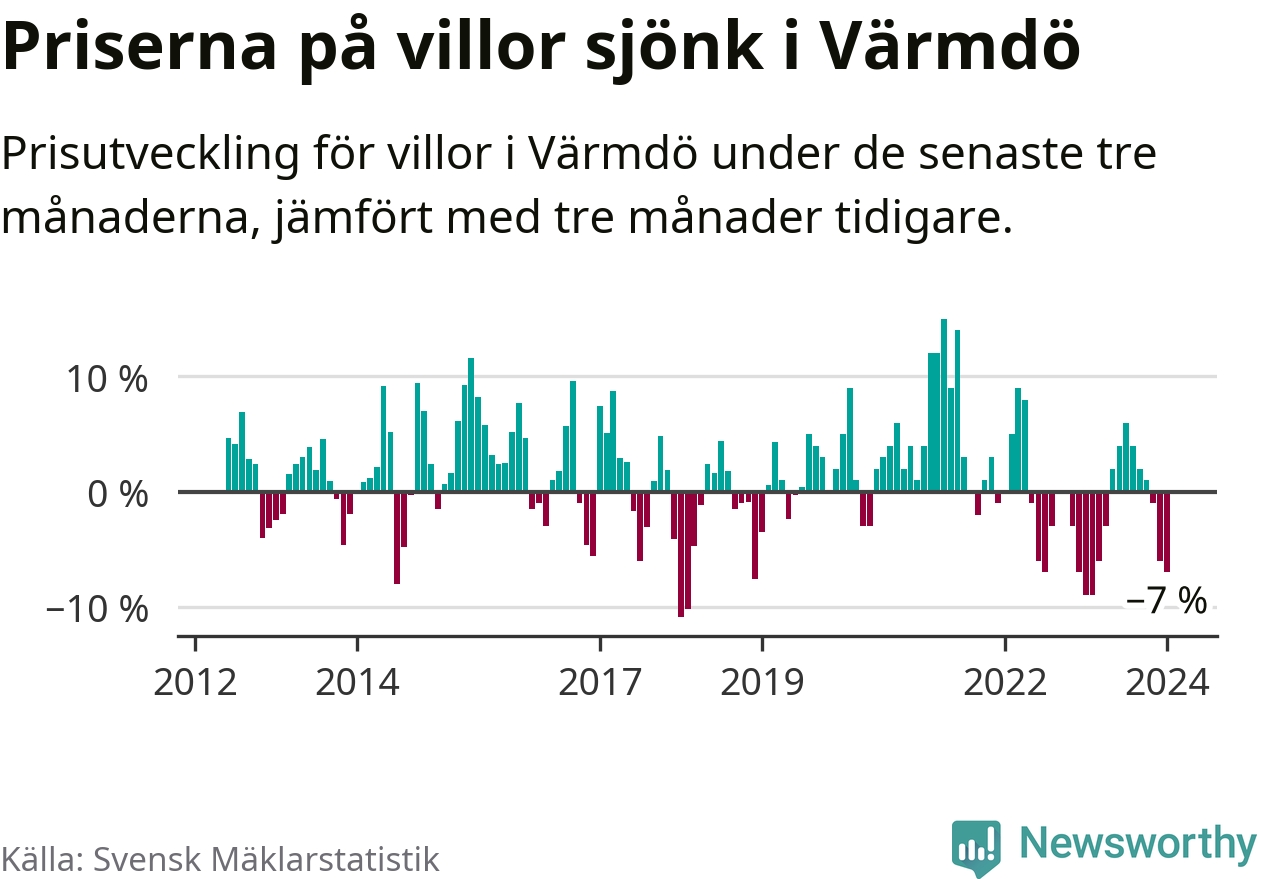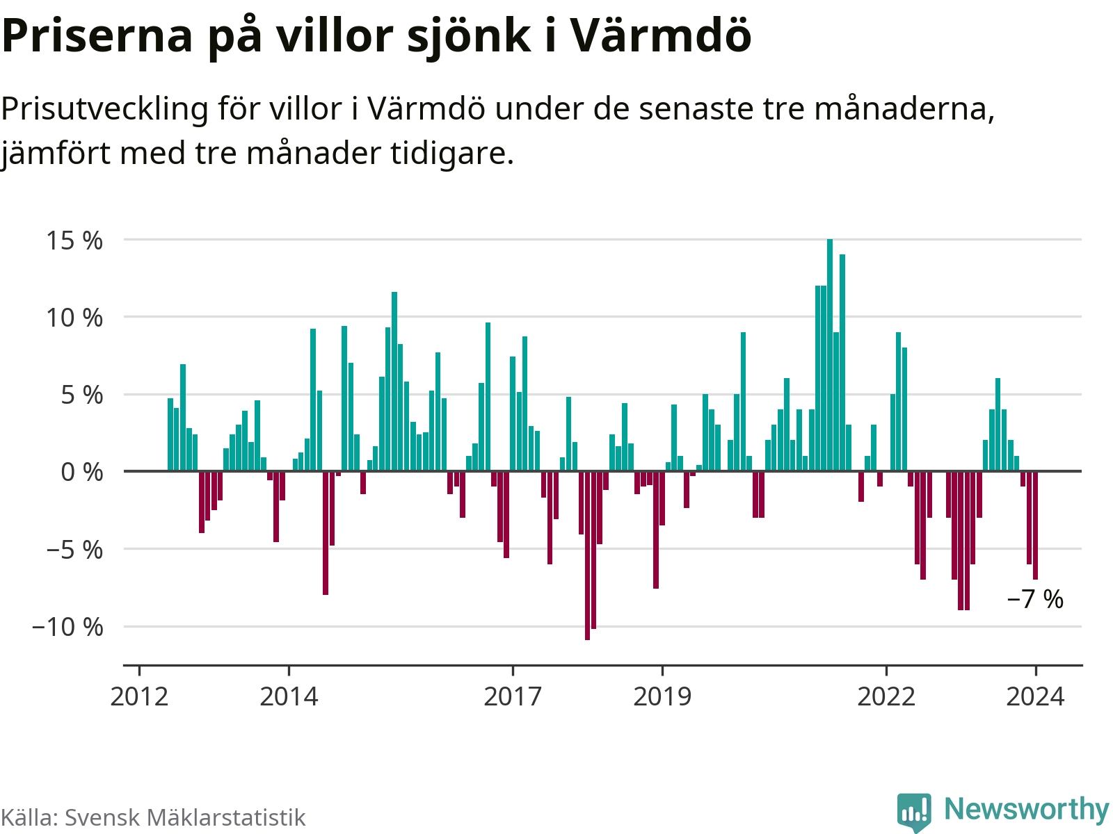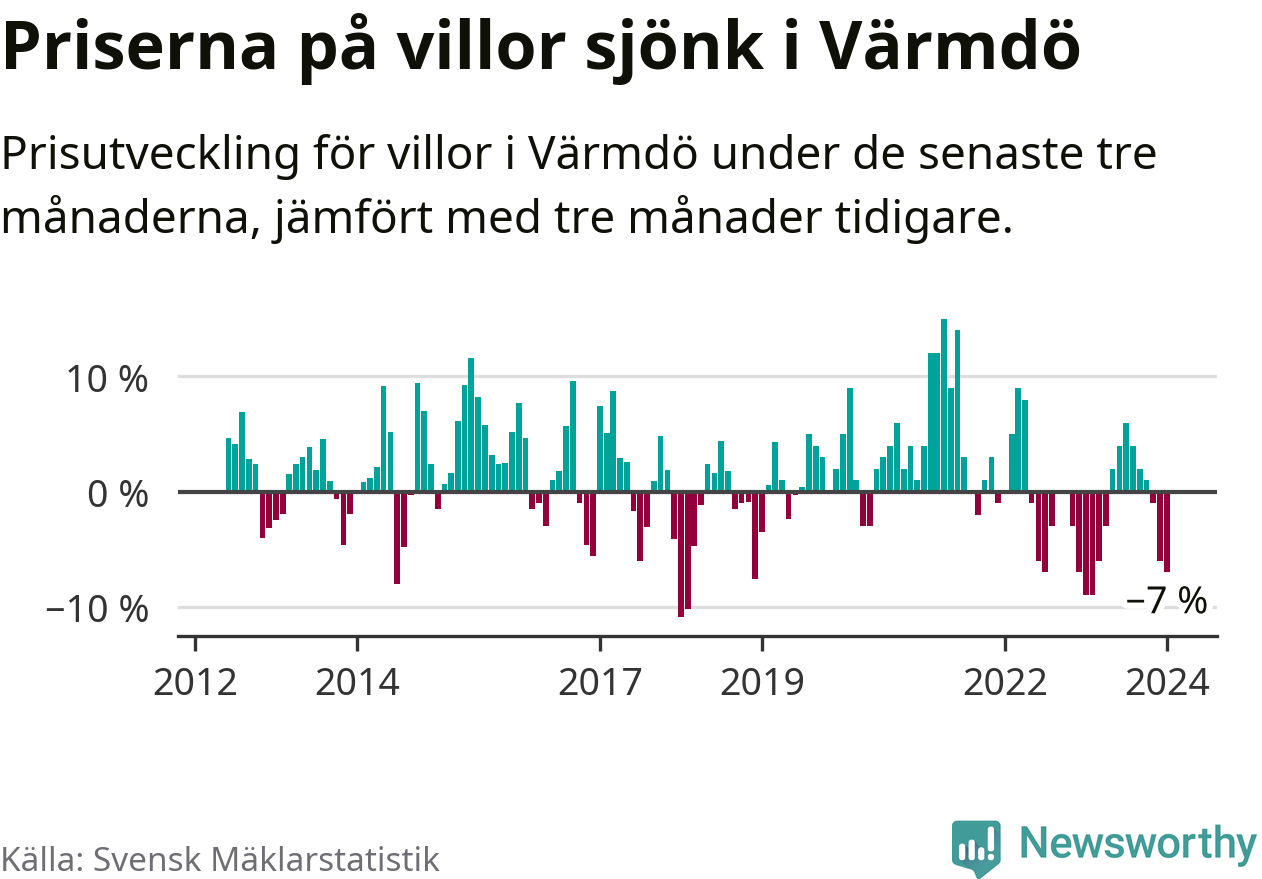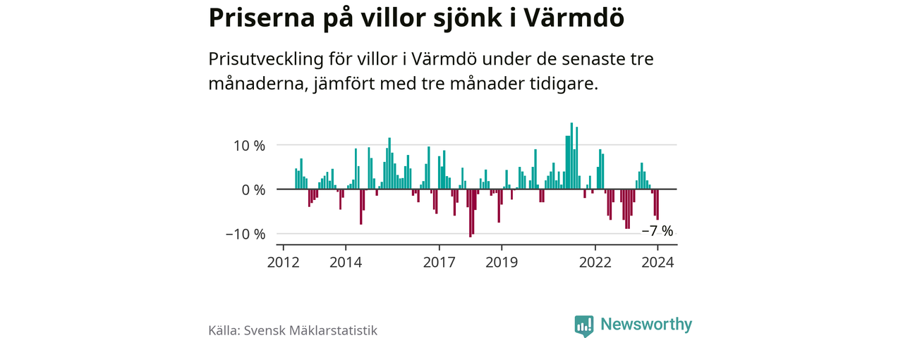 Statistiken visar även på en kännbar prisnedgång i Värmdö kommun. Medelpriset på försäljningarna av villor i kommunen var 7 procent lägre än för tre månader sedan. Även i hela Stockholms län sjunker villapriserna. I hela länet noterades en prisnedgång på 2 procent.