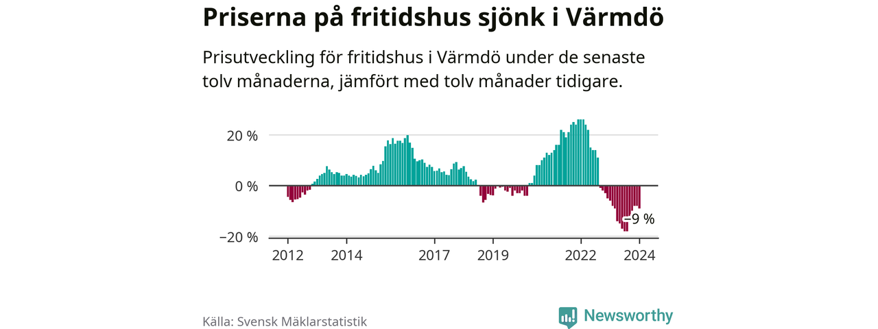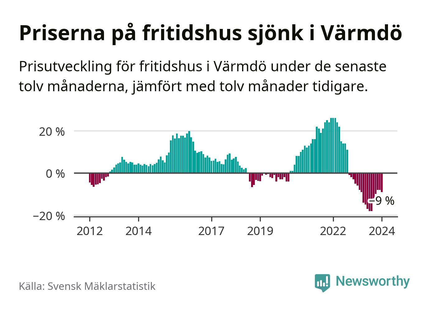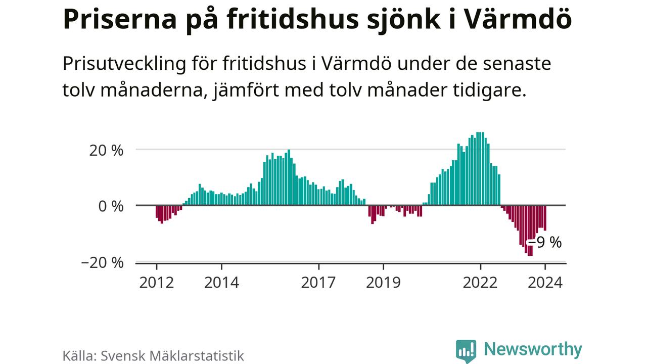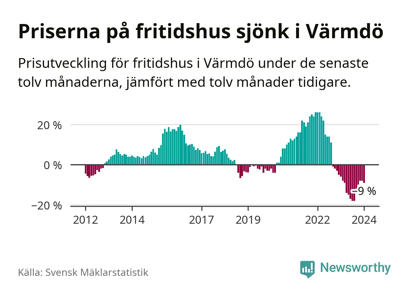 Priserna på fritidshus har gått ner i Värmdö kommun. Medelpriset på försäljningarna under de senaste tolv månaderna visar på en nedgång med 9 procent.