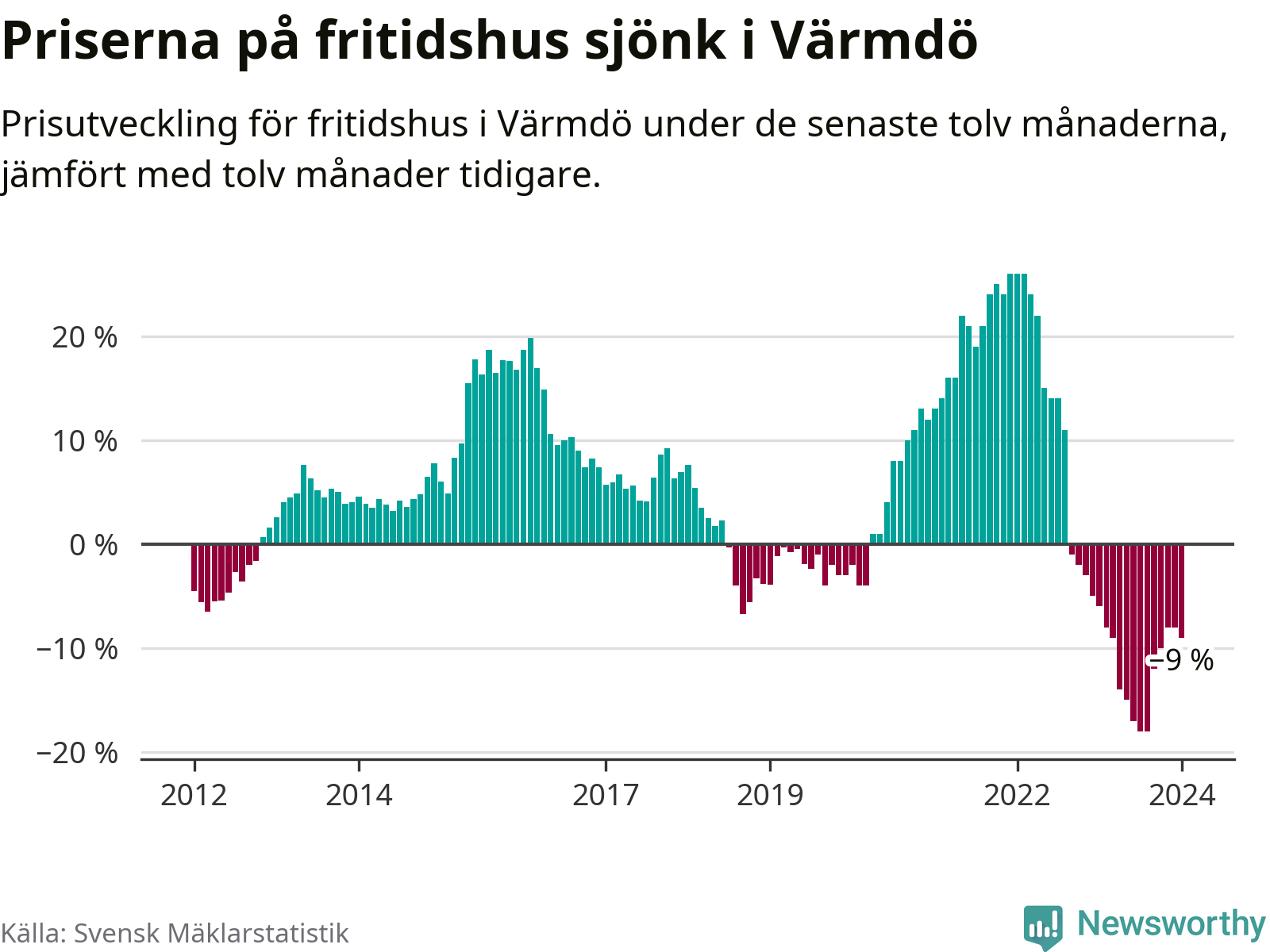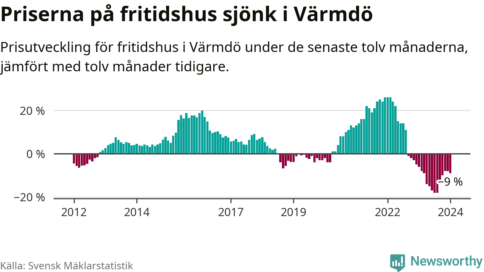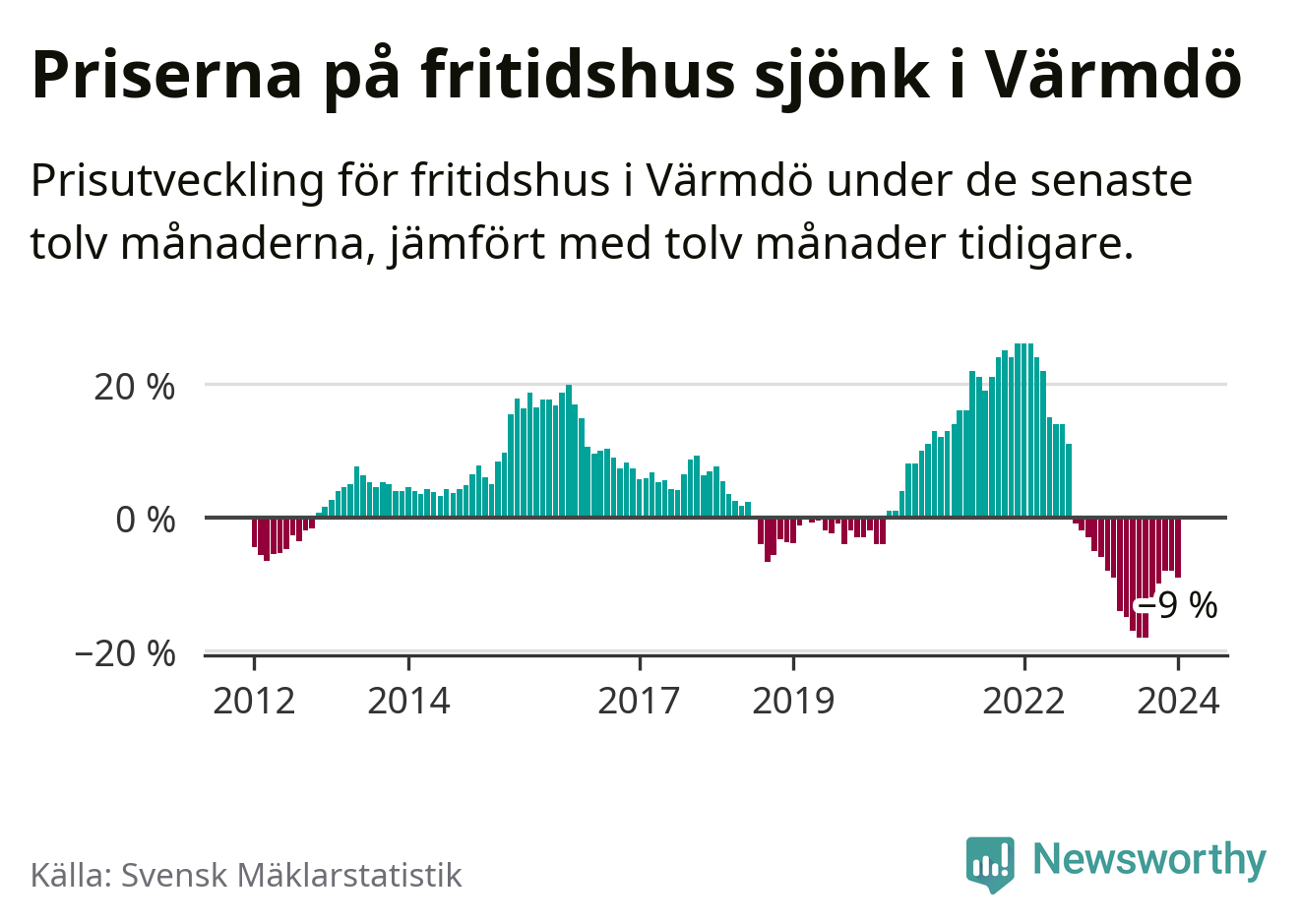 Priserna på fritidshus har gått ner i Värmdö kommun. Medelpriset på försäljningarna under de senaste tolv månaderna visar på en nedgång med 9 procent.