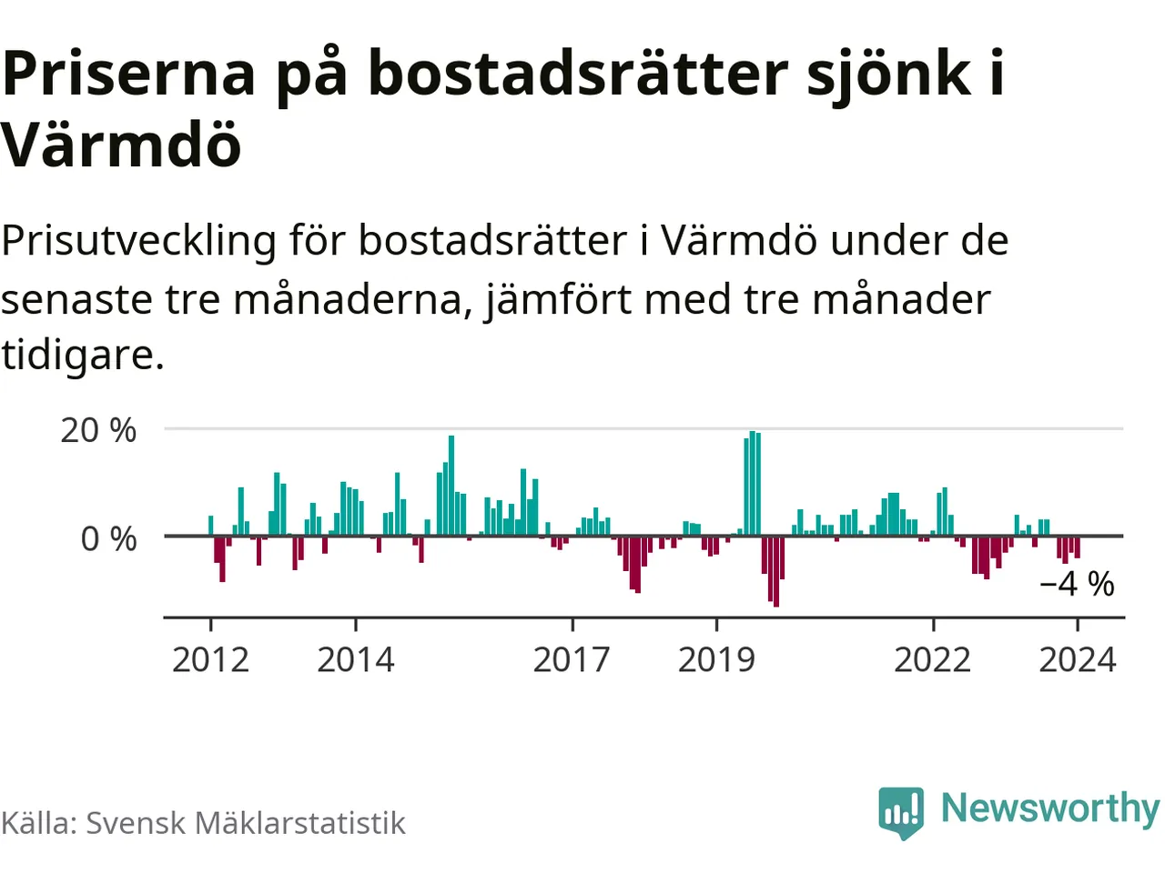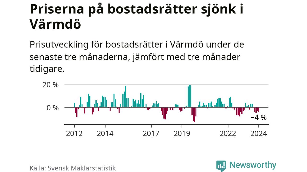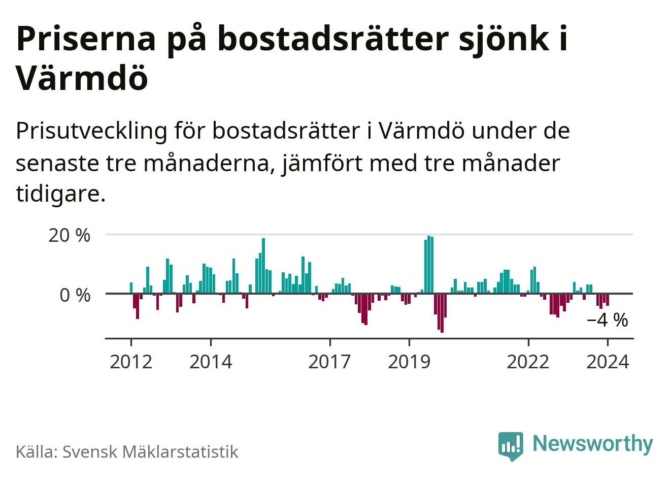 Statistiken visar även på en kännbar prisnedgång i Värmdö kommun. Medelpriset på försäljningarna av bostadsrätter i kommunen var 4 procent lägre än för tre månader sedan. Även i hela Stockholms län sjunker priserna på bostadsrätter. I hela länet noterades en prisnedgång på 2 procent.