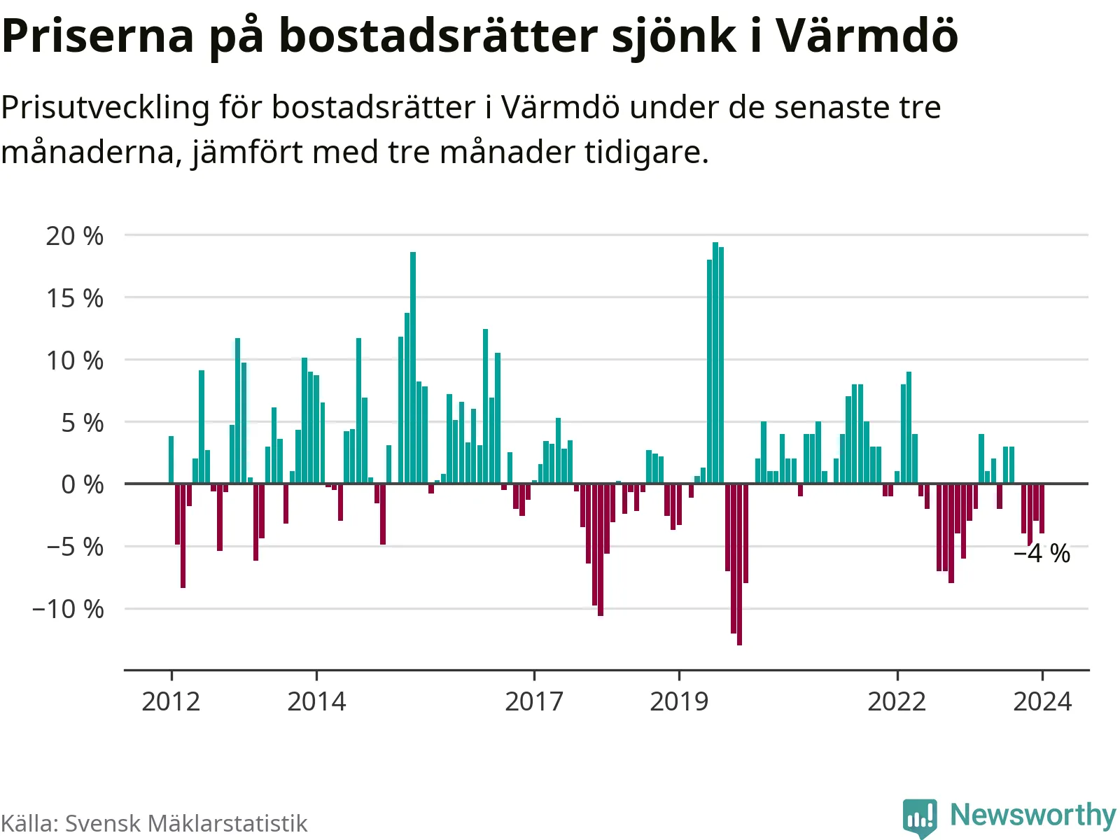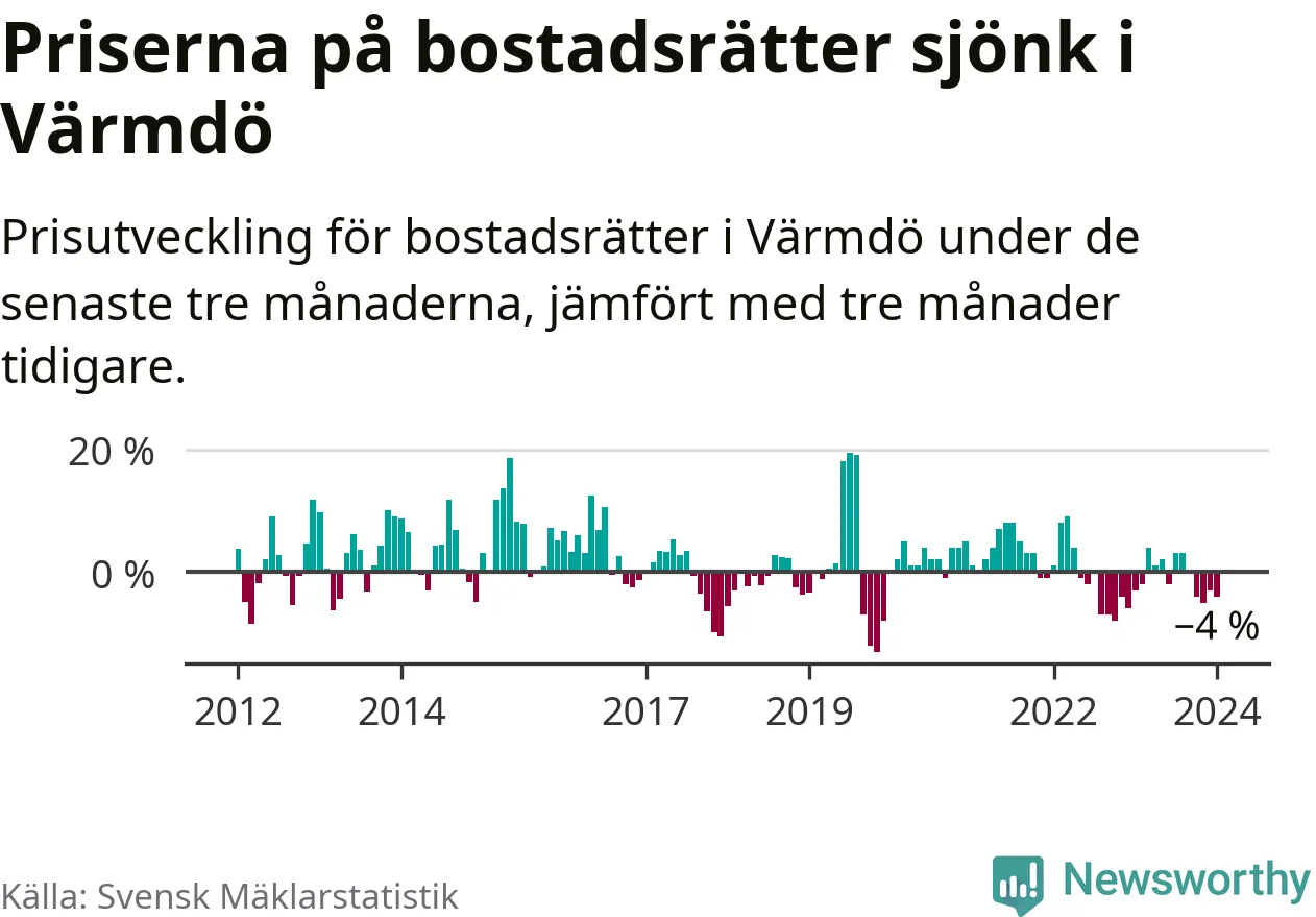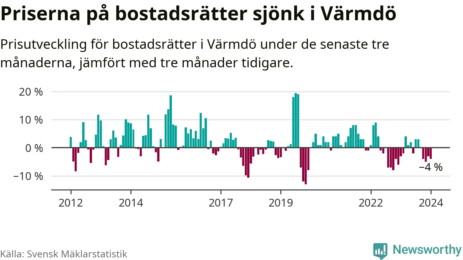 Statistiken visar även på en kännbar prisnedgång i Värmdö kommun. Medelpriset på försäljningarna av bostadsrätter i kommunen var 4 procent lägre än för tre månader sedan. Även i hela Stockholms län sjunker priserna på bostadsrätter. I hela länet noterades en prisnedgång på 2 procent.