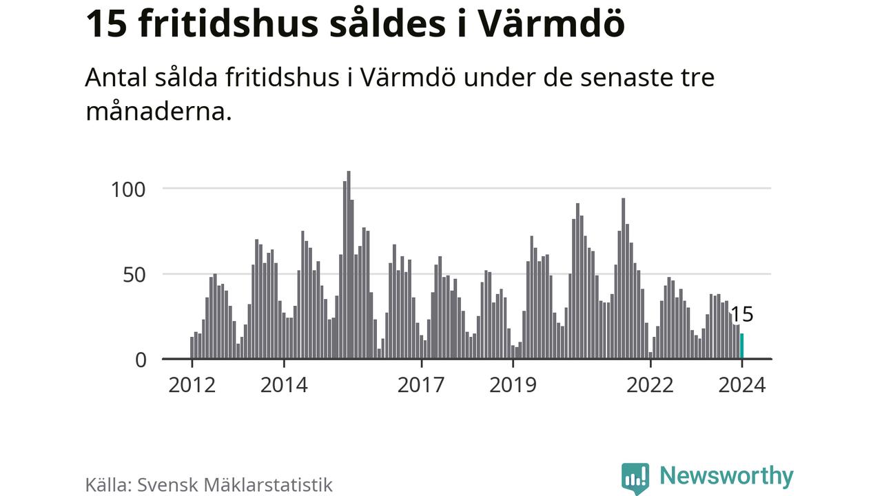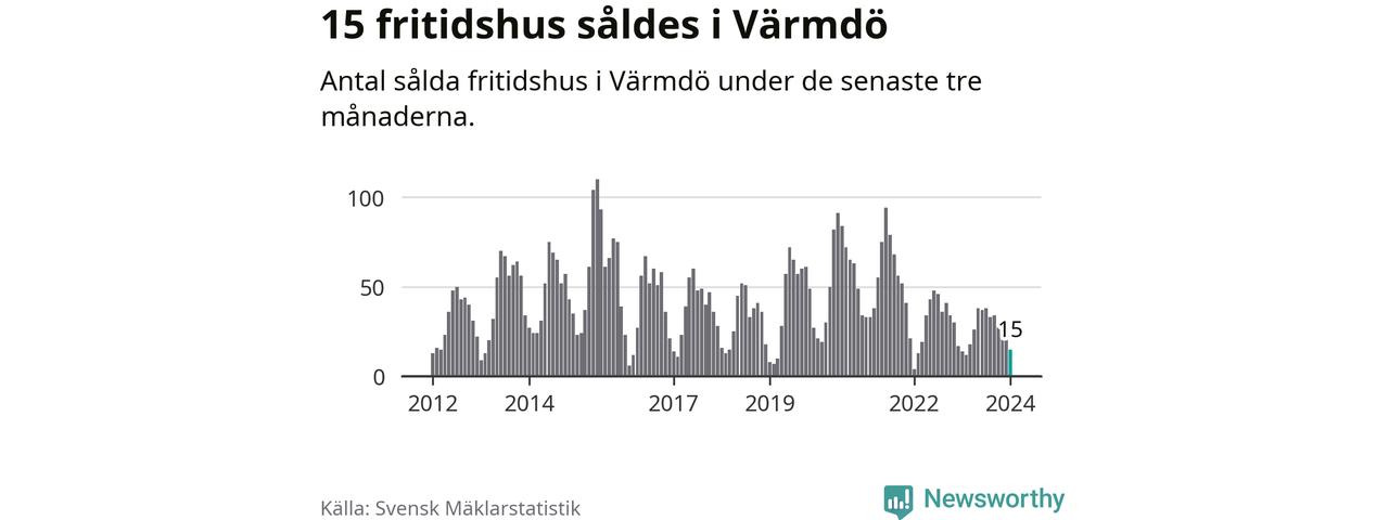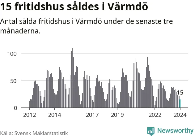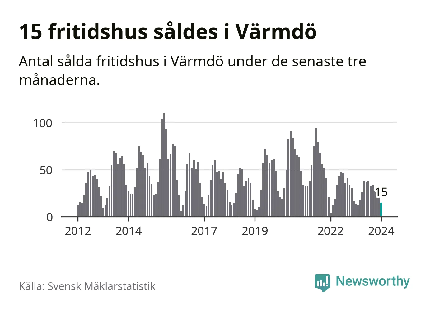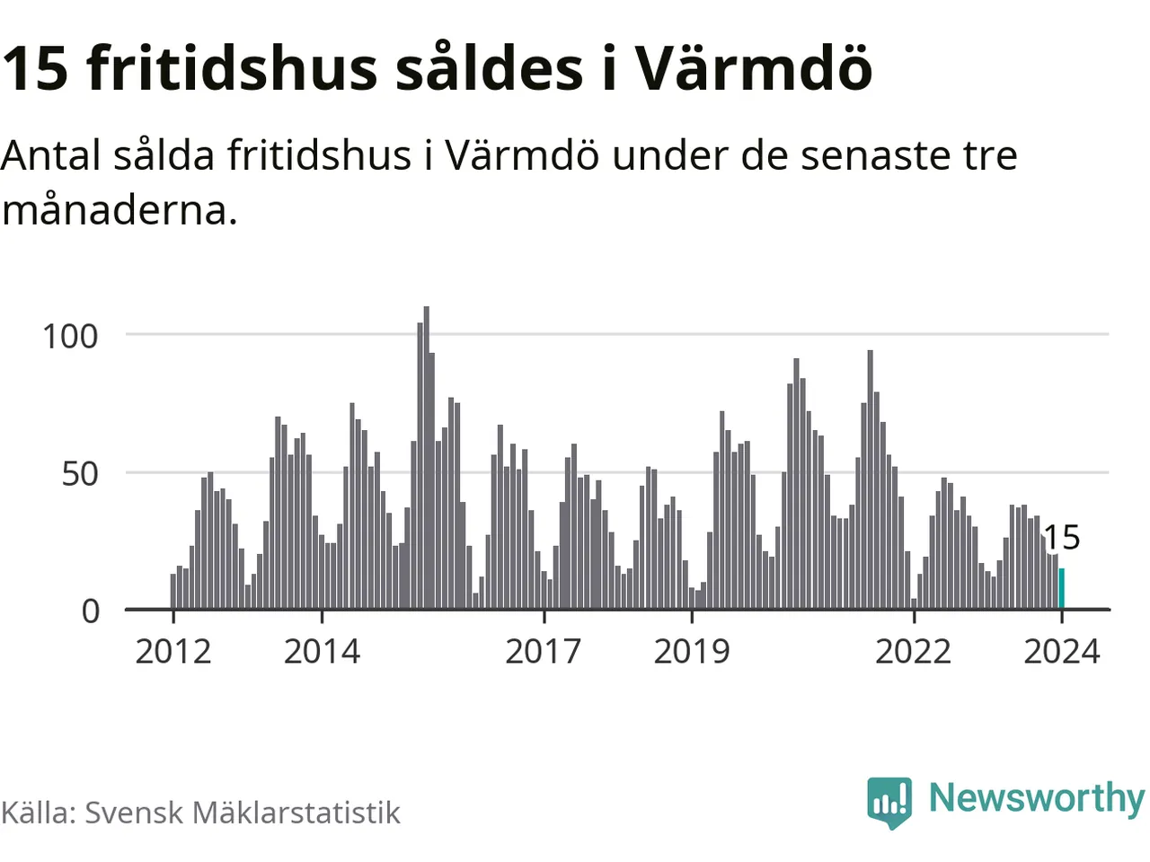 Sammanlagt såldes 15 fritidshus i Värmdö kommun mellan november 2023 och januari till ett genomsnittligt pris på 4,1 miljoner kronor. I fjol gjordes 14 affärer vid den här tiden på året.