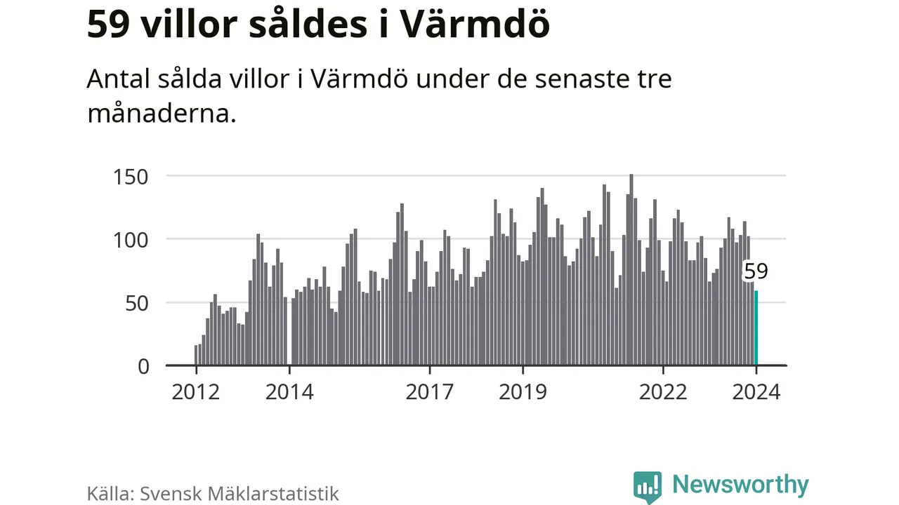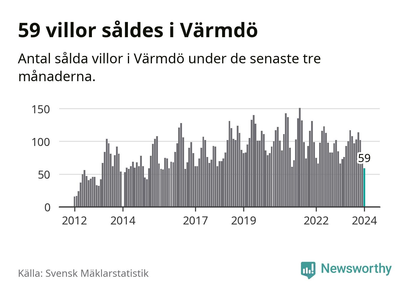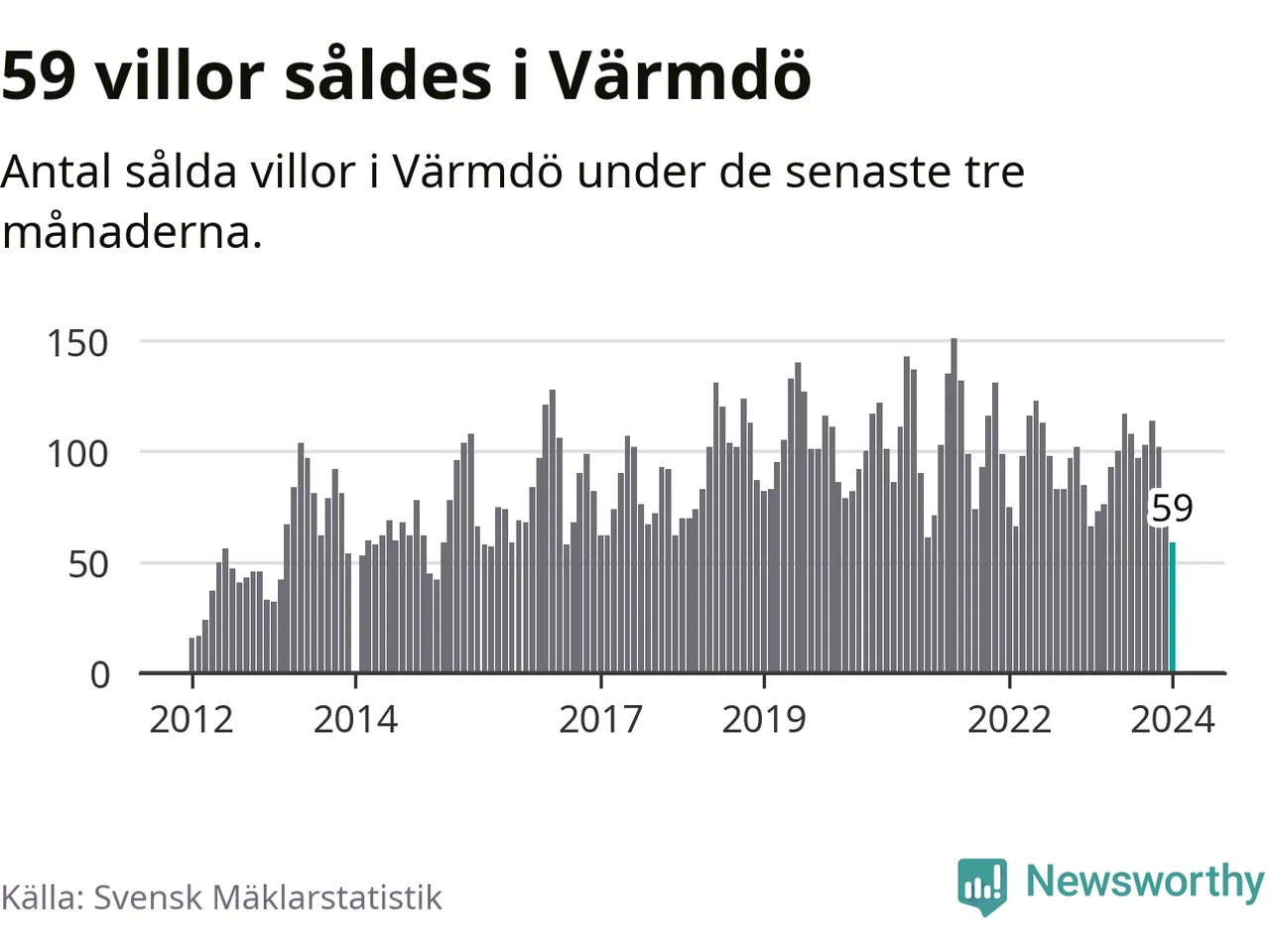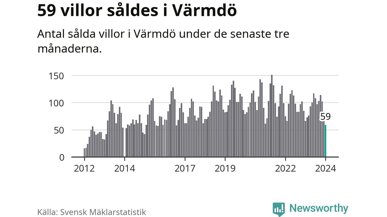 Mellan november och januari såldes 59 villor i Värmdö kommun. Det är färre än någon tremånadersperiod sedan 2016.