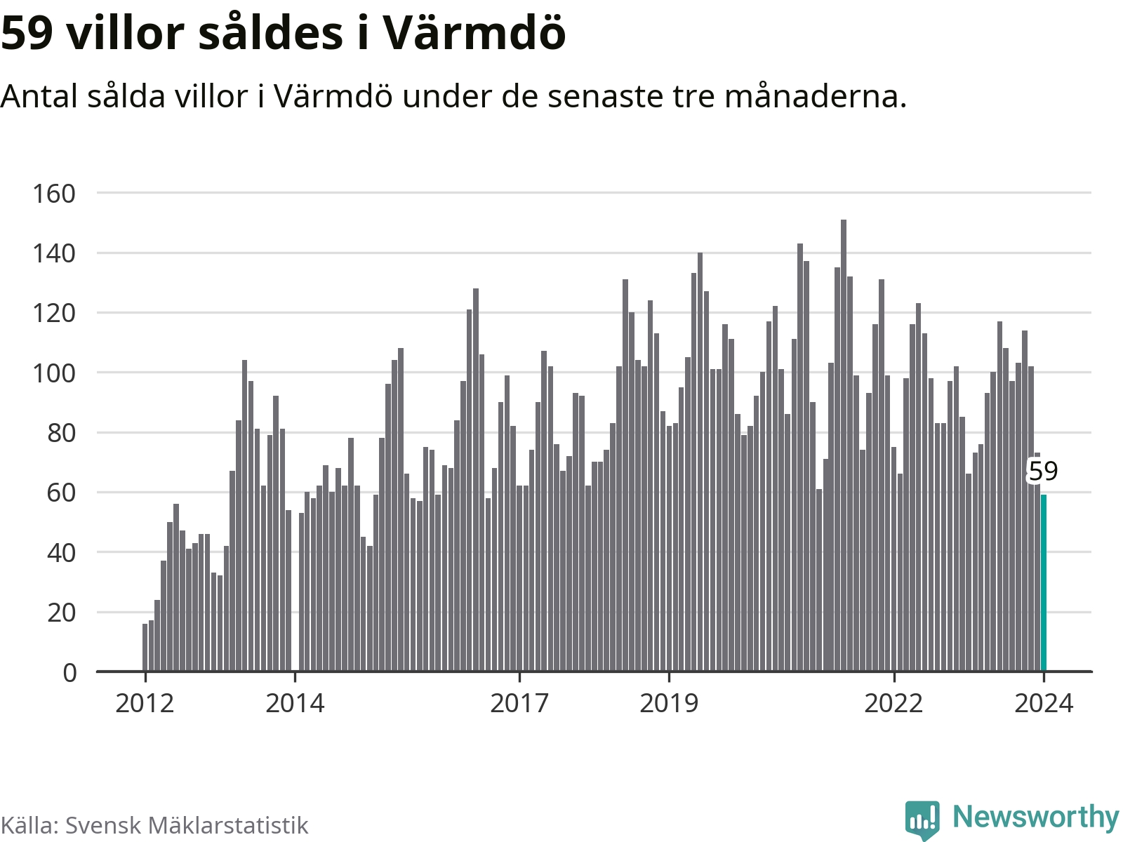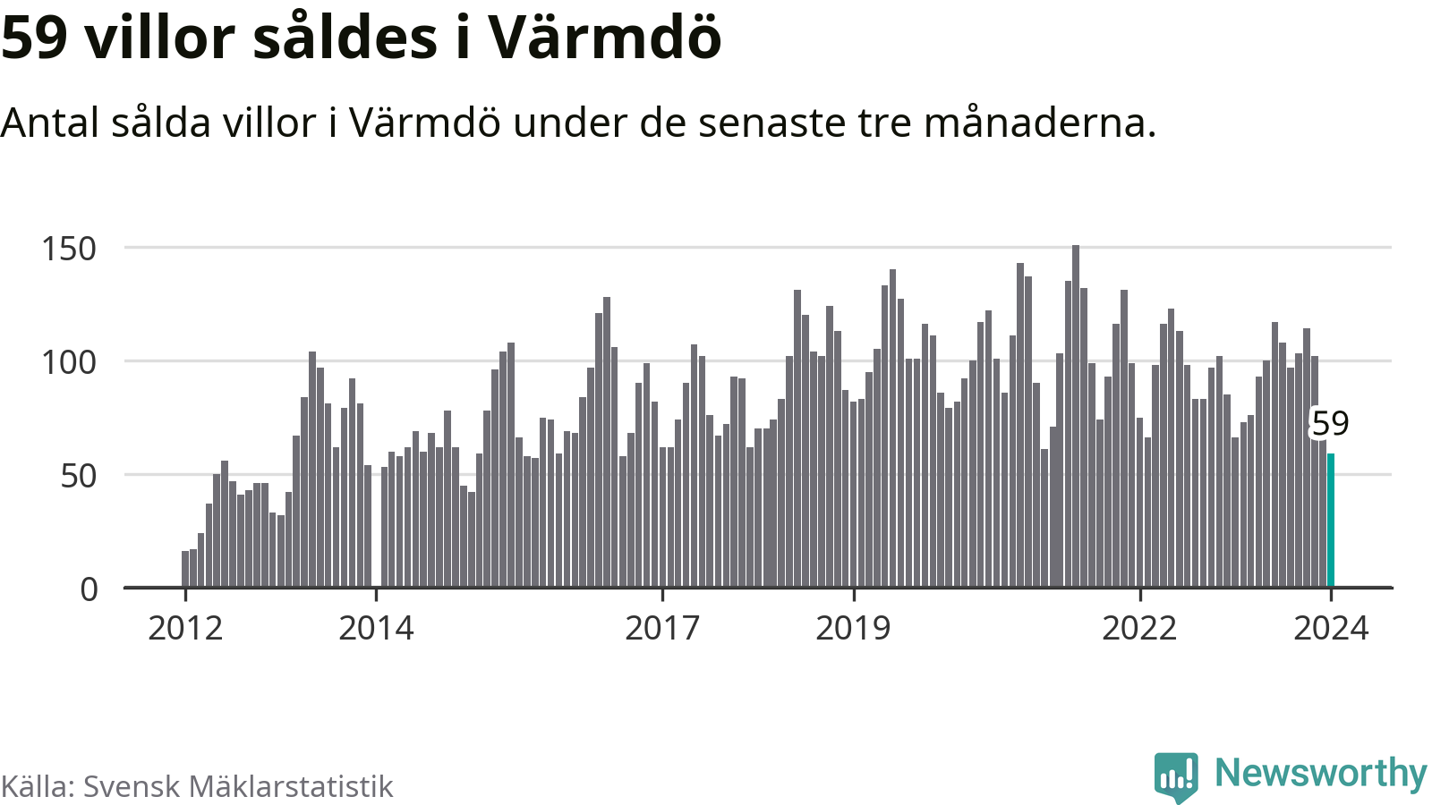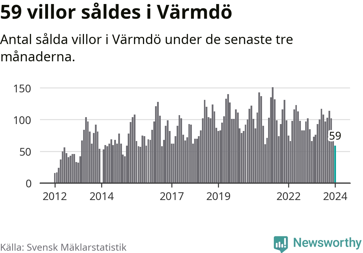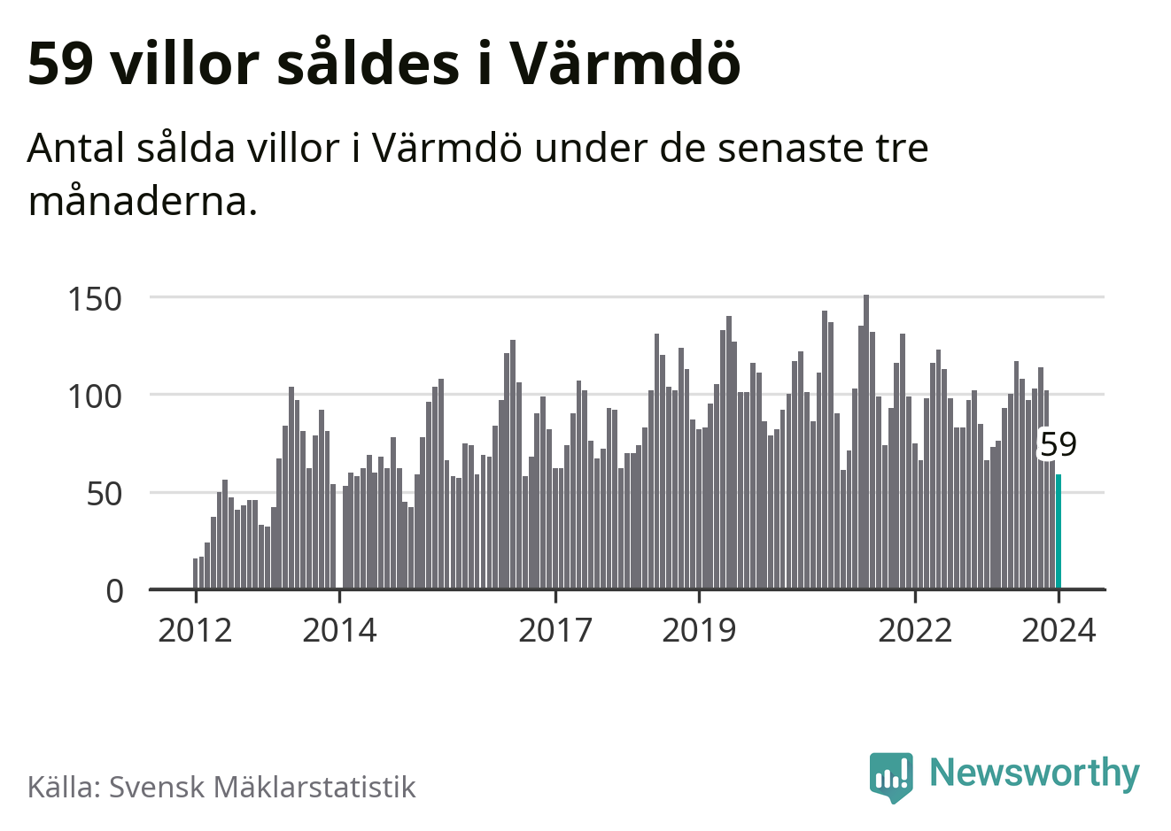 Mellan november och januari såldes 59 villor i Värmdö kommun. Det är färre än någon tremånadersperiod sedan 2016.