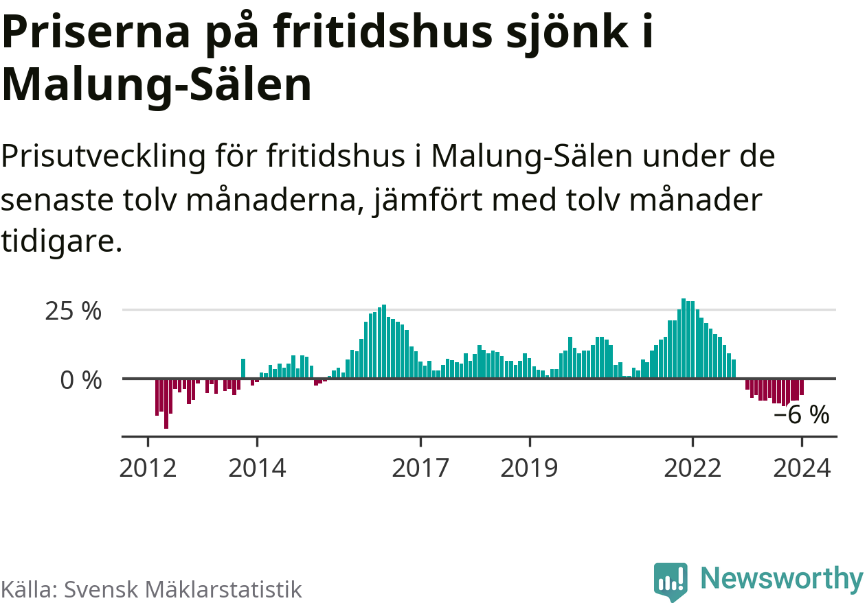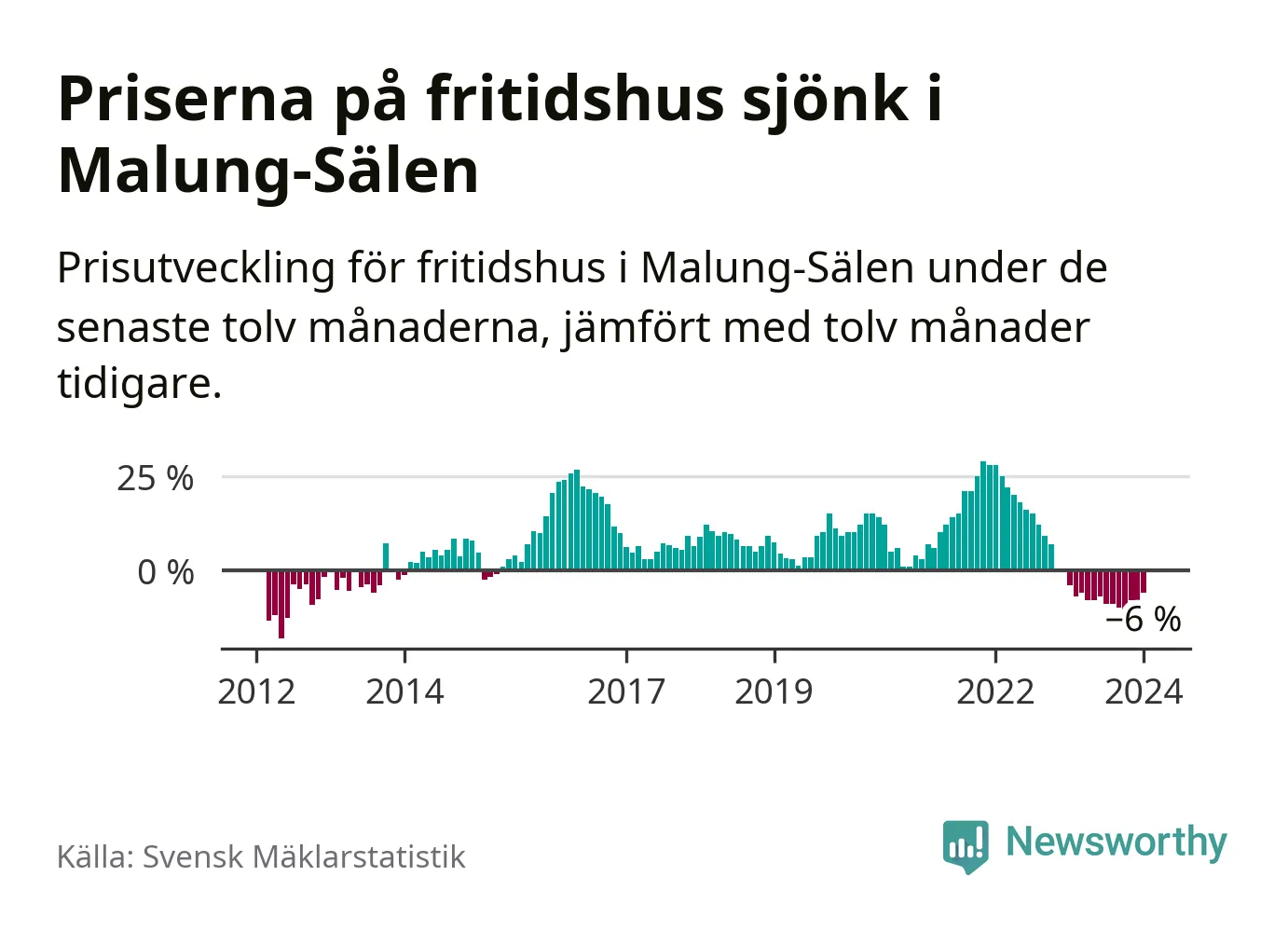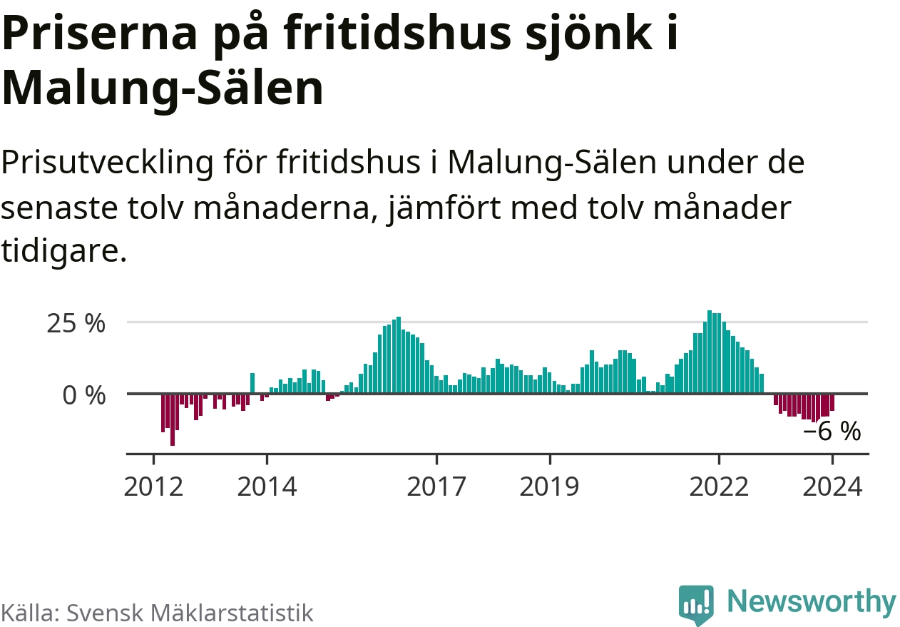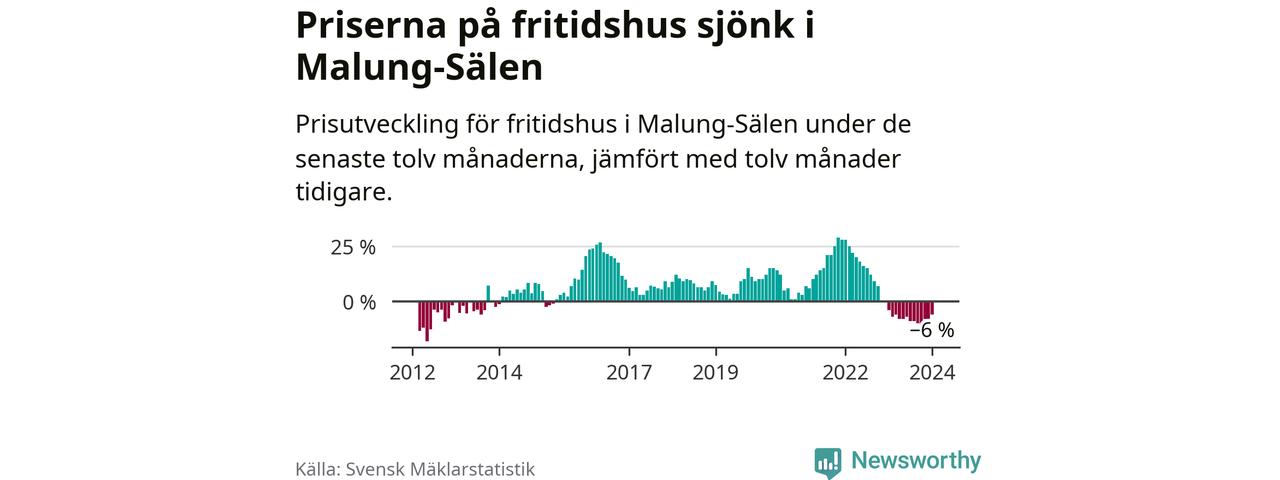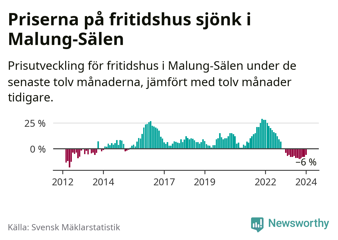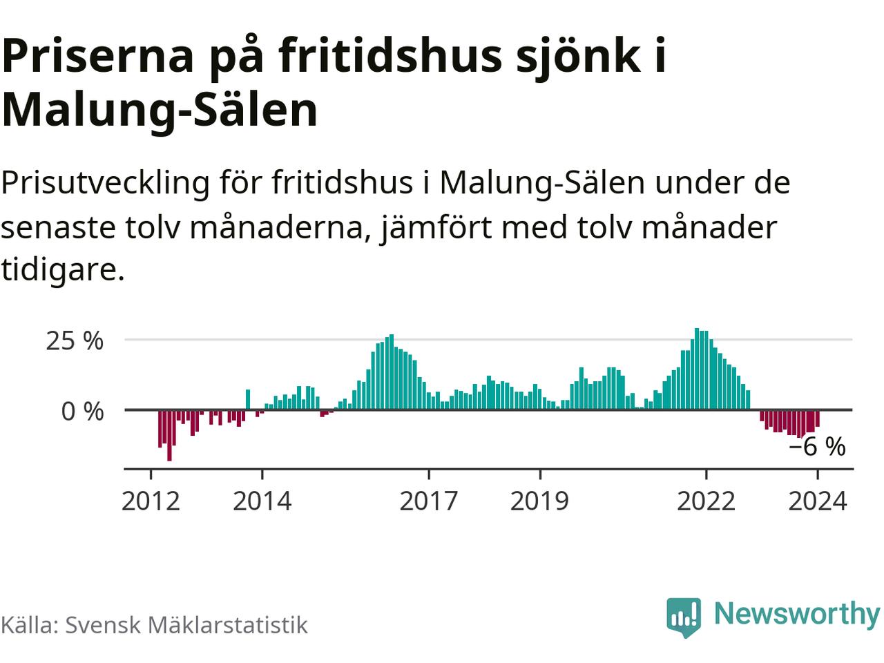 Statistiken visar även på en kännbar prisnedgång i Malung-Sälens kommun. Medelpriset på försäljningarna av fritidshus i kommunen var 6 procent lägre än för ett år sedan. Även i hela Dalarna sjunker priserna på fritidshus. I hela länet noterades en prisnedgång på 4 procent.
