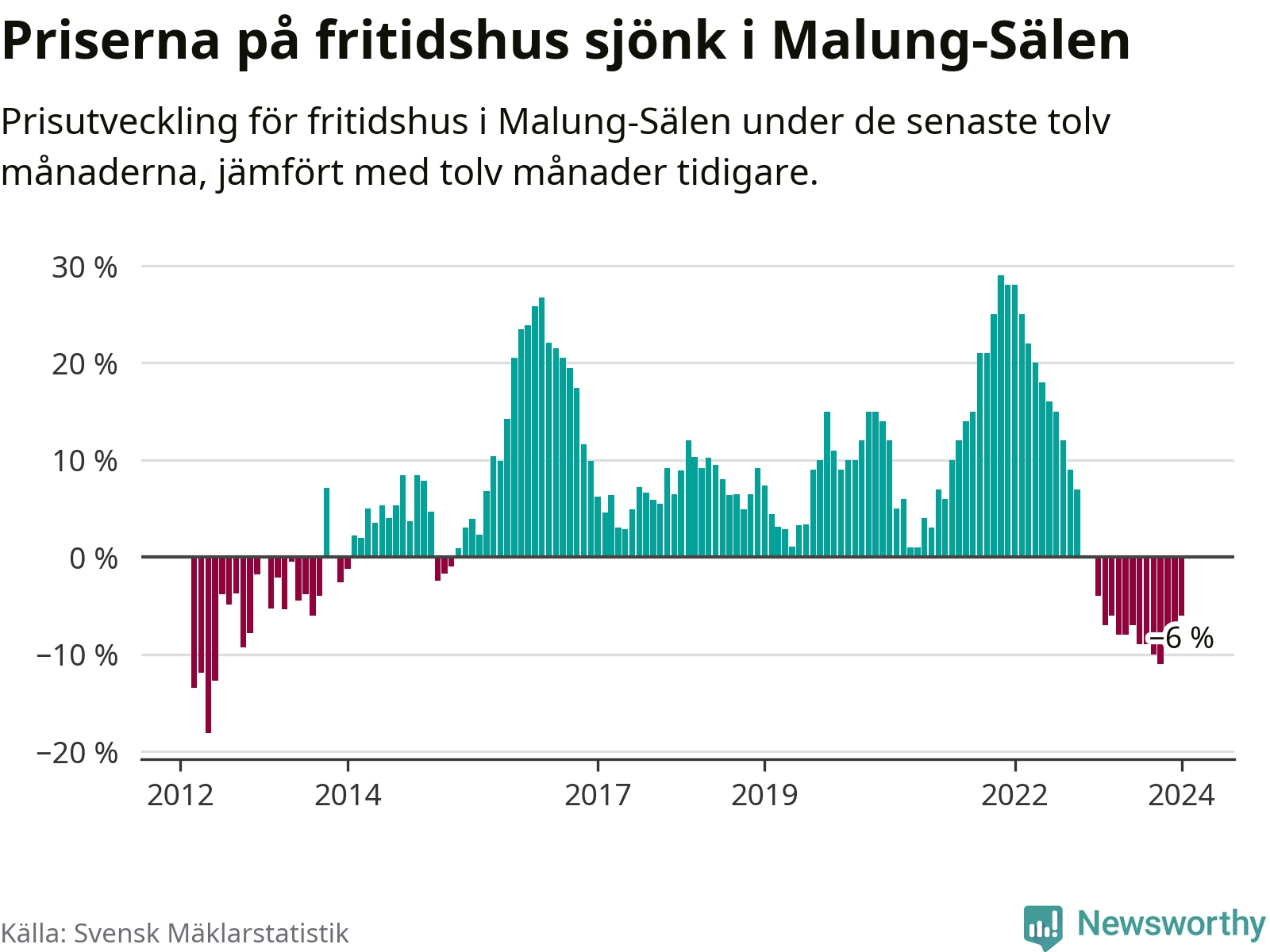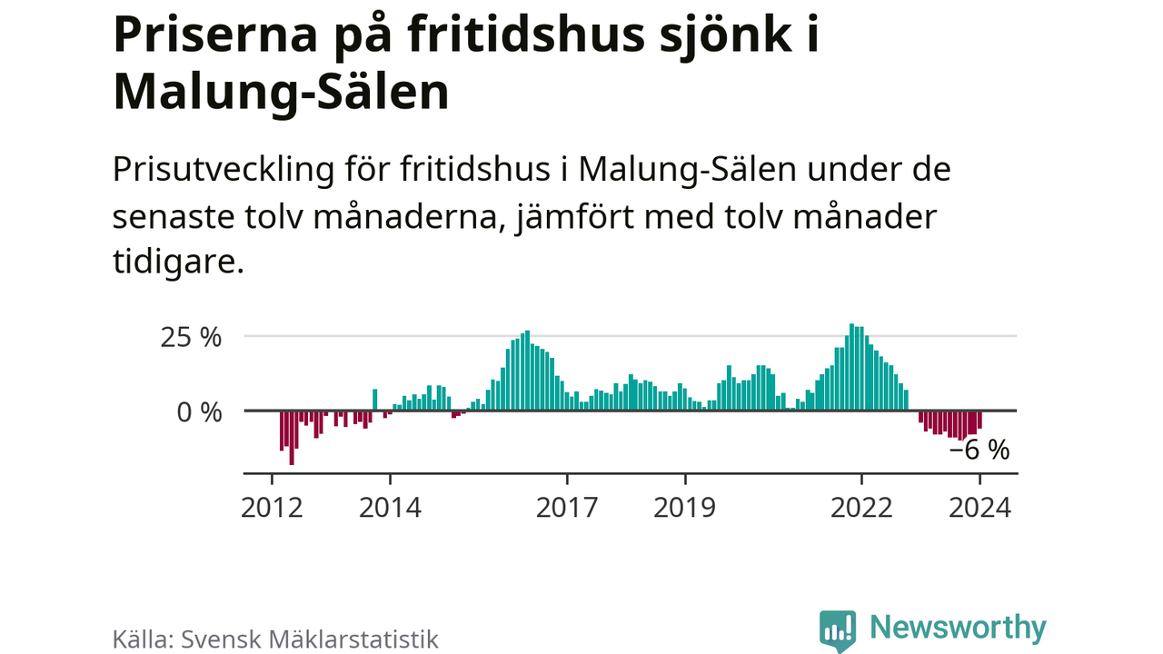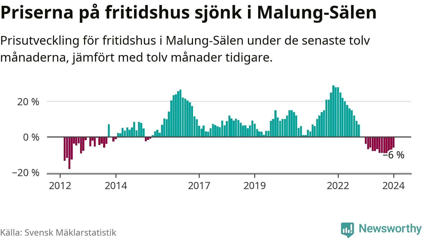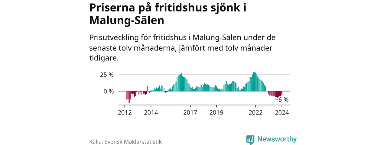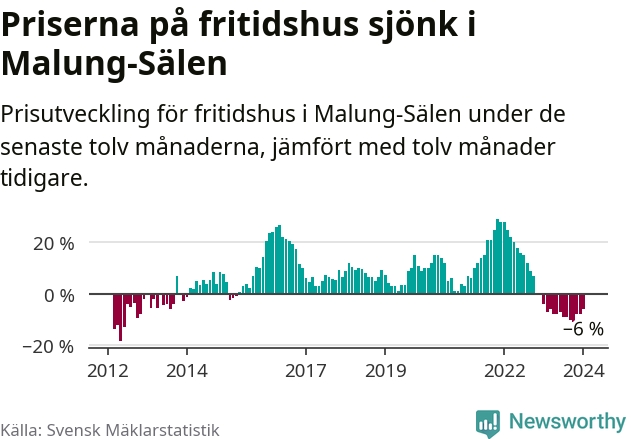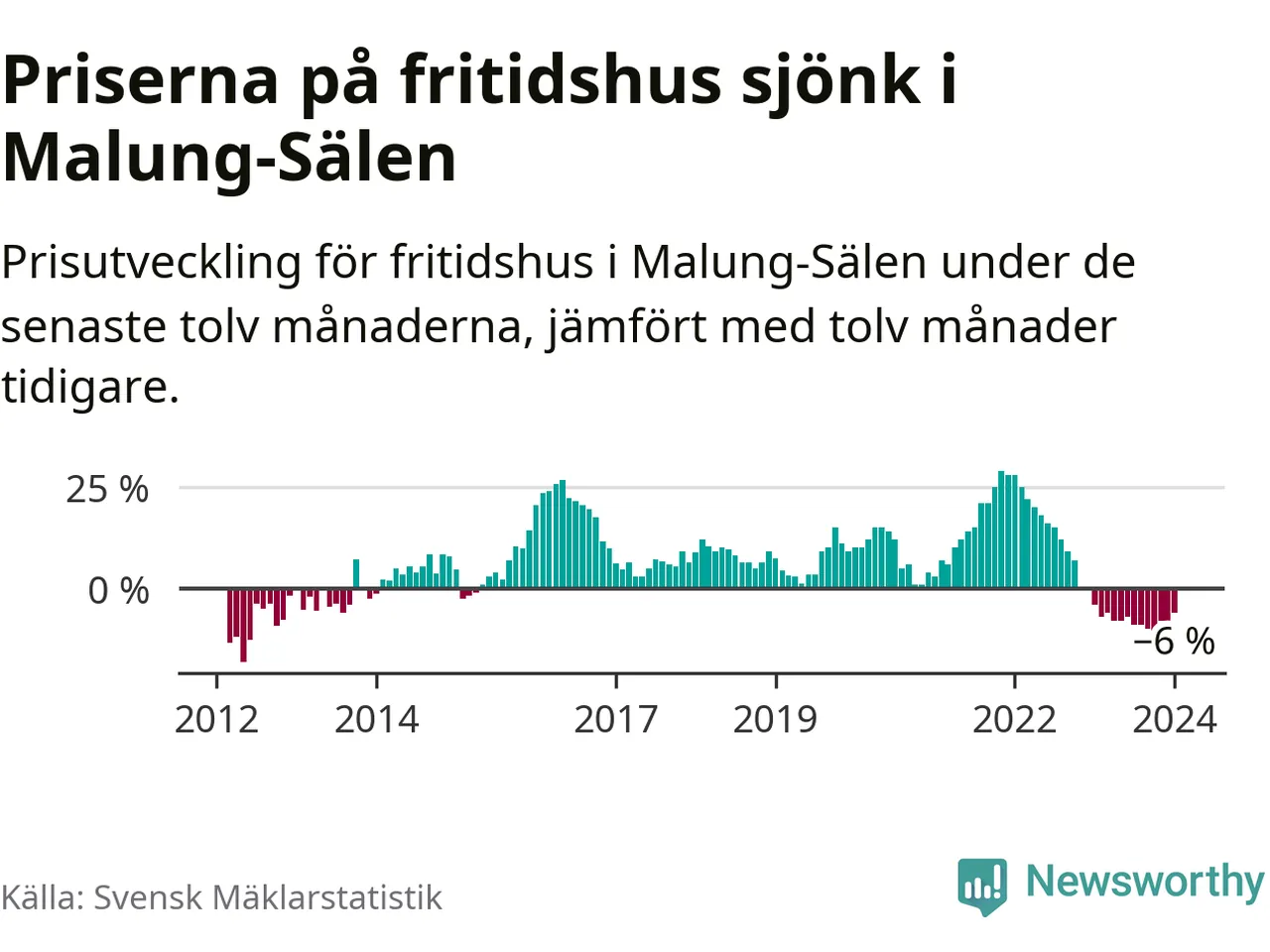 Statistiken visar även på en kännbar prisnedgång i Malung-Sälens kommun. Medelpriset på försäljningarna av fritidshus i kommunen var 6 procent lägre än för ett år sedan. Även i hela Dalarna sjunker priserna på fritidshus. I hela länet noterades en prisnedgång på 4 procent.