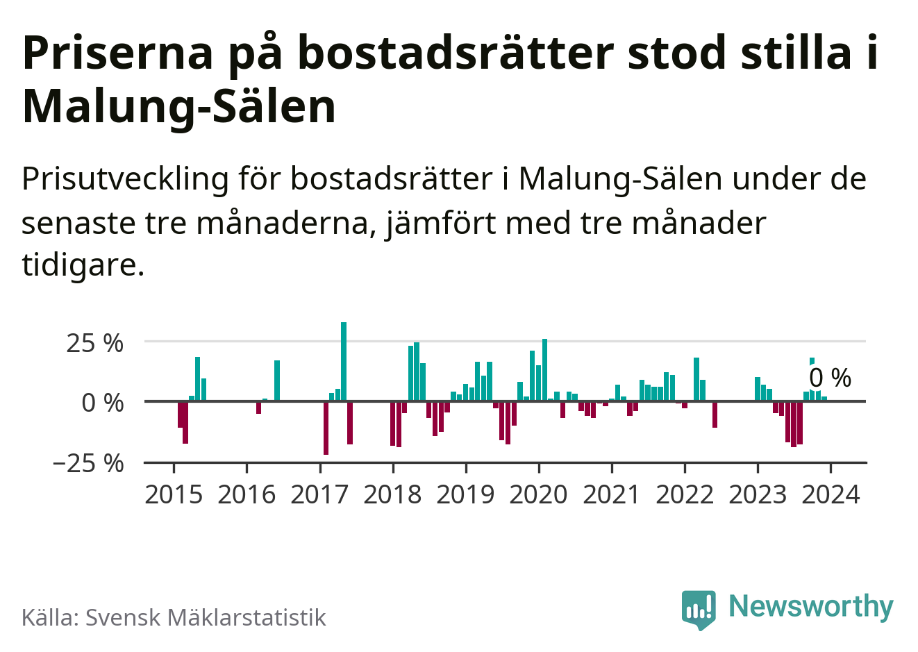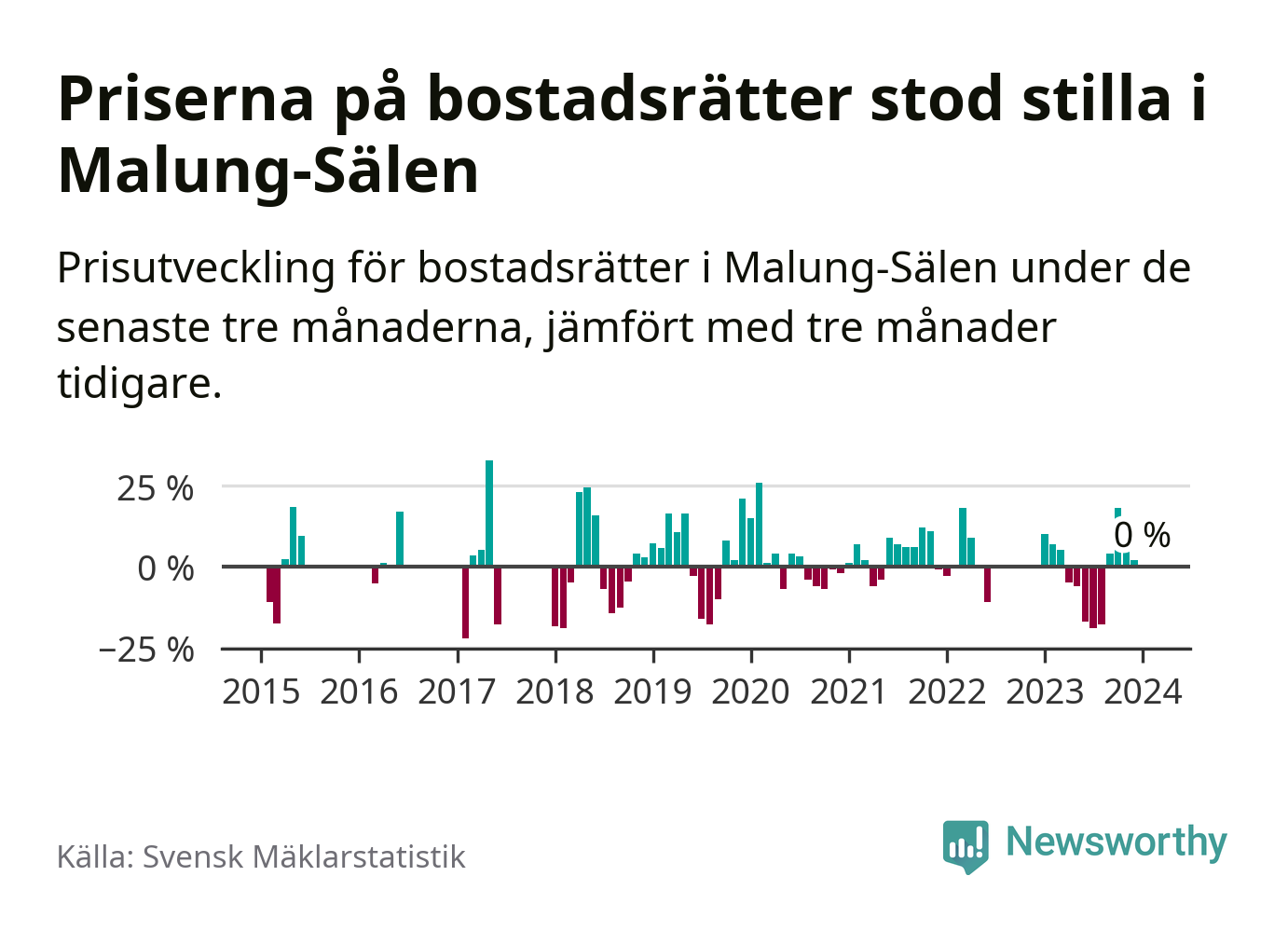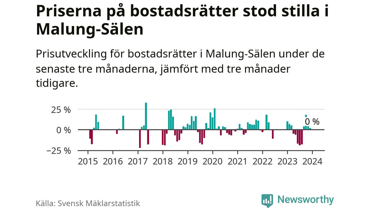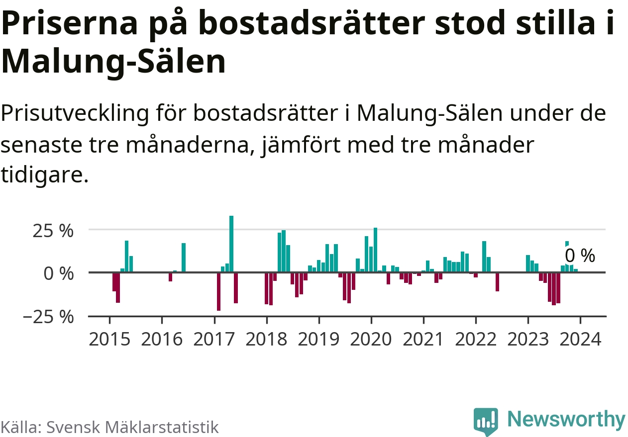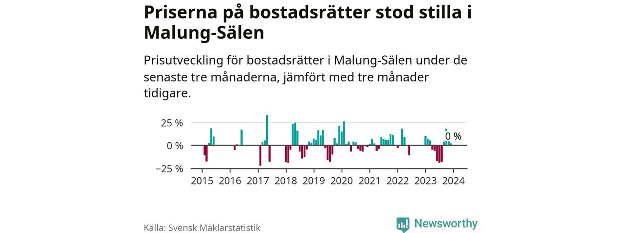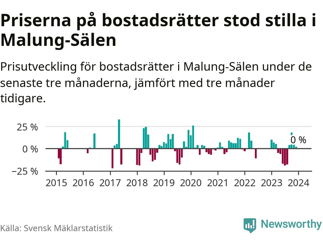 Priserna på bostadsrätter står i stort sett stilla i Malung-Sälens kommun. Medelpriset på de på försäljningarna under de senaste tre månaderna låg på samma nivå som för tre månader sedan.